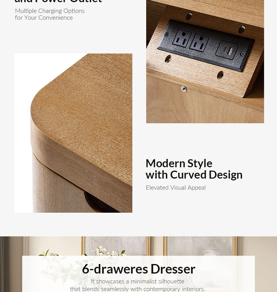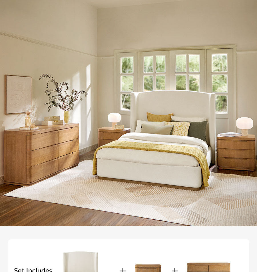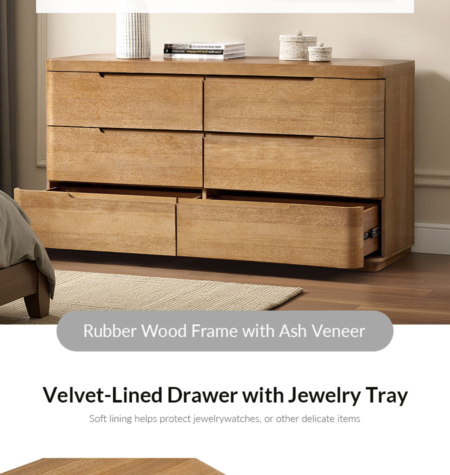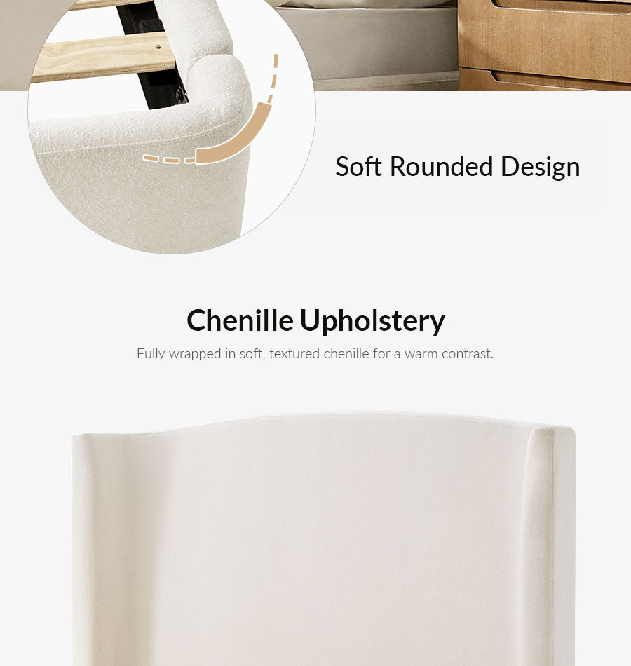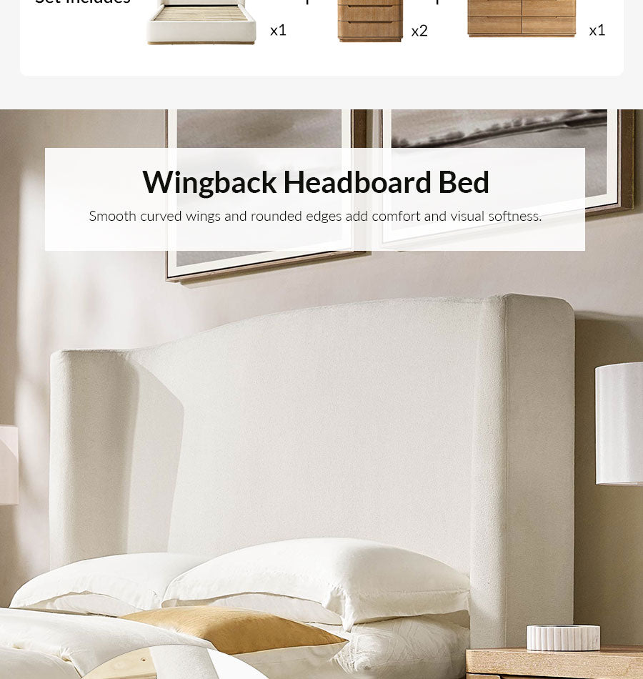 Transform your bedroom into a modern and coordinated retreat with this 4-piece furniture set, featuring an upholstered wingback bed, two functional nightstands, and a spacious dresser. The bed is wrapped in soft chenille fabric with rounded edges and a refined, solid wood base trim, creating a cozy yet contemporary focal point. Available in both King and Queen sizes, it also features a simple assembly process for effortless setup.The two nightstands blend curved lines with practical features, including a hidden storage compartment, an organized top drawer with built-in dividers, and a convenient power outlet to keep lighting and devices close at hand. Completing the ensemble, the dresser offers generous storage with a soft-lined top row of drawers—featuring a removable jewelry tray in the left drawer—paired with a rounded profile, inset wood handles, and a durable rubberwood frame with ash veneer. Both the nightstands and dresser arrive fully assembled, allowing you to enjoy a cohesive and stylish bedroom right away.