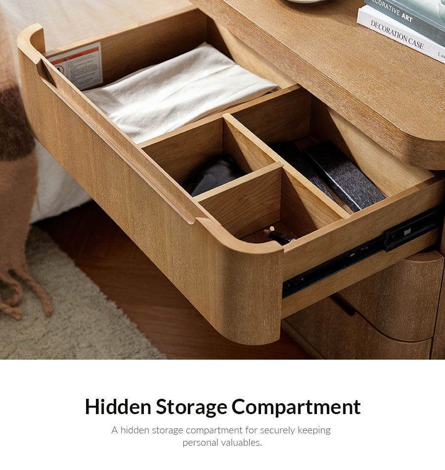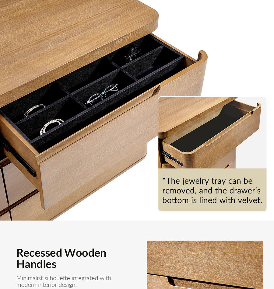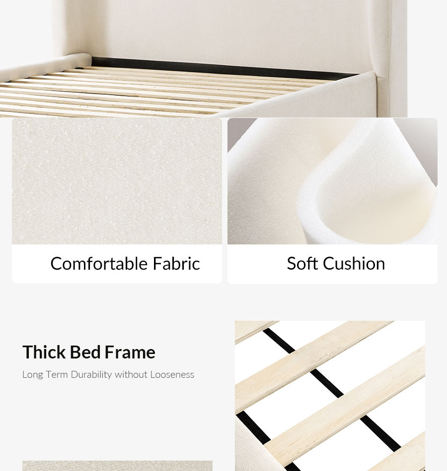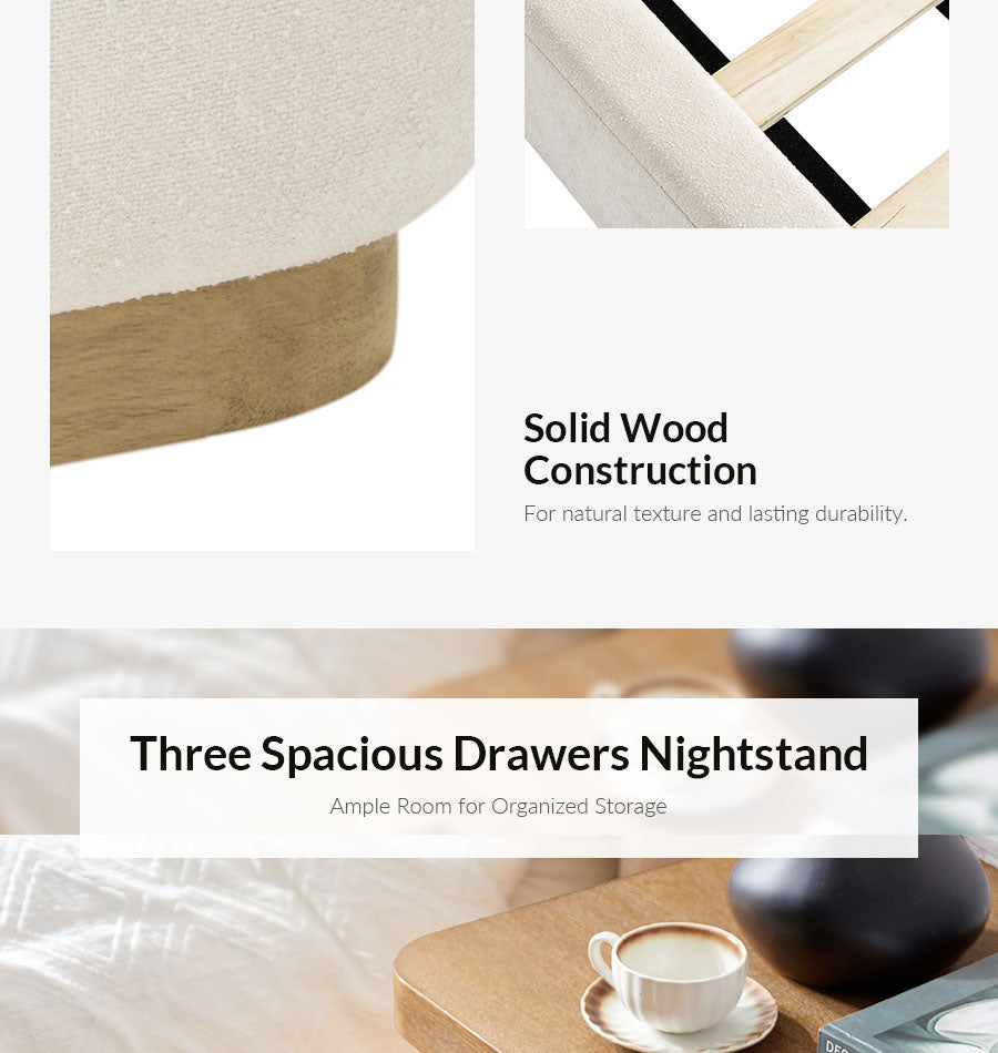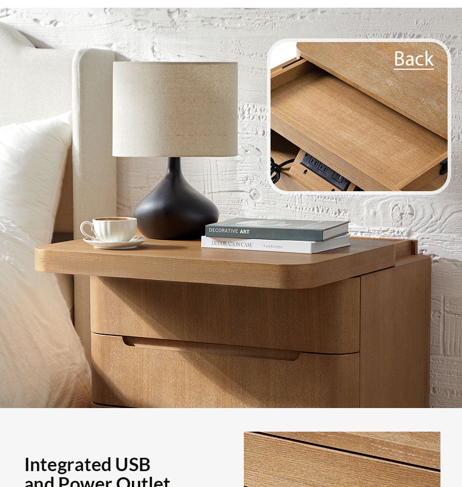 Transform your bedroom into a modern and coordinated retreat with this 4-piece furniture set, featuring an upholstered wingback bed, two functional nightstands, and a spacious dresser. The bed is wrapped in soft chenille fabric with rounded edges and a refined, solid wood base trim, creating a cozy yet contemporary focal point. Available in both King and Queen sizes, it also features a simple assembly process for effortless setup.The two nightstands blend curved lines with practical features, including a hidden storage compartment, an organized top drawer with built-in dividers, and a convenient power outlet to keep lighting and devices close at hand. Completing the ensemble, the dresser offers generous storage with a soft-lined top row of drawers—featuring a removable jewelry tray in the left drawer—paired with a rounded profile, inset wood handles, and a durable rubberwood frame with ash veneer. Both the nightstands and dresser arrive fully assembled, allowing you to enjoy a cohesive and stylish bedroom right away.