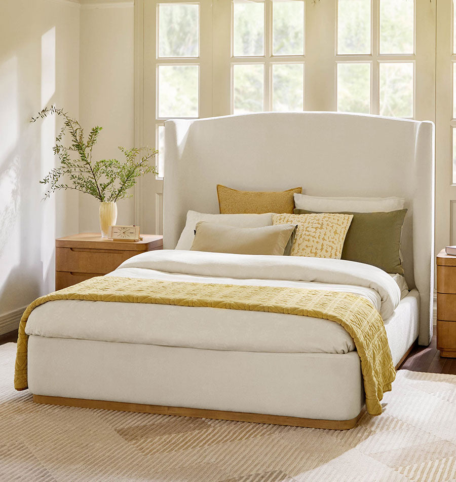 Create a calm and modern bedroom with this upholstered wingback bed, featuring soft chenille fabric and gently rounded corners for a relaxed, inviting look. The tall headboard showcases a subtle wingback silhouette that provides a cozy sense of enclosure while adding a refined design detail. The fully upholstered frame sits on a warm solid-wood base, bringing natural texture and stability to the piece. Available in both King and Queen sizes, this bed fits a variety of room layouts and sleeping needs. Simple assembly ensures an easy setup so you can enjoy your new bedroom centerpiece in no time.