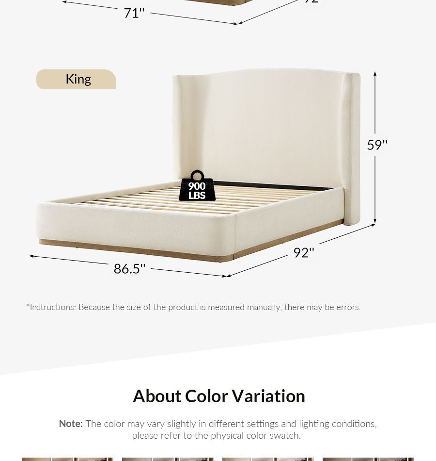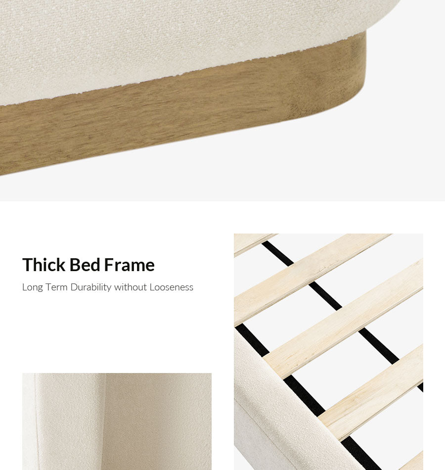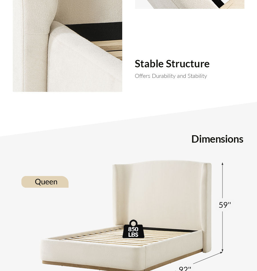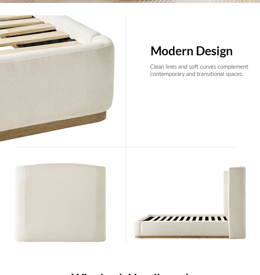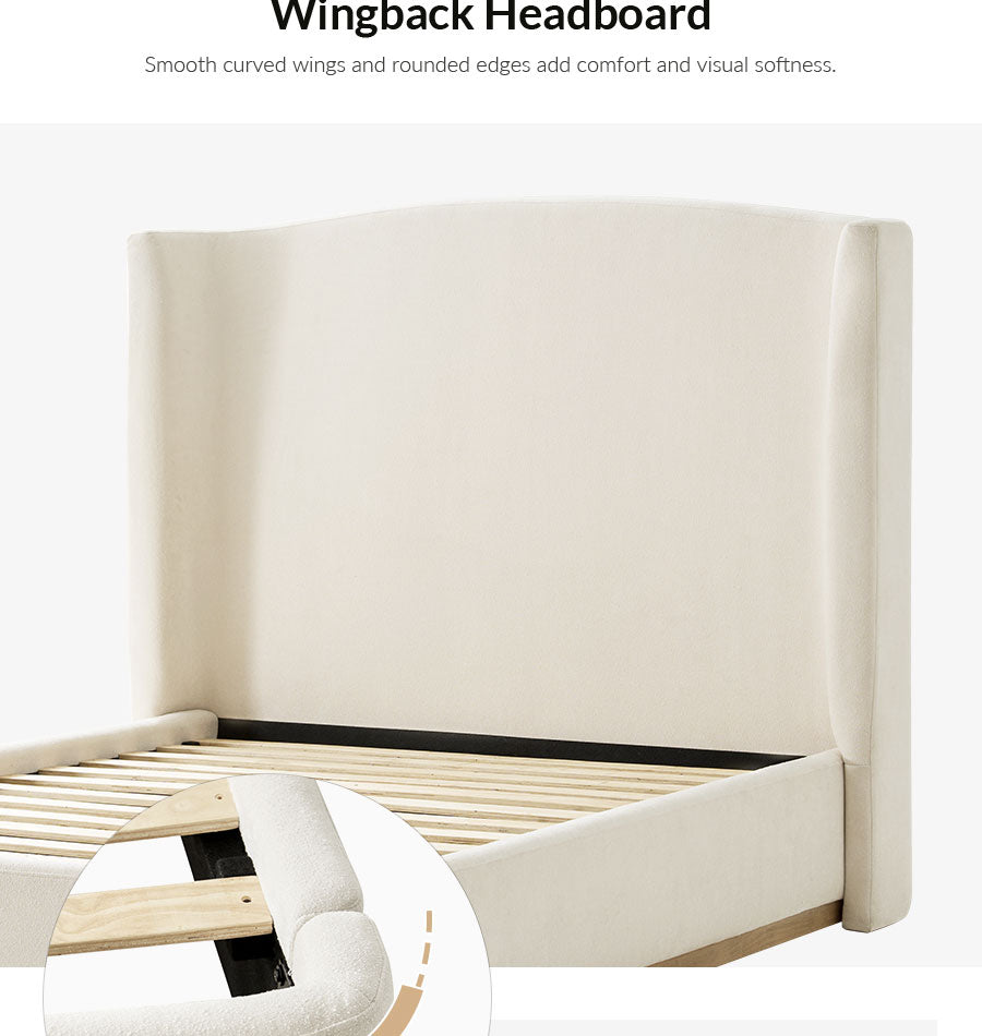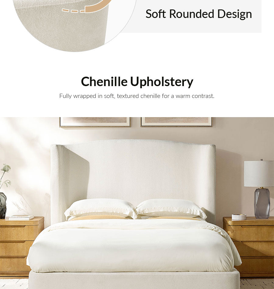 -Product Includes: one bed, assembly is required. -Modern Design: Clean lines and soft curves complement contemporary and transitional spaces. -Wingback Headboard: Smooth curved wings and rounded edges add comfort and visual softness. -Chenille Upholstery: Fully wrapped in soft, textured chenille with a solid-wood base for a warm contrast. -Size Options: Available in King and Queen to suit different room sizes. -Easy Assembly: Straightforward setup with all parts and hardware included.