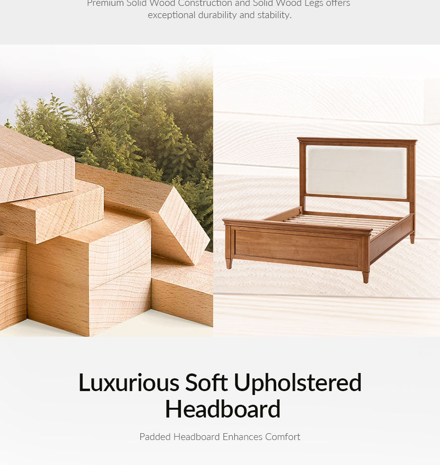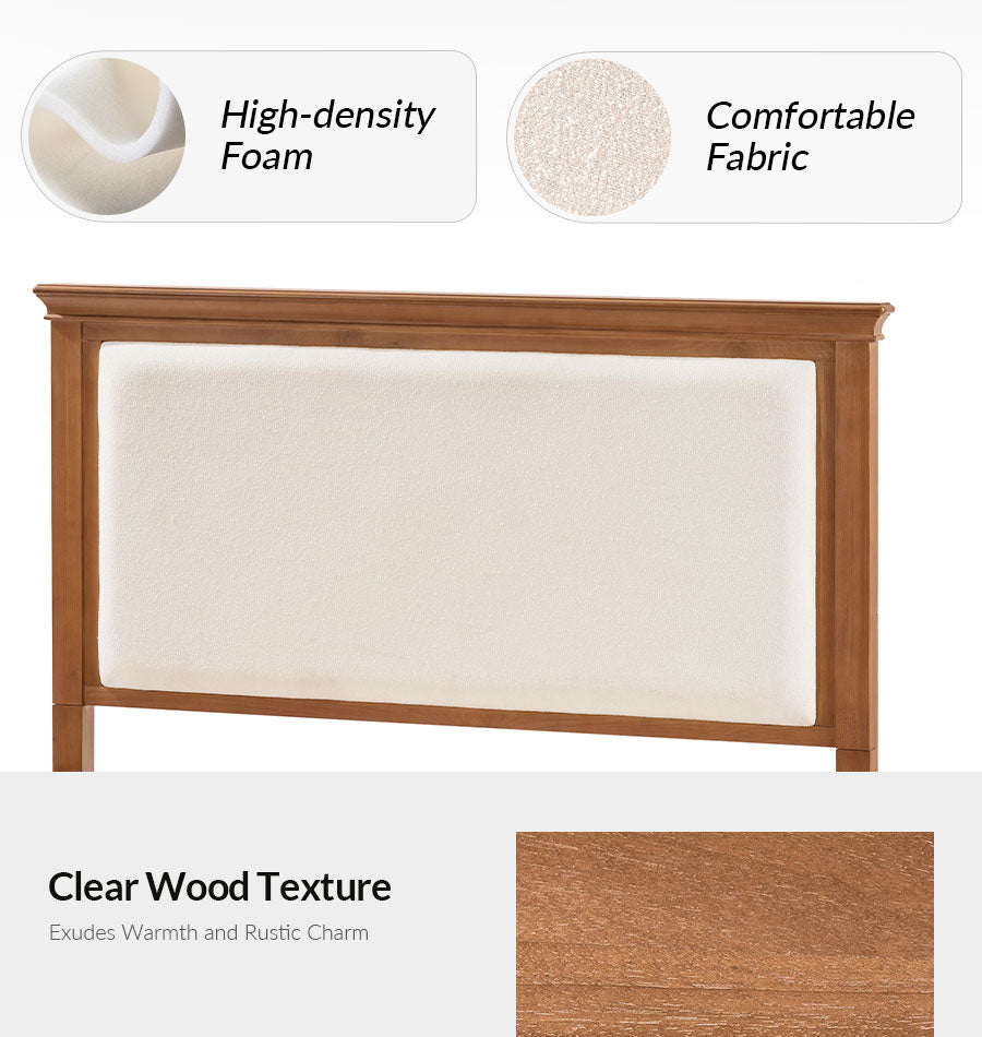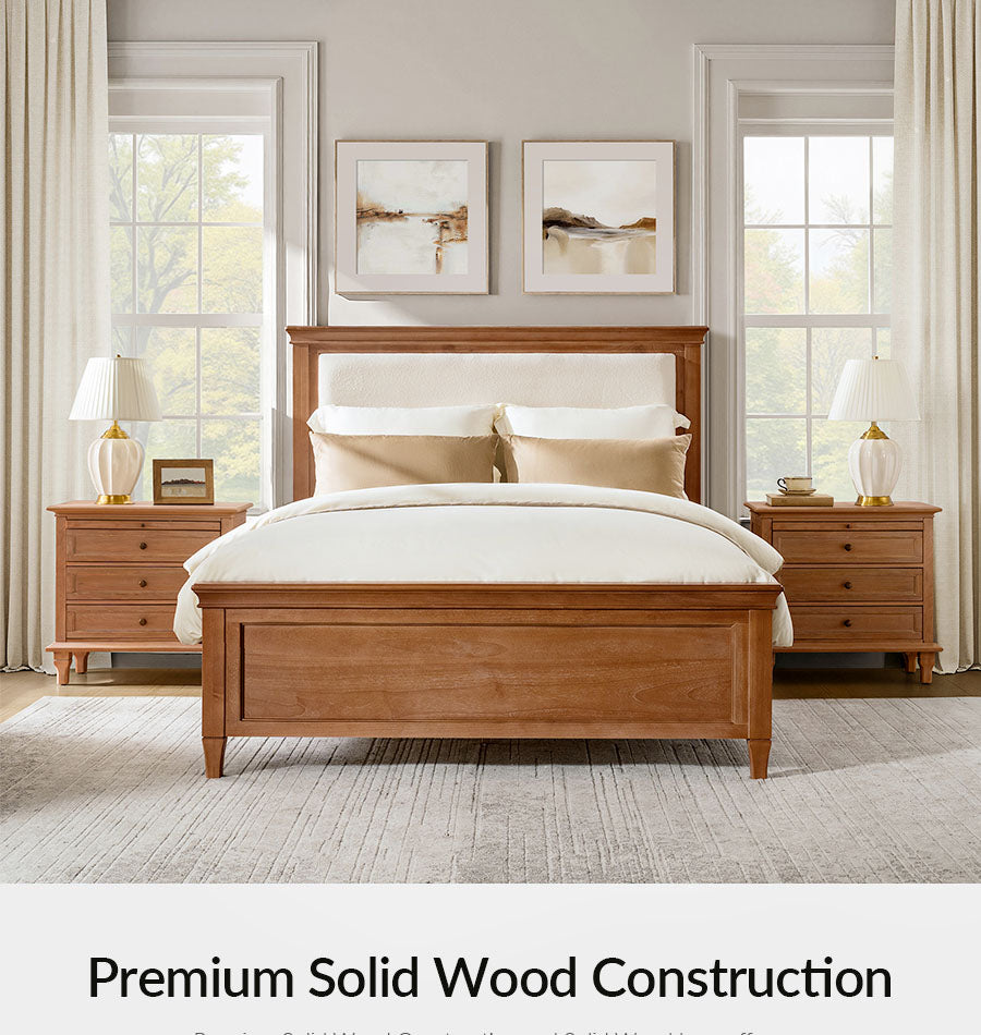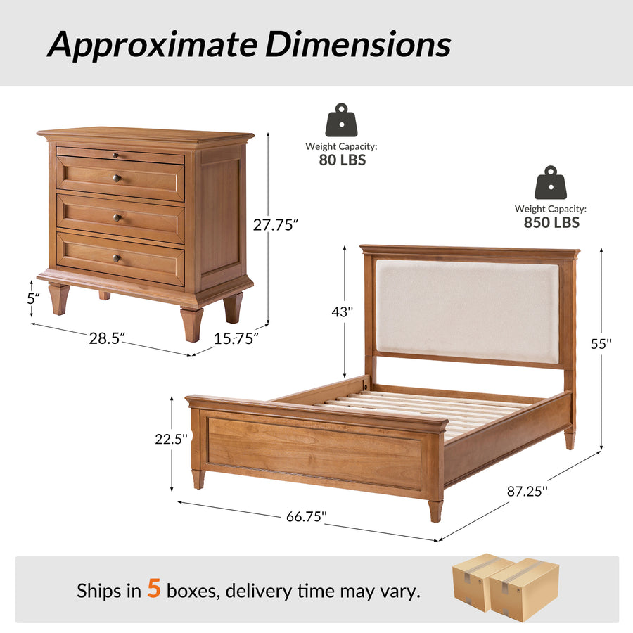 Bring a warm, elegant touch to your bedroom with this thoughtfully designed 3-piece transitional set, featuring one bed and two nightstands. The bed showcases a solid wood frame and legs, complemented by a softly upholstered headboard that adds both comfort and a tailored look. The two coordinating nightstands enhance both form and function—crafted in a timeless traditional style with farmhouse appeal, each features a convenient pull-out tray and a built-in charging station to keep your essentials close and your devices powered. Finished with sturdy wood legs and fine detailing, this set offers lasting quality, modern convenience, and versatile style all in one.
