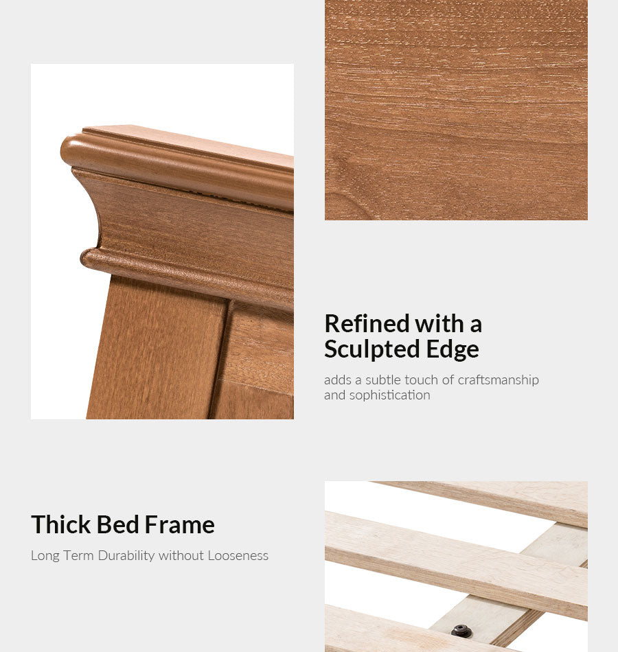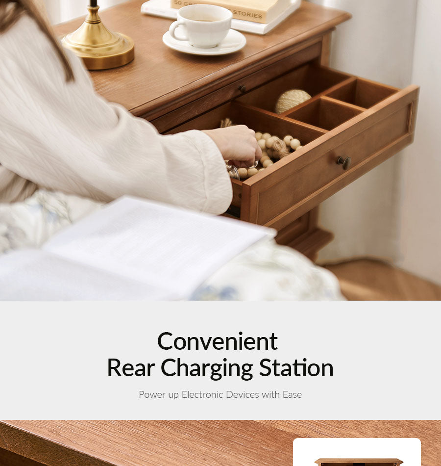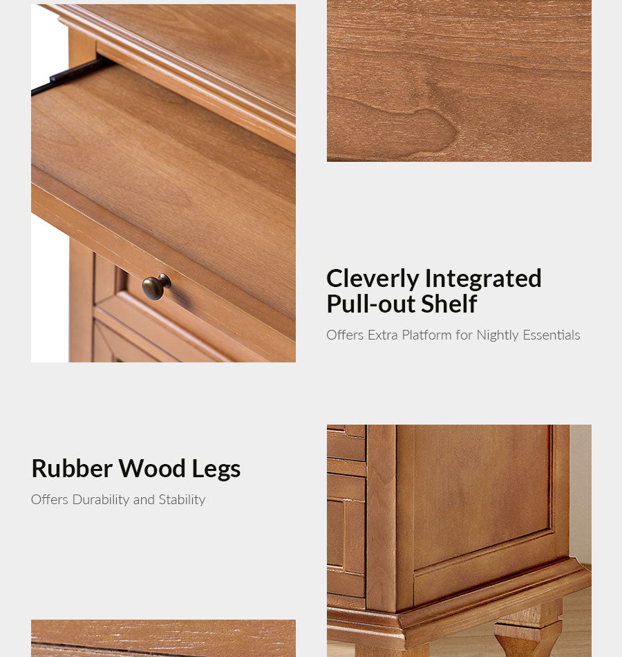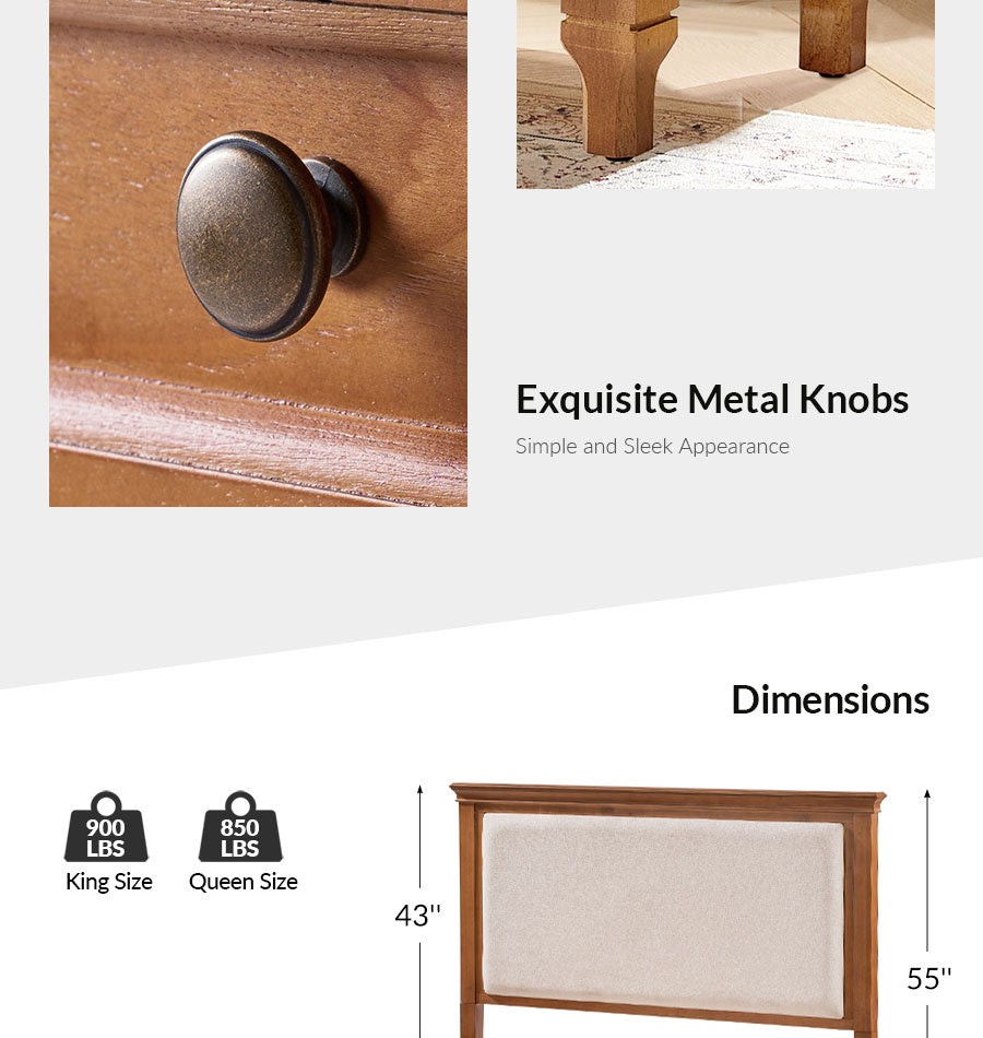 Bring a warm, elegant touch to your bedroom with this thoughtfully designed 3-piece transitional set, featuring one bed and two nightstands. The bed showcases a solid wood frame and legs, complemented by a softly upholstered headboard that adds both comfort and a tailored look. The two coordinating nightstands enhance both form and function—crafted in a timeless traditional style with farmhouse appeal, each features a convenient pull-out tray and a built-in charging station to keep your essentials close and your devices powered. Finished with sturdy wood legs and fine detailing, this set offers lasting quality, modern convenience, and versatile style all in one.