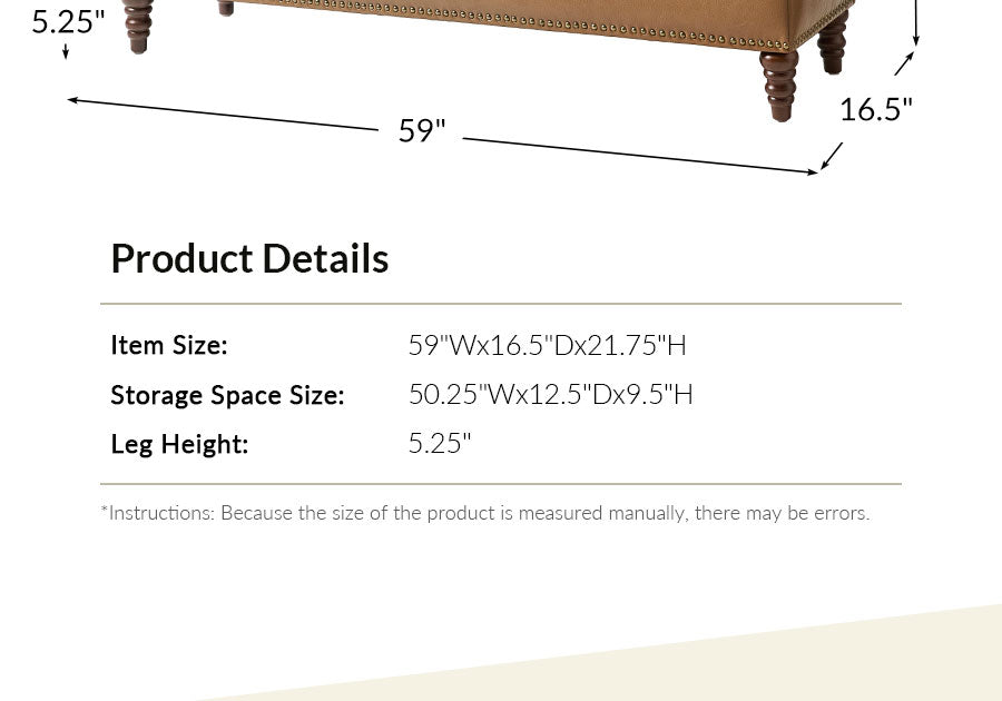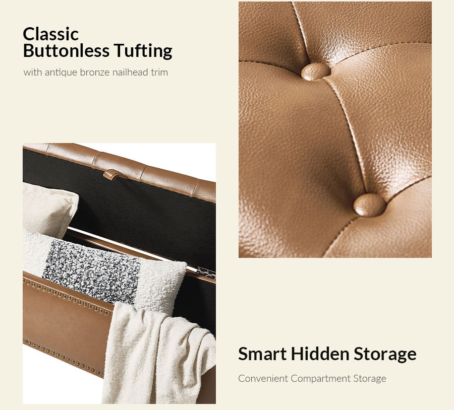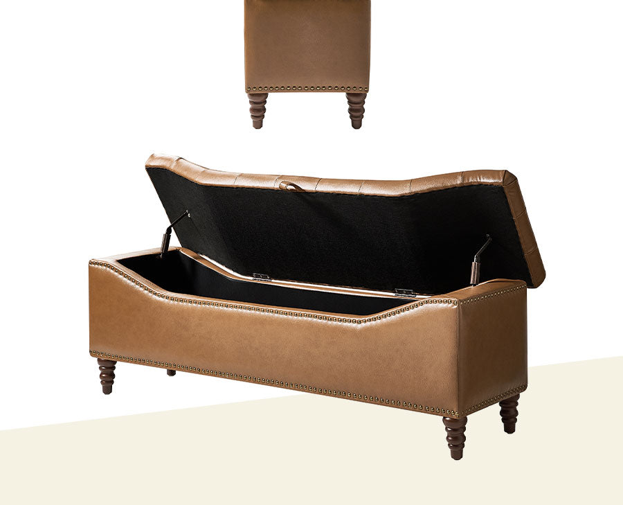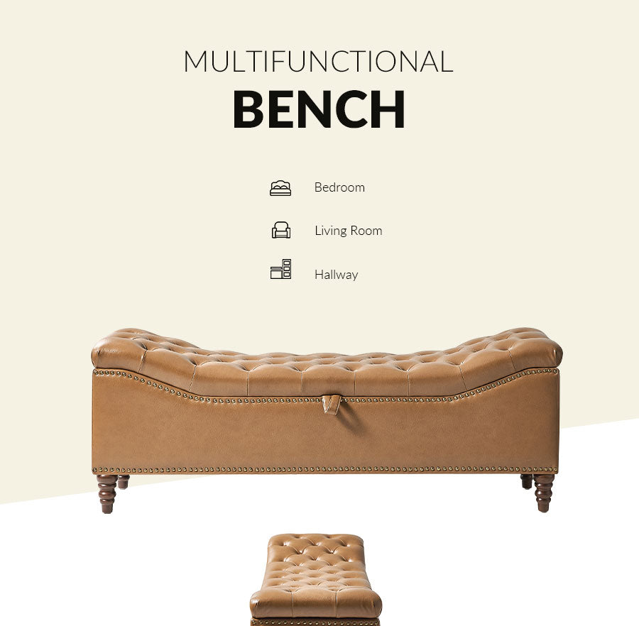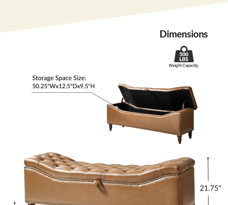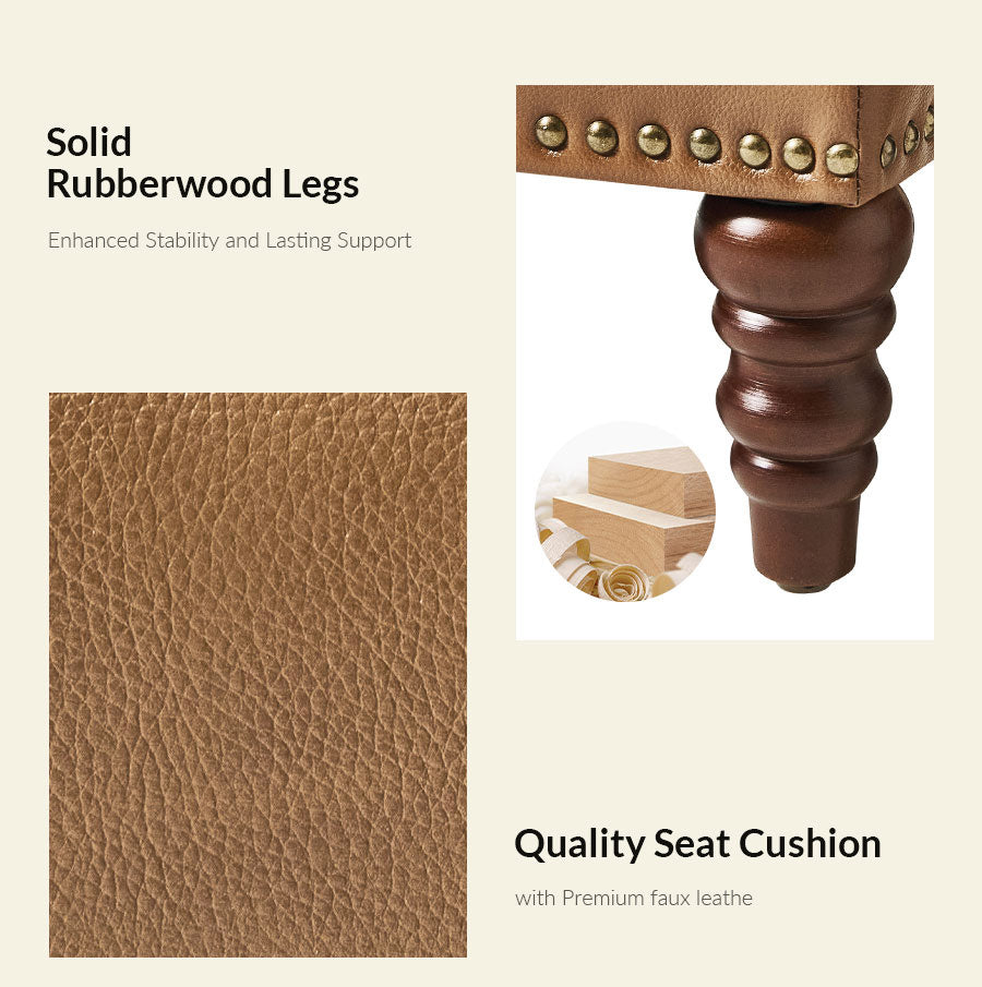 This traditional-style bench is a charming and functional addition to any living space or entryway. It is crafted with a classic button-tufted design, adding depth and elegance to its appearance. Accentuated with antique bronze nailhead trim, the bench brings a touch of vintage sophistication to your home decor. The seat is upholstered in high-quality faux leather, offering the luxurious look of real leather while being easy to clean and maintain. The base of the bench is supported by beautifully carved solid rubberwood legs in a baluster, emphasizing its traditional character and providing sturdy support. Beyond its aesthetic appeal, this bench also offers practical storage space beneath the seat, making it perfect for organizing shoes, accessories, or seasonal items. Blending timeless style with everyday convenience, this bench is ideal for those who appreciate classic design with modern functionality.