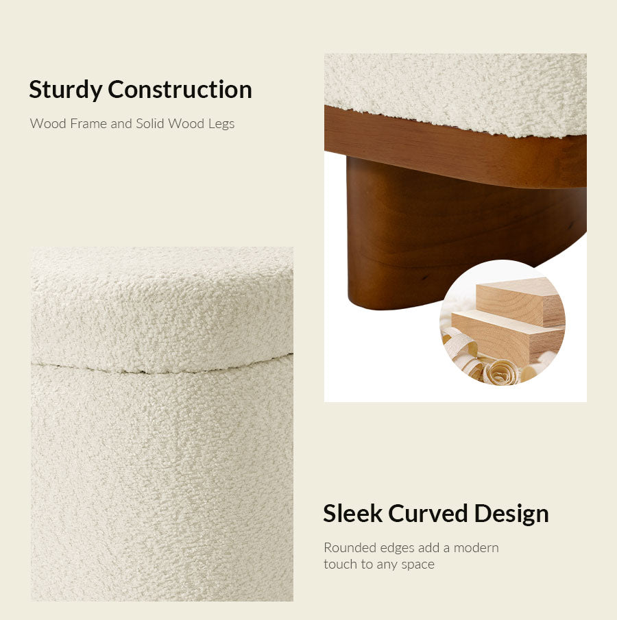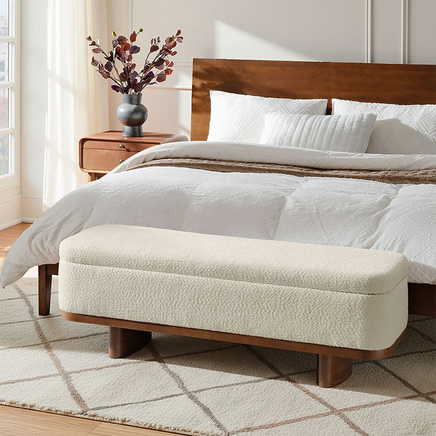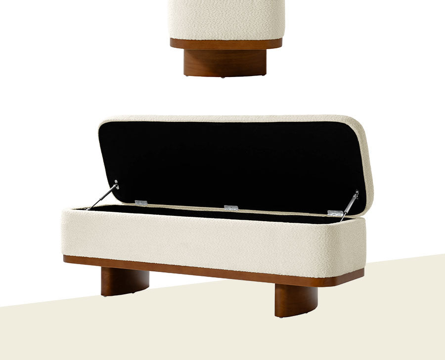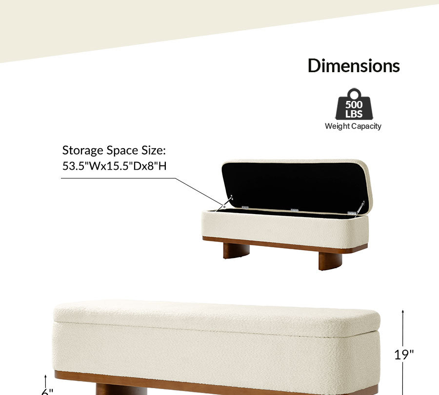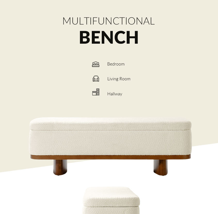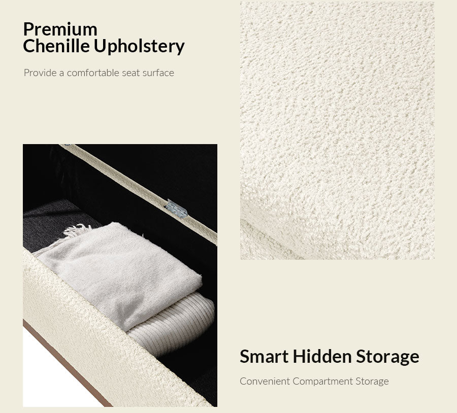 Elevate your space with this modern storage bench, designed for both style and functionality. Wrapped in soft chenille fabric, it offers a cozy and inviting seat while adding a touch of sophistication. The streamlined silhouette creates a visually light look that effortlessly blends into any modern interior. Beneath the cushioned top lies a spacious hidden compartment—suitable for stashing away blankets, shoes, or everyday essentials, helping you maintain a clutter-free home. Built with a solid wood frame, this bench ensures lasting durability and reliable support. Whether placed at the foot of your bed, in the entryway, or along a hallway, it serves as a versatile piece for sitting, storing, and styling.