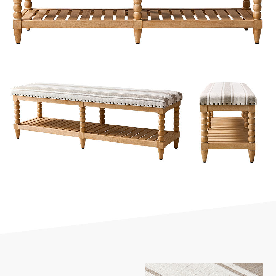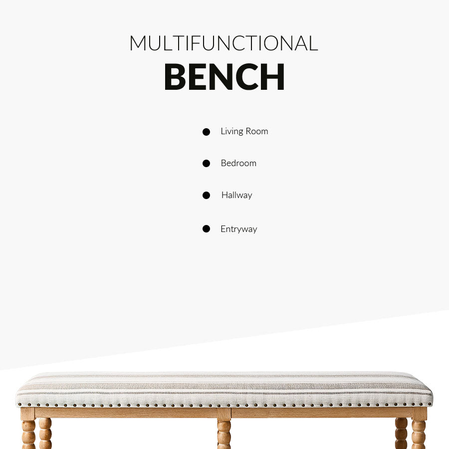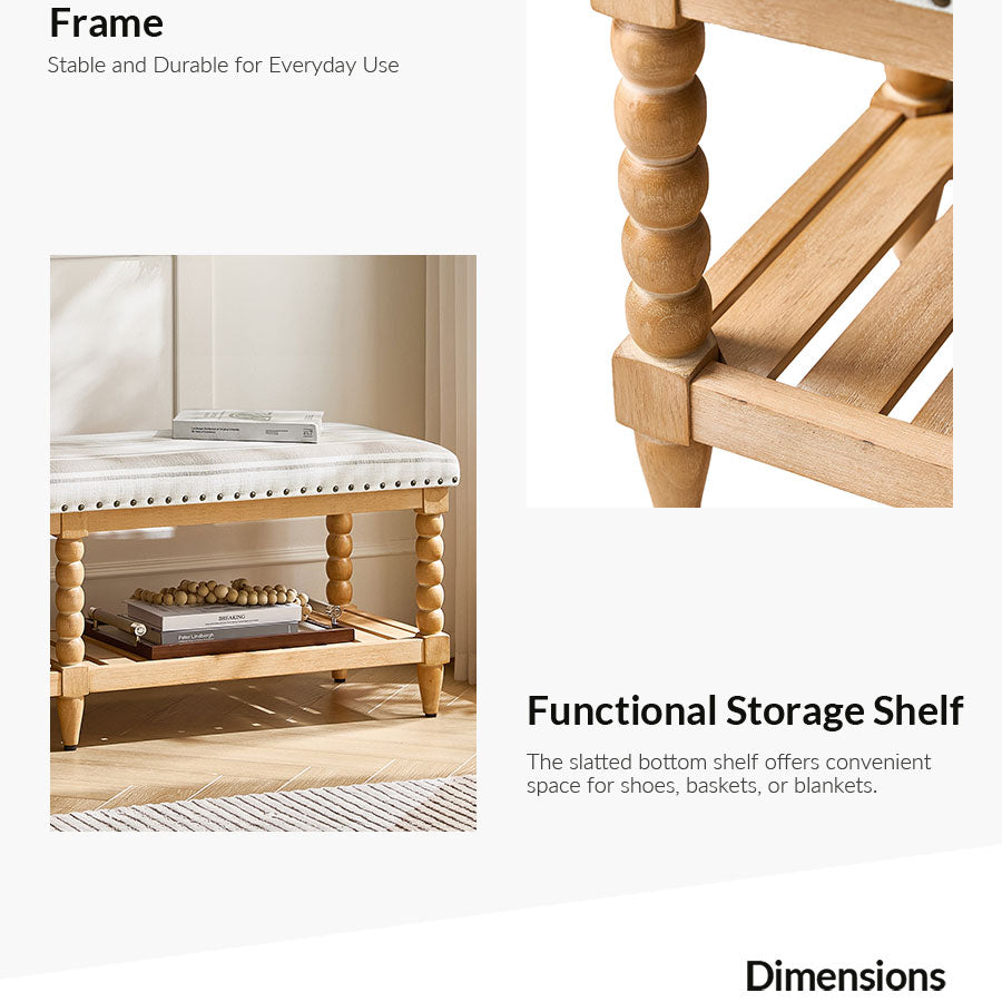 Add a touch of rustic charm to your home with this farmhouse-style bench, thoughtfully designed for both aesthetics and comfort. Featuring a classic silhouette with turned solid wood legs, this bench exudes timeless appeal and sturdy craftsmanship. The natural wood finish enhances the warmth and organic feel of the design, making it a perfect fit for entryways, living rooms, or the foot of the bed. The generously padded seat is upholstered in a neutral-toned fabric that complements a variety of interiors. Its soft cushioning provides a comfortable sitting experience, whether you're putting on shoes or simply taking a moment to relax. Nailhead trim detailing around the edge of the seat adds a subtle decorative accent, lending a refined touch to the rustic design. Below the seat, a spacious slatted wooden shelf offers practical storage for shoes, baskets, or other essentials, making it as functional as it is stylish.