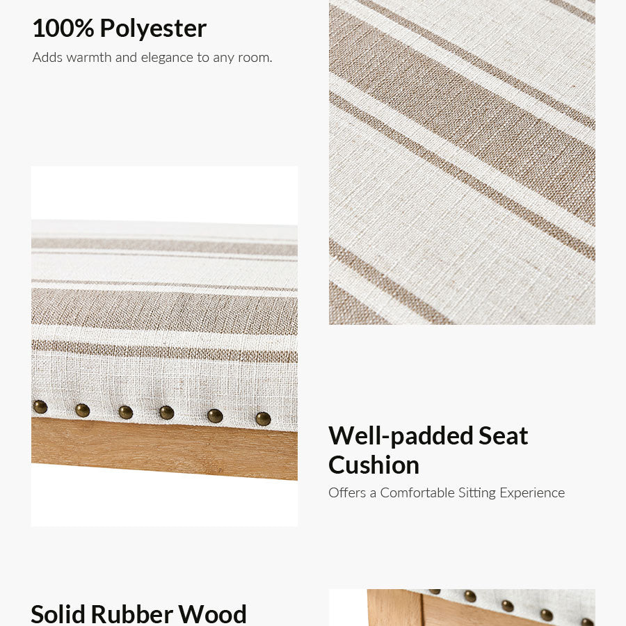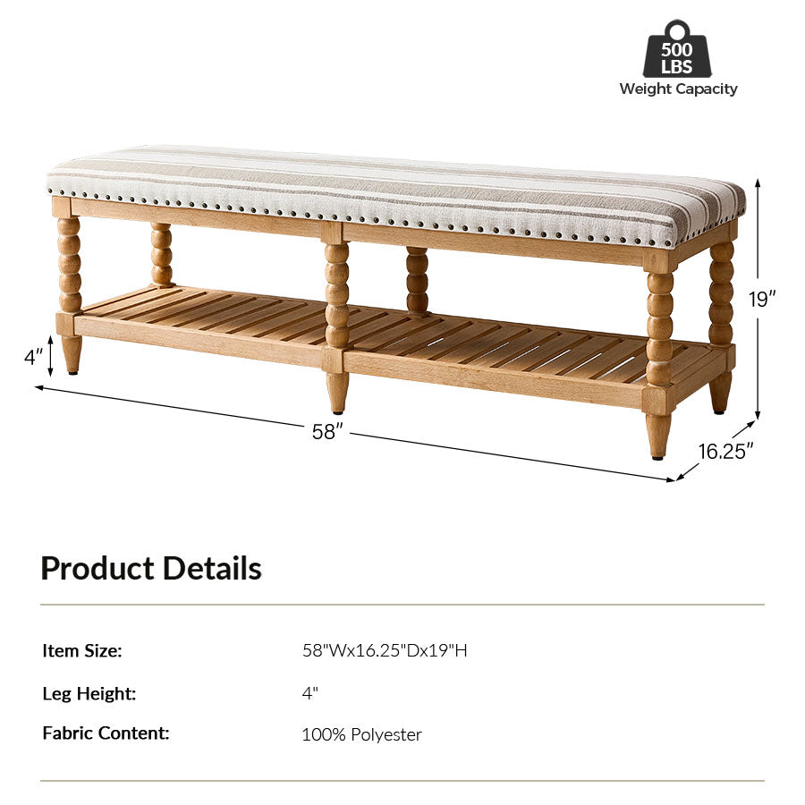 -Product Including: One bench, assembly is required. -Farmhouse Style: Rustic and charming design that brings warmth to any space. -Solid Wood Legs: Sturdy, turned legs made from solid wood for lasting durability. -Comfortable Seating: A softly cushioned seat provides a cozy and supportive sitting experience. -Nailhead Trim Detail: Decorative nailhead accents add a touch of vintage elegance. -Functional Storage Shelf: The slatted bottom shelf offers convenient space for shoes, baskets, or blankets.