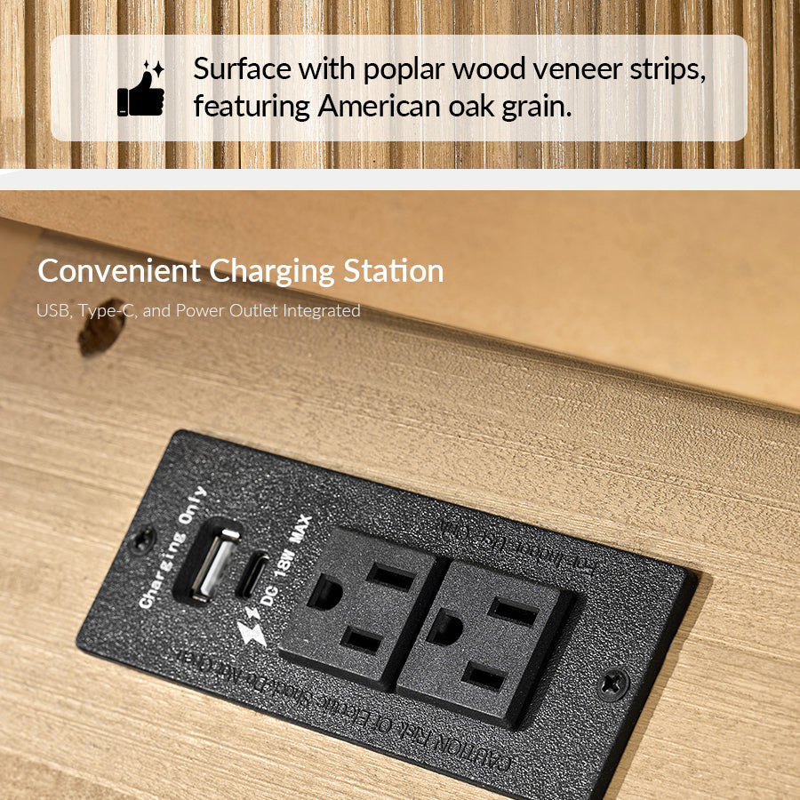 - Product Including: One platform bed and two nightstands, assembly is required. - Practical Top and Drawer Storage: The spacious tabletop offers a perfect surface for your bedside lamp, clock, or current reads, while the smoothly gliding drawer provides hidden storage for smaller items like chargers, glasses, or personal accessories, keeping your space tidy and functional. - Integrated Charging Station: Thoughtfully designed with a built-in power strip at the back, including a standard outlet, USB, and Type-C ports, this nightstand allows you to power up phones, tablets, or smartwatches with ease. - Fluted Surface with Vertical Reeding: Vertical fluted detailing adds rich texture and depth, lending a refined modern appeal to the bedroom set. Subtle yet stylish, it complements a range of bedroom styles, from minimalist to contemporary. - Sturdy Construction with Oak Grain Finish: Crafted from a blend of solid wood and engineered hardwood, the bedroom set combines stability with visual charm. The surface features a rich oak grain texture, offering a warm and natural look that enhances its modern form. - Free White Glove Delivery: When you purchase the full set, enjoy complimentary white glove delivery—your items will be brought into your home, fully assembled, and placed exactly where you want them.