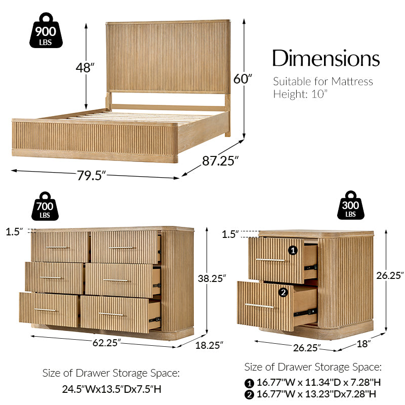 The platform bed, available in both Queen and King sizes, combines clean modern lines with solid craftsmanship for lasting stability — supporting up to 900 lbs. Two matching nightstands include drawers and integrated power outlets (USB-A and Type-C), keeping your bedside tidy and connected. A spacious 6-drawer dresser completes the set, offering generous storage for clothing and décor.