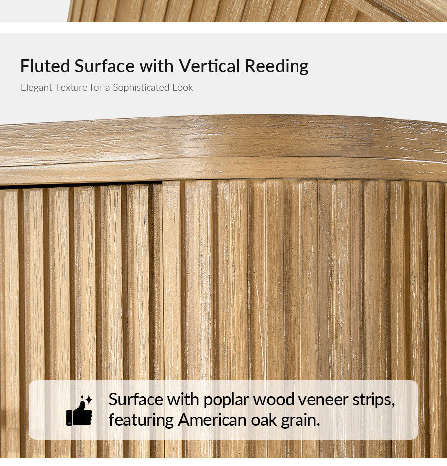 Bring timeless warmth and effortless coordination to your bedroom with this 4-piece modern solid wood set. Crafted from solid poplar wood and durable MDF, each piece features a refined oak grain finish that highlights the natural texture of the wood. The fluted front detailing adds a touch of sophistication, with vertical reeding that’s smooth to the touch and visually distinctive.