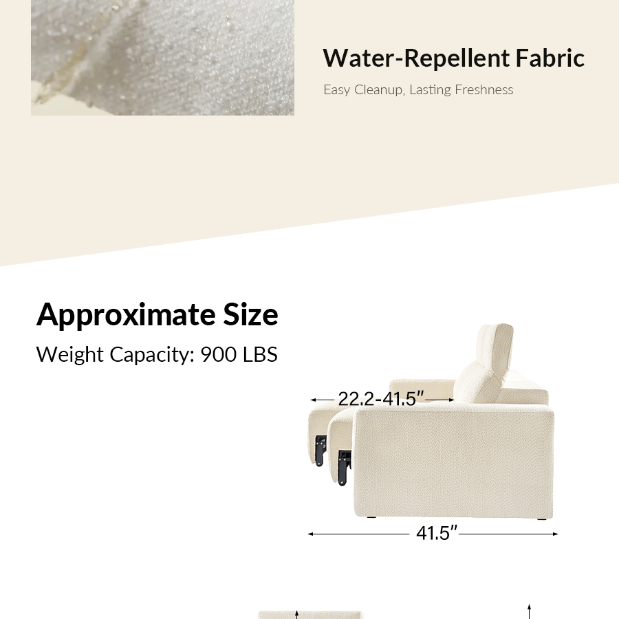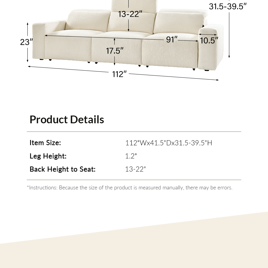 Weight Capacity: 900 lbs Overall Item Weight: 348.92 lbs Item Size: 112''W x 41.5''D x 31.5-39.5''H Seat Size: 91''W x 22.2-41.5''D x 17.5''H Arm to Floor Height: 23''H Back Height to Seat: 13/22''H Leg Height: 1.2''H Instructions:Because the size of the product is measured manually, there may be errors.