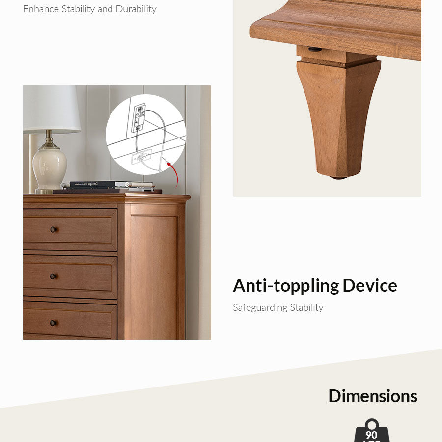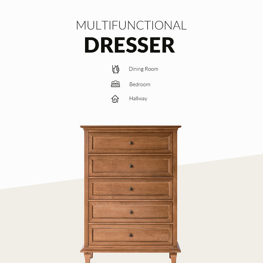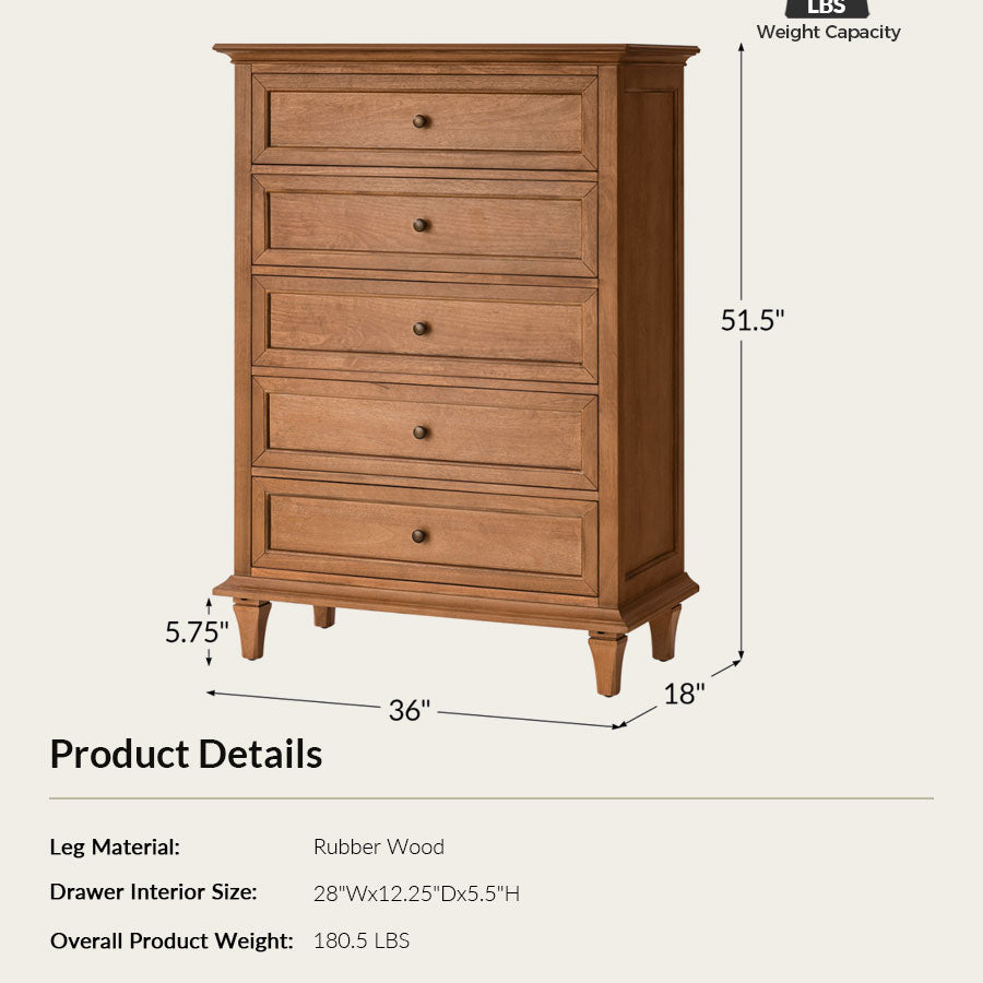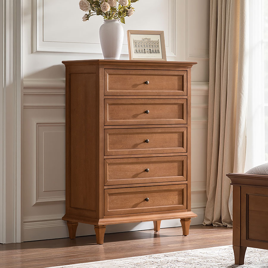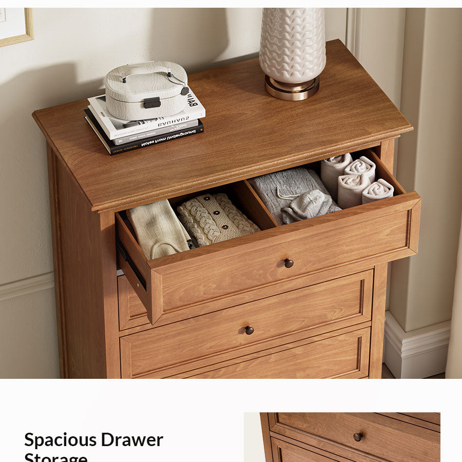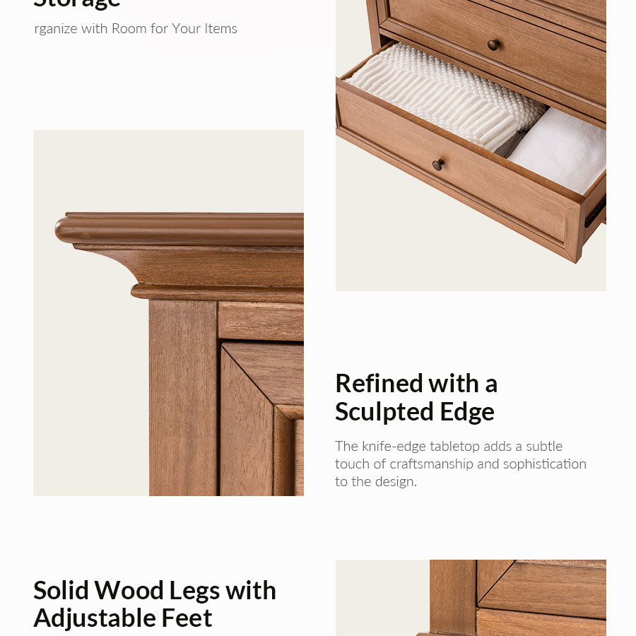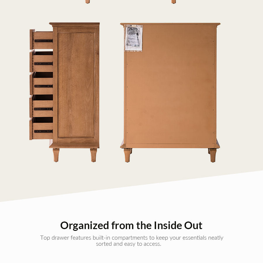 Elevate your living space with this transitional chest that artfully balances timeless design and modern functionality. The refined knife-edge top panel lends a sophisticated architectural touch, while the first drawer features integrated dividers, offering thoughtfully organized storage for smaller essentials. Generous lower drawers provide ample space for clothing and linens, ensuring your home remains both elegant and clutter-free. Resting on sturdy solid wood legs, this chest promises enduring stability and craftsmanship.Designed for effortless setup, only the legs need to be attached. With its graceful lines and purposeful details, this piece adds understated luxury to any interior.