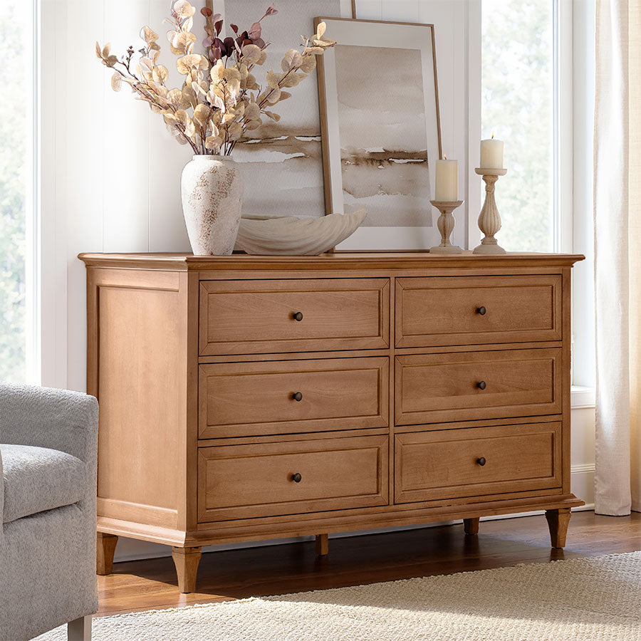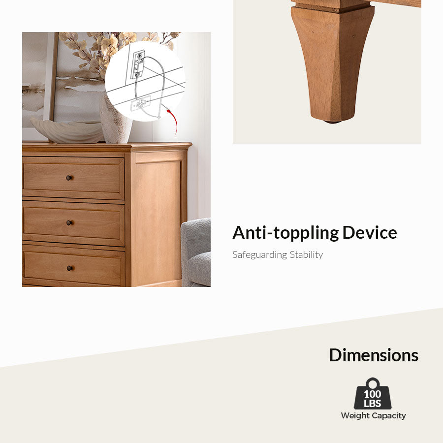 Blending Transitional style with smart functionality, this dresser is a versatile addition to any bedroom. The sleek knife-edge top panel adds a refined touch, while the first row features two drawers with built-in dividers for neatly organizing smaller items. Spacious lower drawers provide ample storage for clothing, linens, and accessories, helping keep your space tidy. The smooth top surface is perfect for displaying decor, and solid wood legs ensure sturdy, long-lasting support. With quick and easy assembly — only the legs need to be attached — this dresser combines elegant design, practical storage, and timeless appeal to fit effortlessly into any decor.