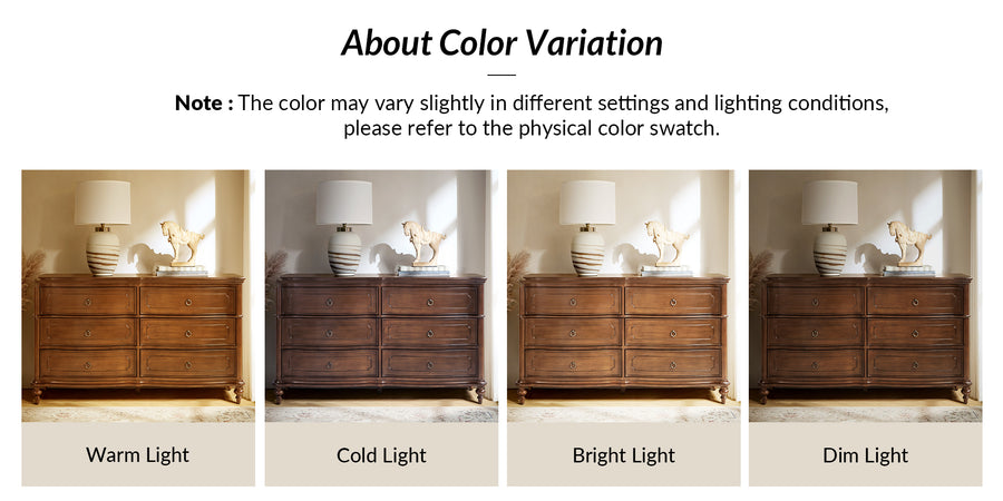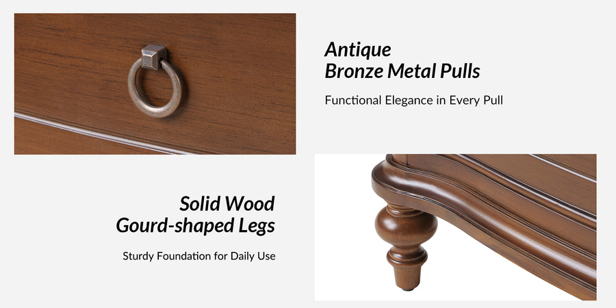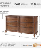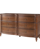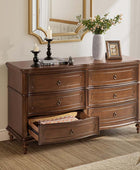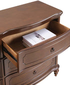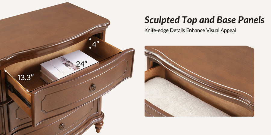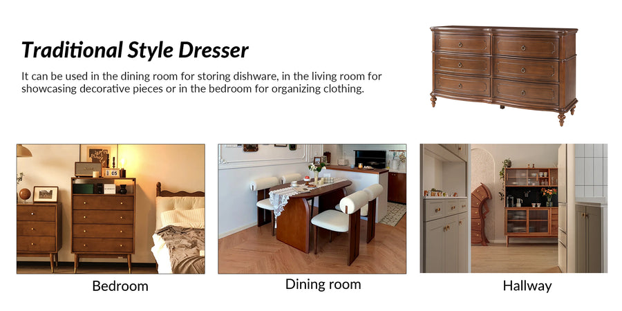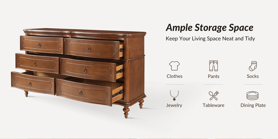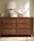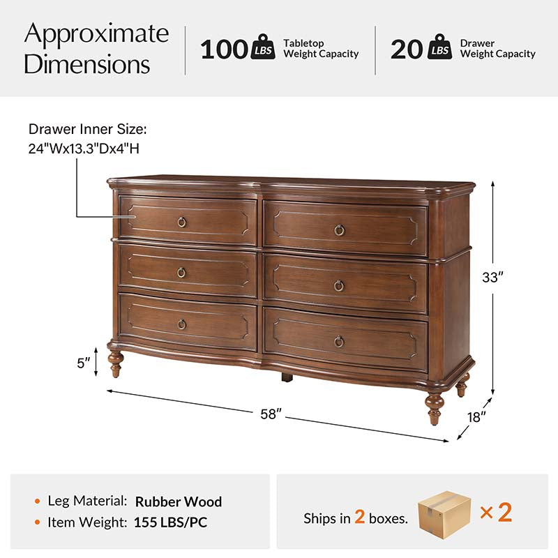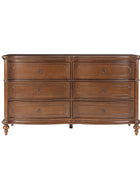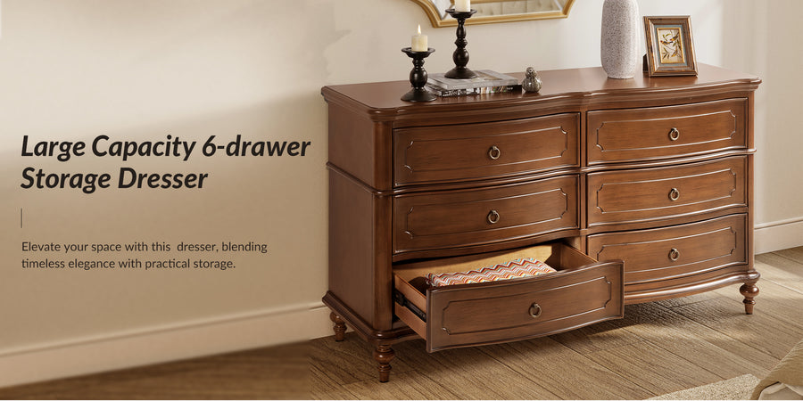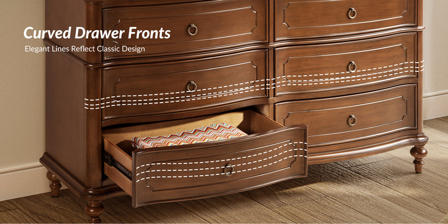 Designed with graceful curvature, each drawer front features a subtly bowed silhouette that adds a sense of classic charm. The dresser stands on solid wood gourd-shaped legs, enhancing its traditional character while ensuring lasting durability. The top and bottom panels are crafted with distinctive knife-edge shaping, lending a sculpted appearance that elevates the overall design. Antique bronze-finished metal drawer pulls complement the warm tones of the wood, adding a vintage-inspired touch that’s both functional and decorative. Six spacious drawers provide ample room for clothing, linens, or personal items, making it easy to keep your space neat and organized. Whether used as a standalone piece or part of a complete bedroom set, this traditional style dresser brings a balance of style and storage to your home.