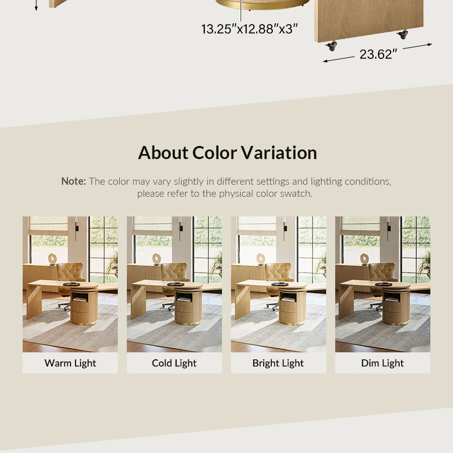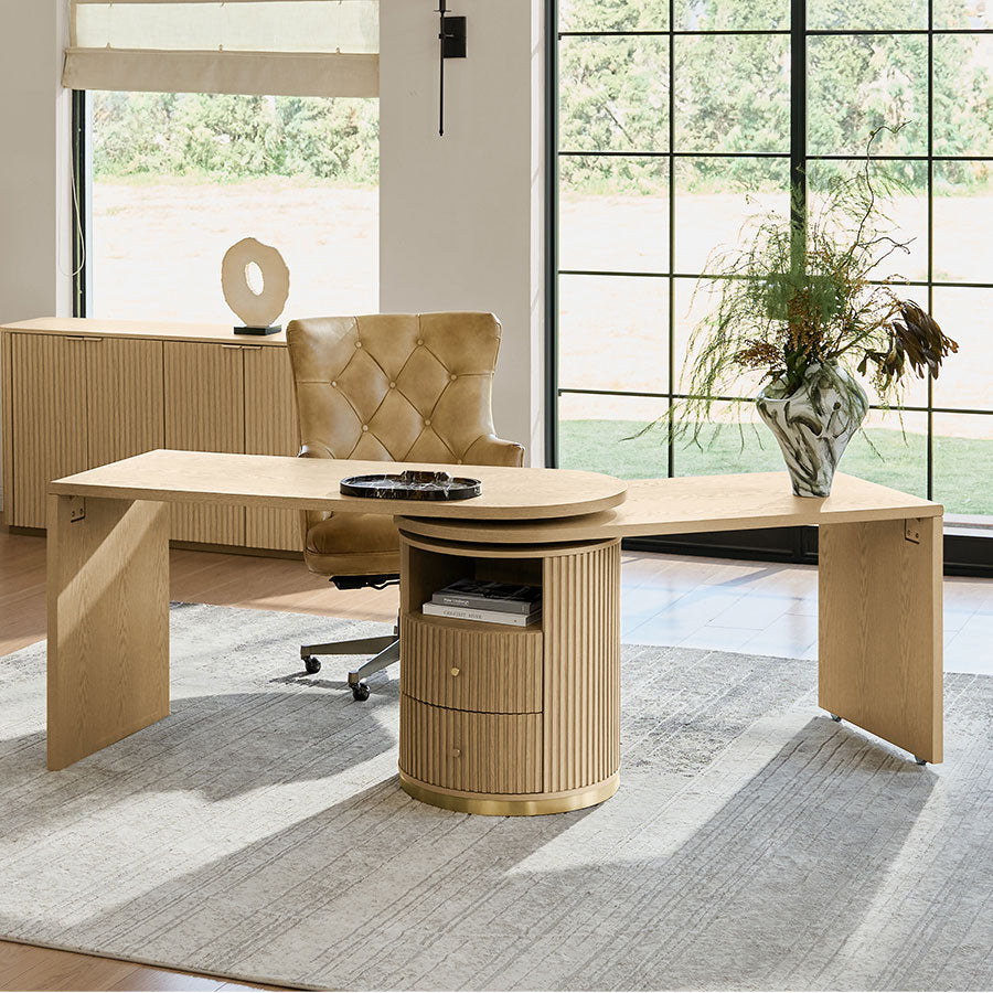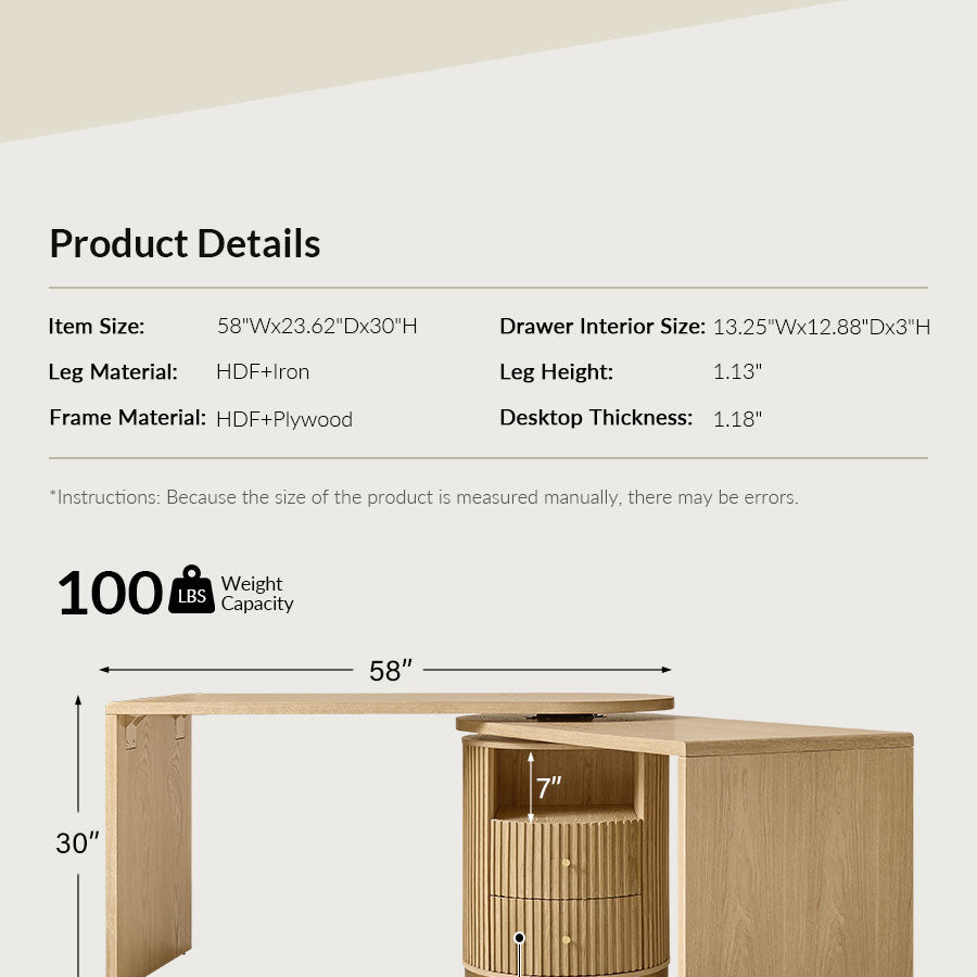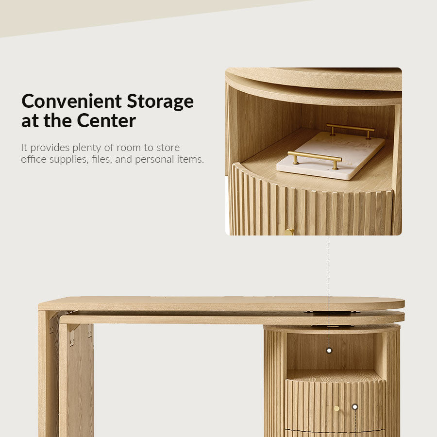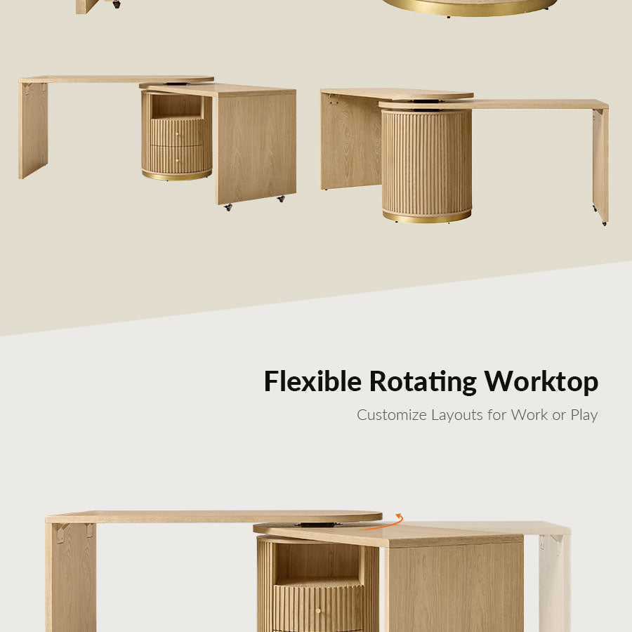 Crafted with premium smooth-glide swivel hardware, the desk ensures stable rotation and long-term durability. The curved base cabinet is supported by a sturdy metal-reinforced bottom, enhancing both structural strength and the desk’s overall modern aesthetic.