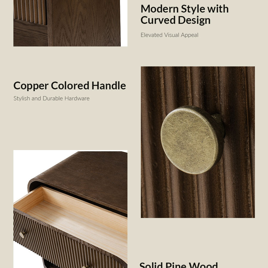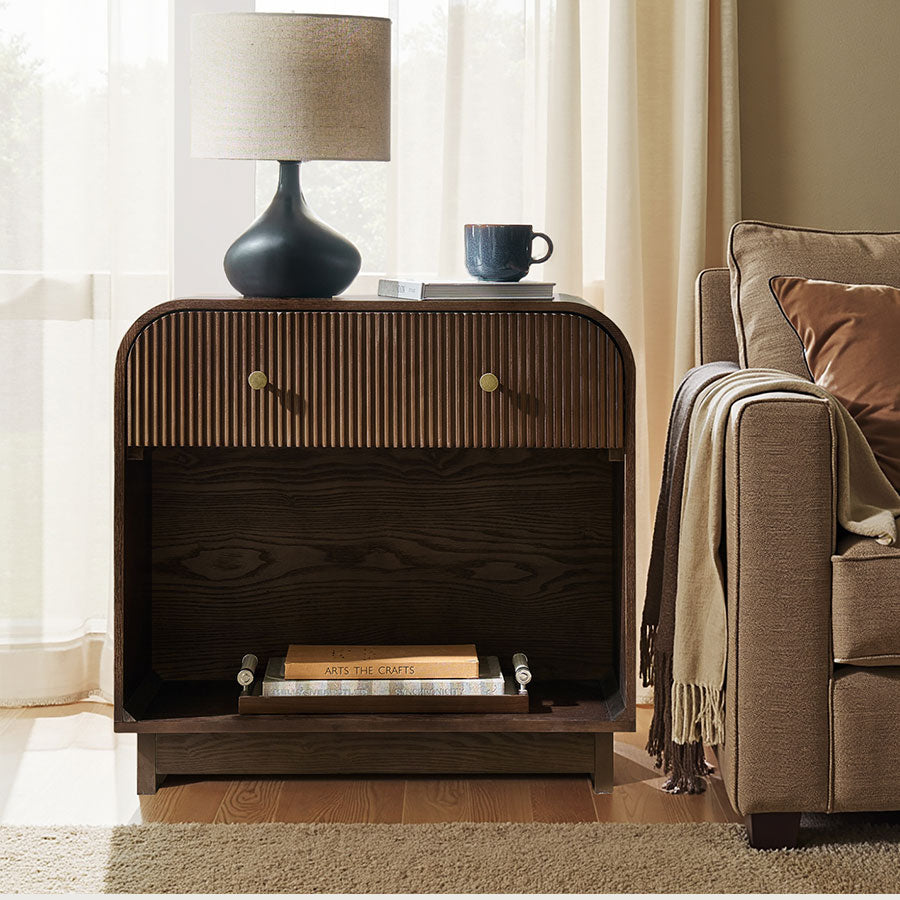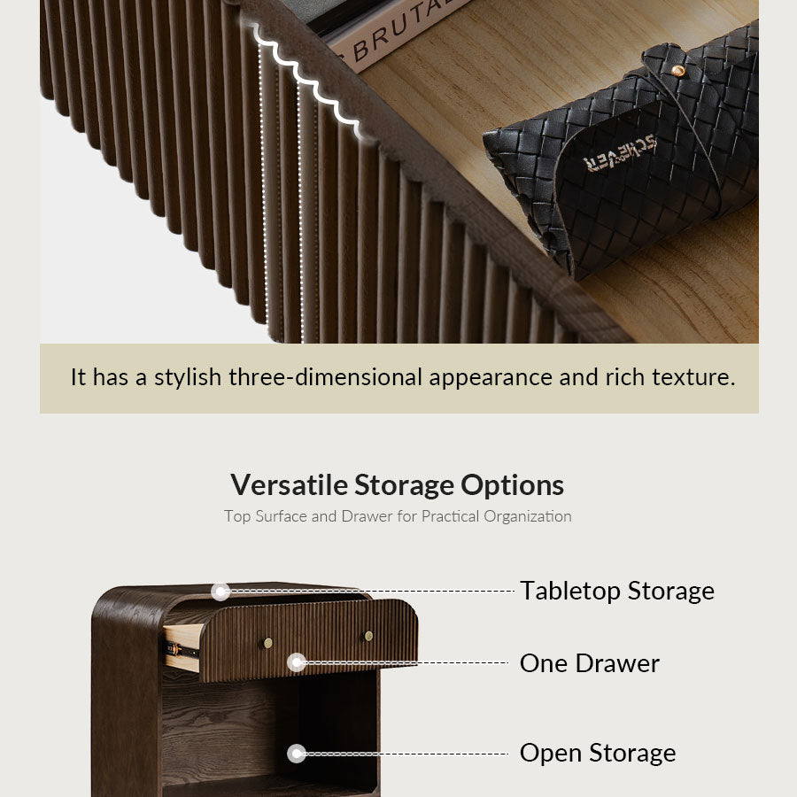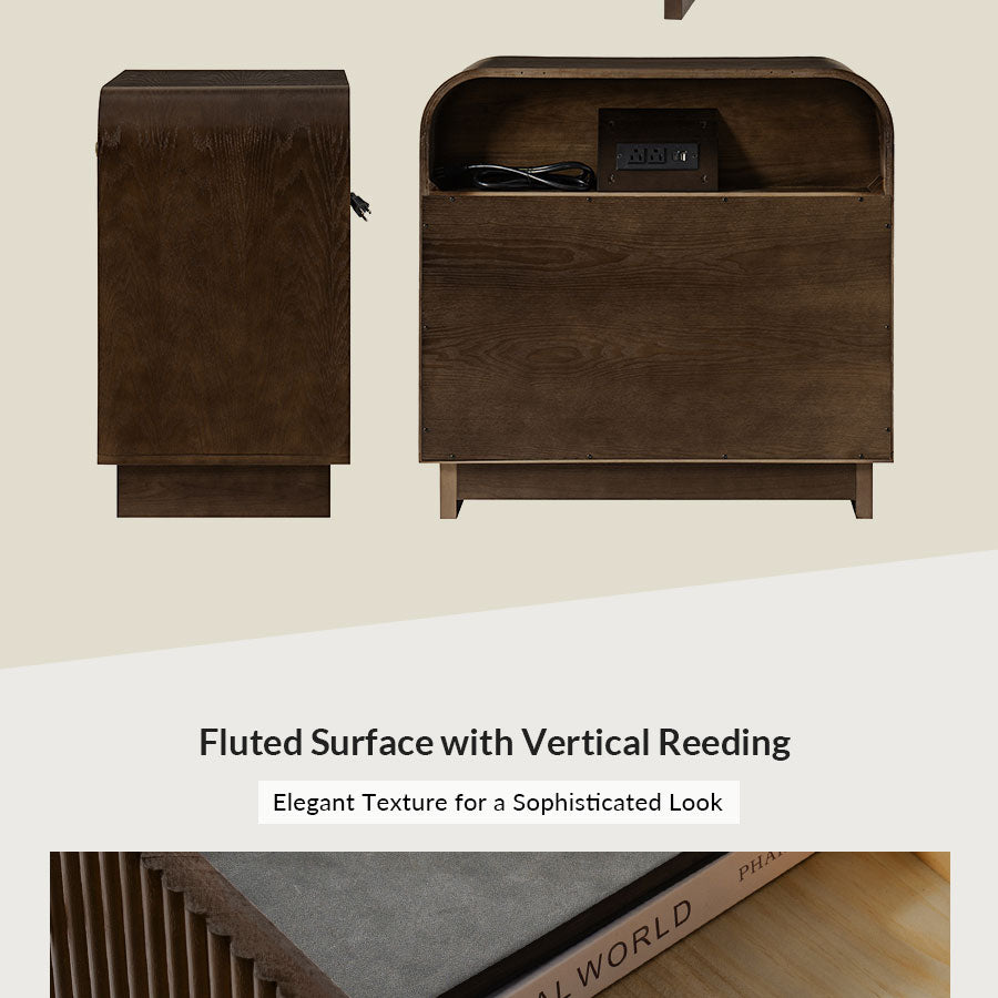 Elevate your bedroom with this modern nightstand that blends style and functionality.Featuring a beautifully arched tabletop and elegant curved design, it adds a soft, sophisticated touch to any space. The solid wood veneer finish and sturdy solid wood legs offer lasting durability and a high-end look. The single drawer showcases a fluted front design, adding rich texture and visual interest, while the open cubby offers easy access to daily essentials.A built-in charging station with USB ports keeps your devices powered and within reach. Easy to assemble, this nightstand requires only the legs to be attached, making setup quick and hassle-free. Whether placed beside your bed or in your living area, thisnightstand  is both practical and stylish.