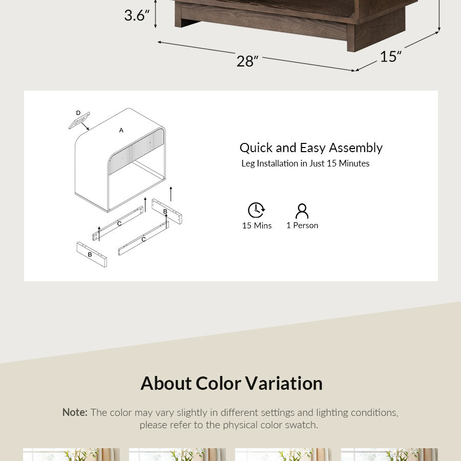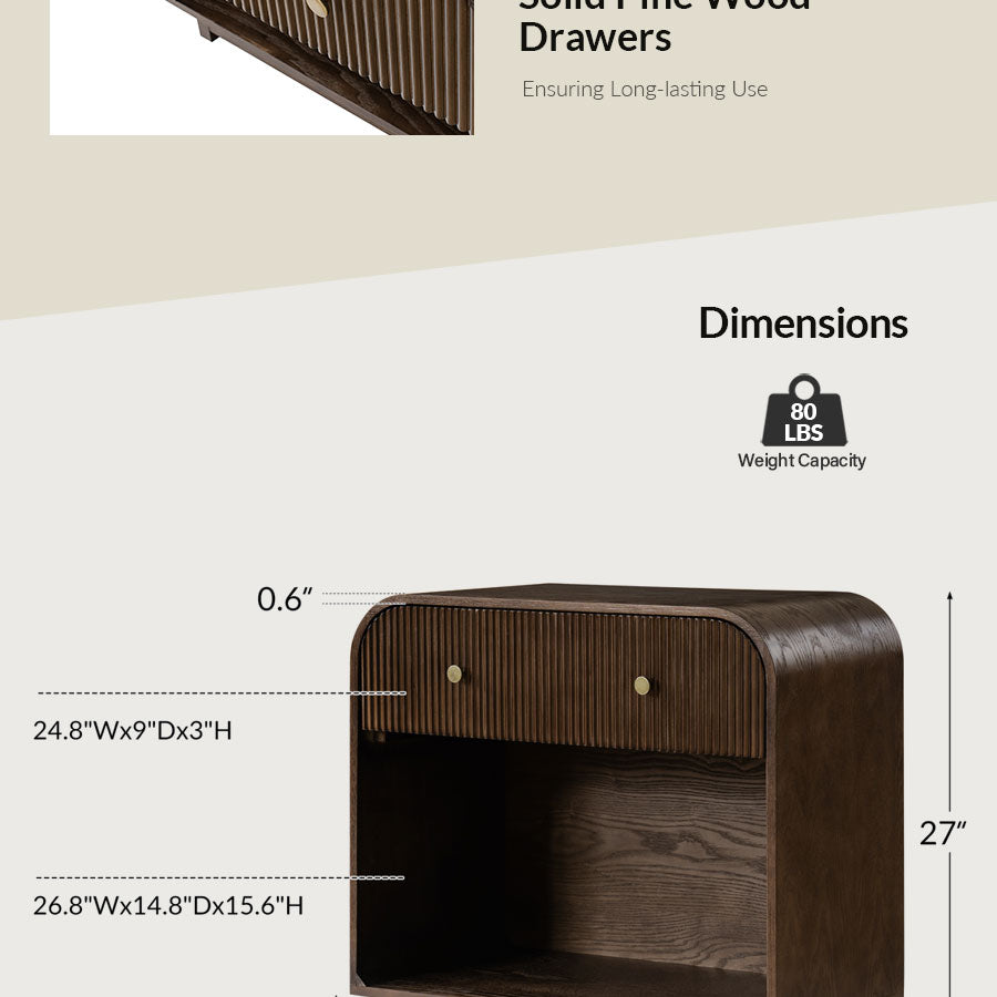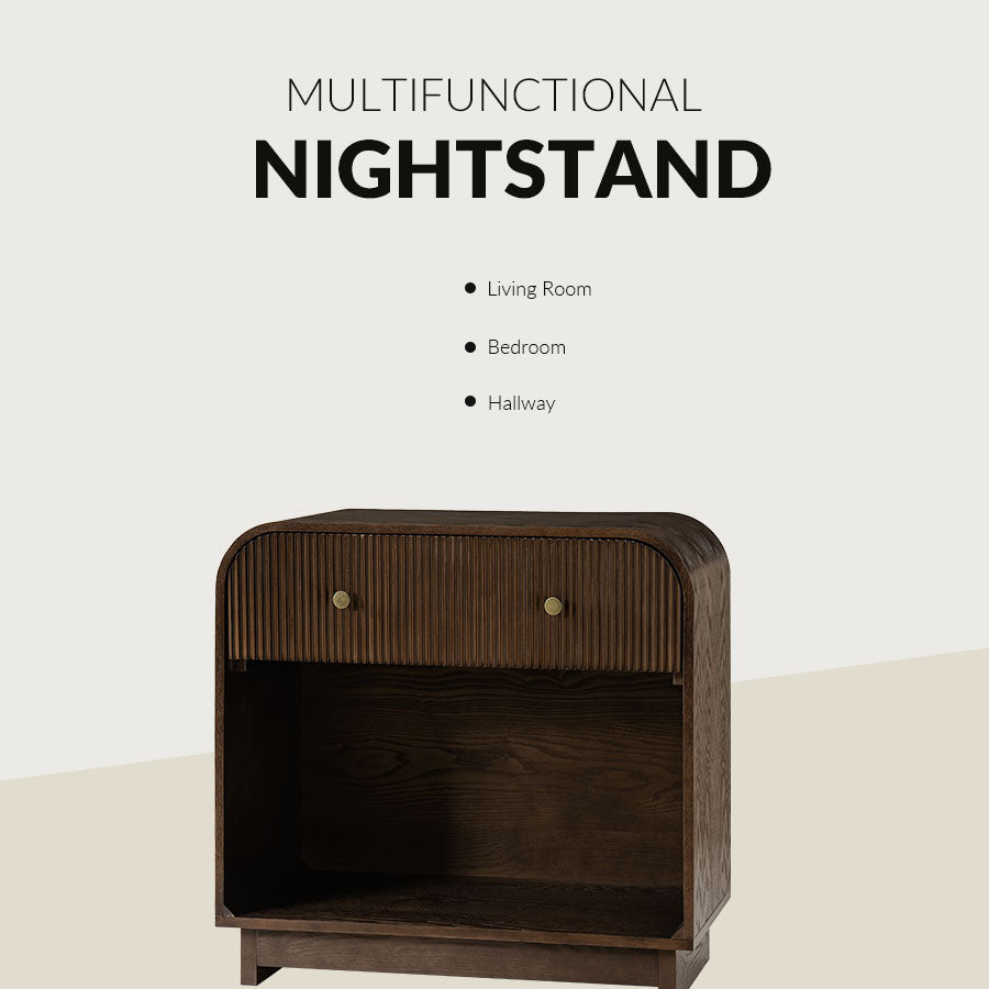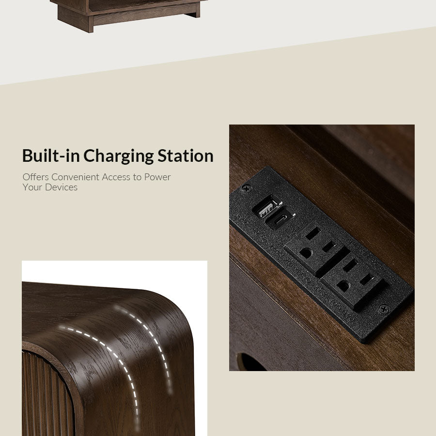 -Product Including: One nightstand, Only the legs need to be assembled. -Solid Wood Veneer Finish : Features a premium wood veneer surface and sturdy solid wood legs for durability and a refined look. -Built-in Power Outlet & USB Ports: Convenient charging station keeps your devices powered up and within reach. -Elegant Curved Design – Showcases an arched tabletop and smooth curves for a modern, stylish touch. -Ample Storage Space: Featuring a spacious fluted-front drawer and an open cubby, it offers both hidden and easy-access storage for your everyday essentials.