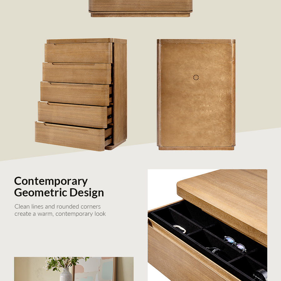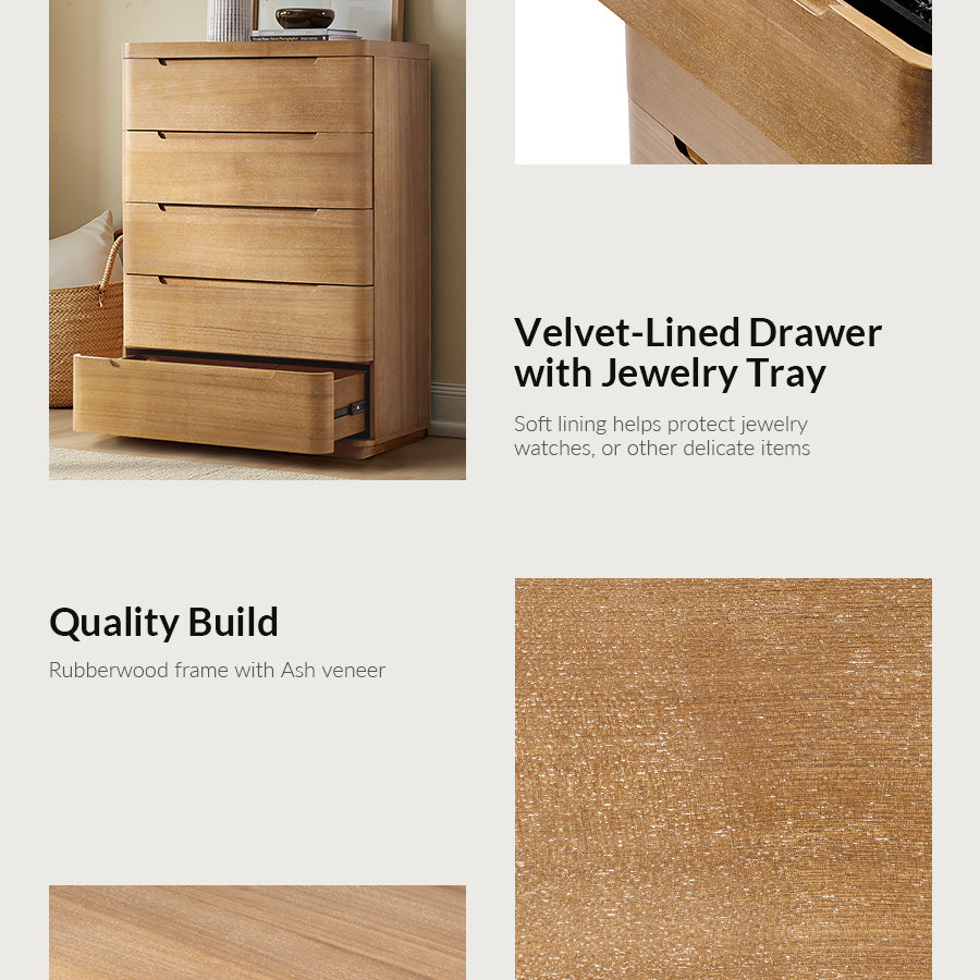The top drawer features a velvet-lined interior with a removable jewelry tray, offering a designated space to store your accessories, watches, and delicate items while keeping them protected and organized. The additional four spacious drawers provide ample room for clothing, linens, and everyday essentials—helping you maintain a clean and clutter-free bedroom.