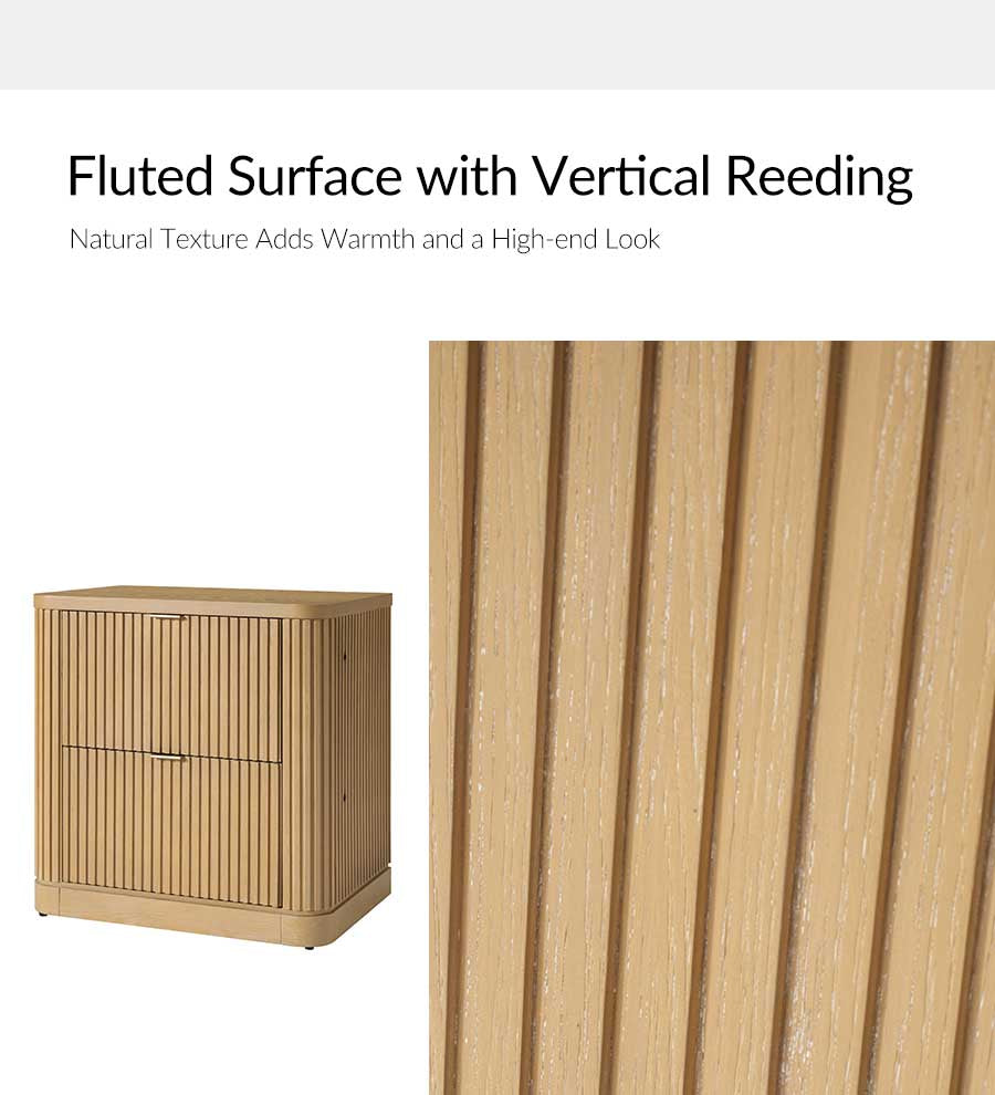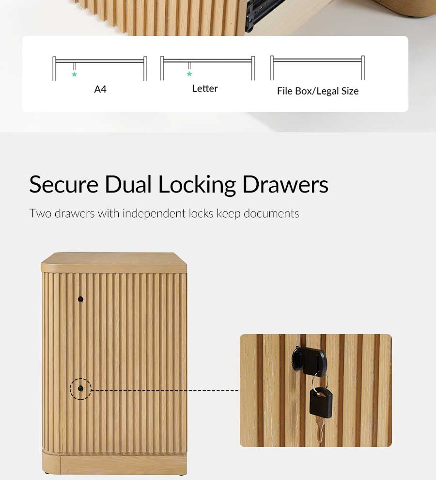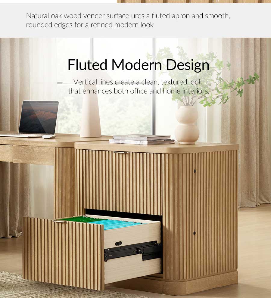 This file cabinet features a modern fluted design with vertical lines that addcontemporary elegance and texture to any space. Two independent locking drawersensure secure storage of documents and valuables, while the quick-release drawerstructure allows for easy use and maintenance. Finished with real oak wood veneer, thecabinet offers natural texture and refined durability. Inside, the spacious drawers includefile-hanging rails that accommodate various file sizes, providing efficient and organizedstorage for everyday needs. Arriving fully assembled, this piece requires no setup-simplyunbox and enjoy a stylish, functional addition to your home or office.
