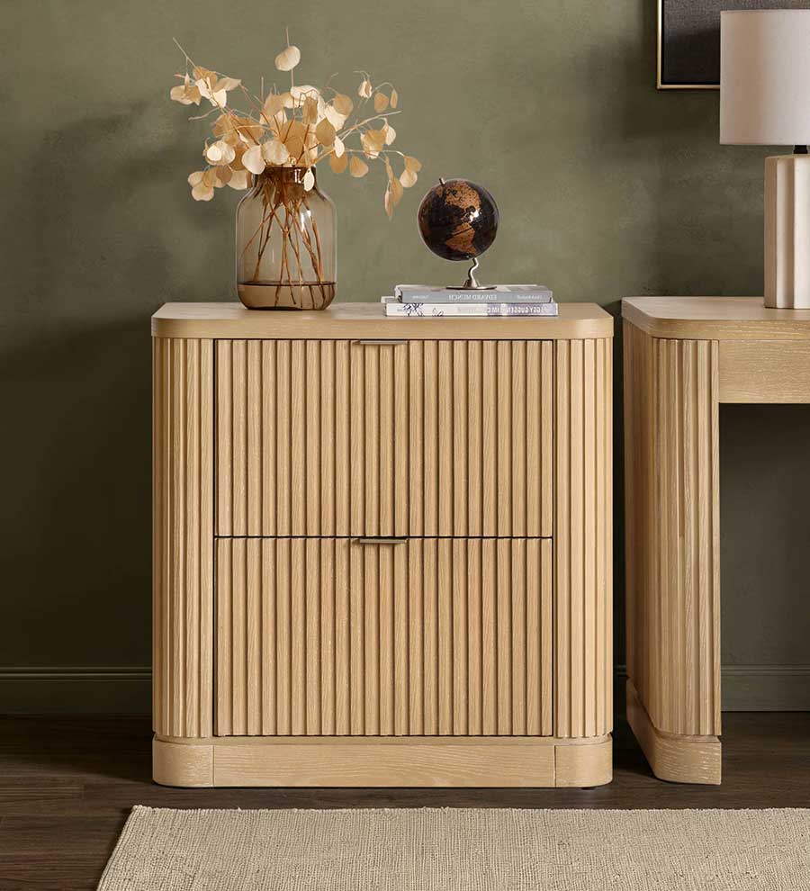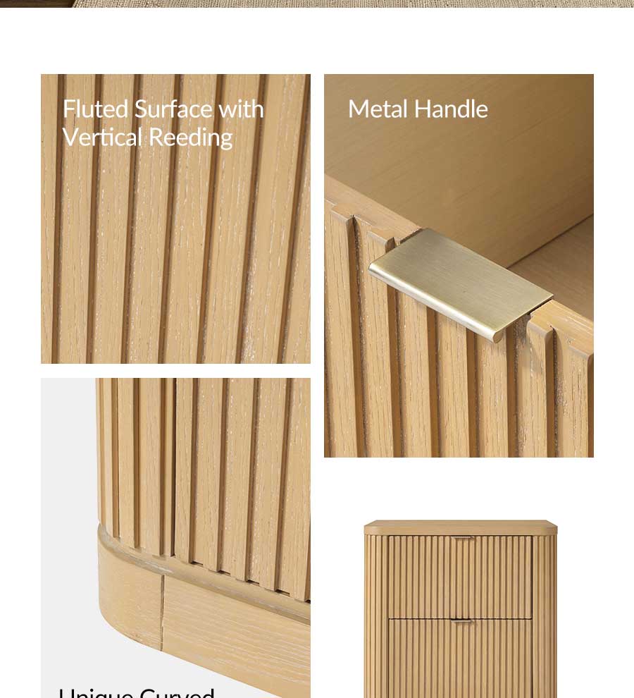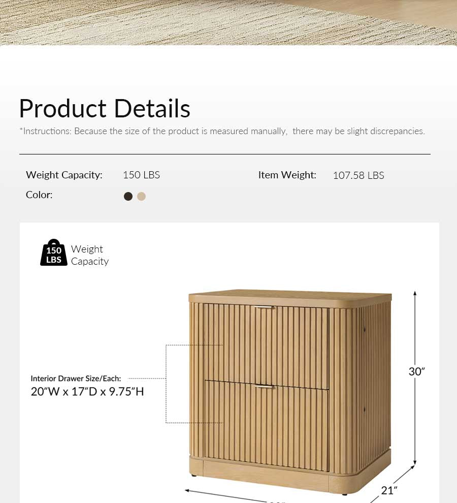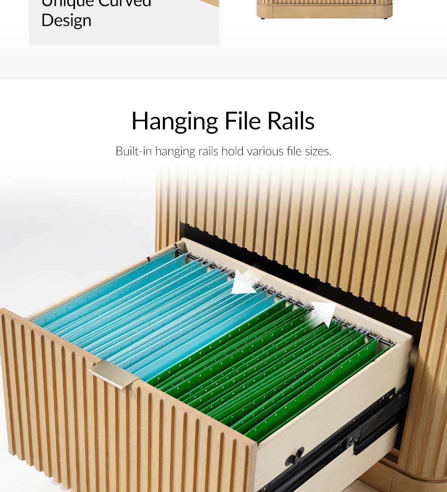 This file cabinet features a modern fluted design with vertical lines that addcontemporary elegance and texture to any space. Two independent locking drawersensure secure storage of documents and valuables, while the quick-release drawerstructure allows for easy use and maintenance. Finished with real oak wood veneer, thecabinet offers natural texture and refined durability. Inside, the spacious drawers includefile-hanging rails that accommodate various file sizes, providing efficient and organizedstorage for everyday needs. Arriving fully assembled, this piece requires no setup-simplyunbox and enjoy a stylish, functional addition to your home or office.