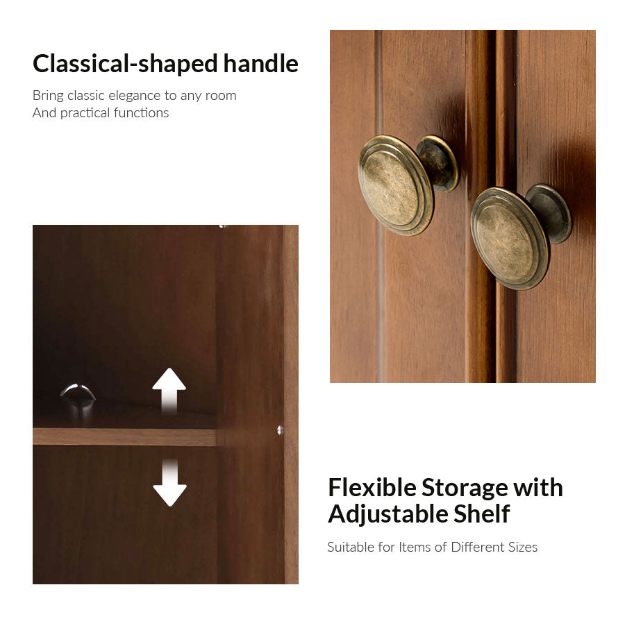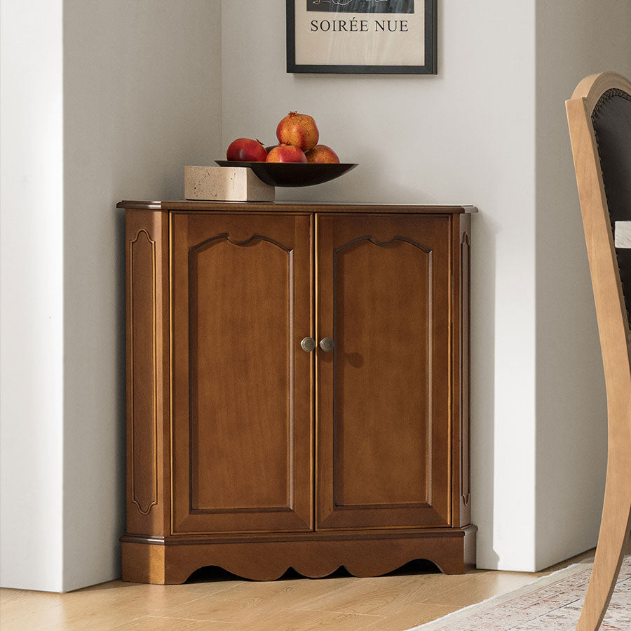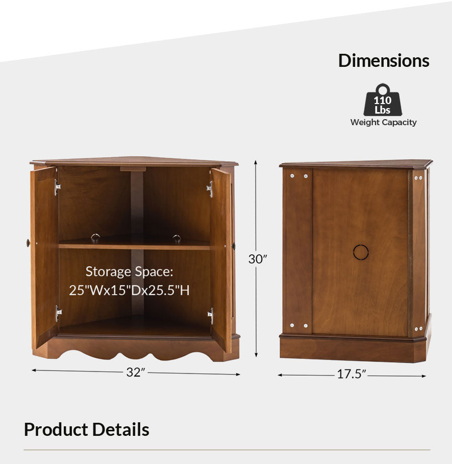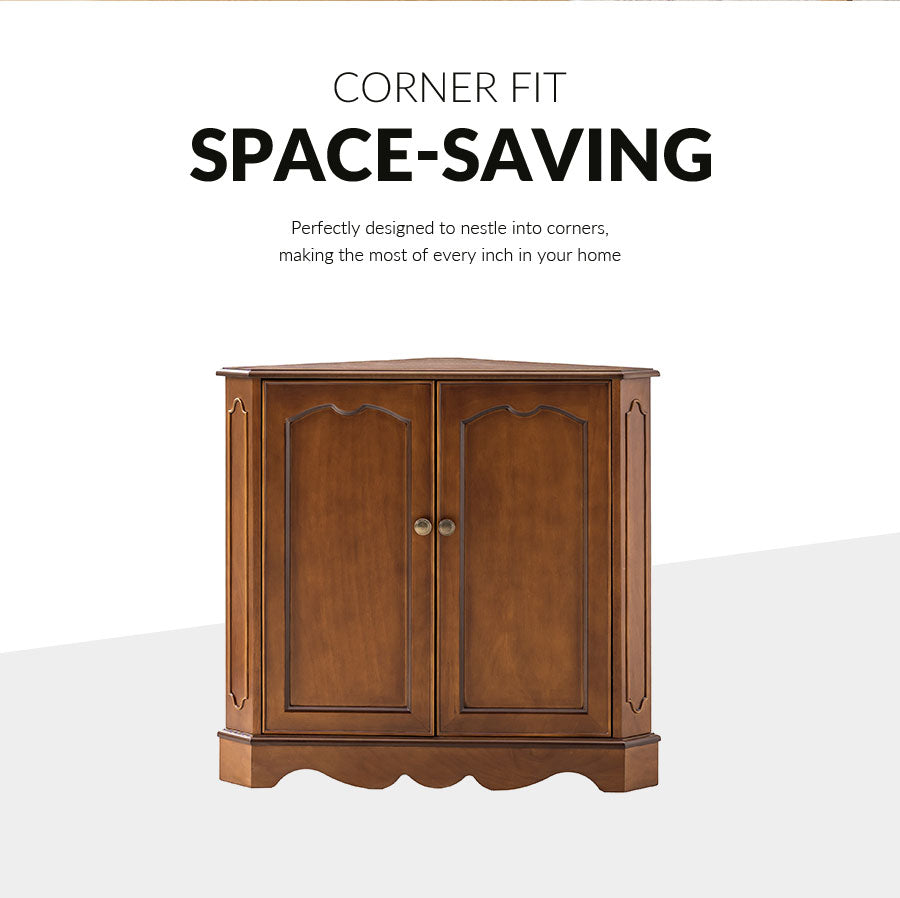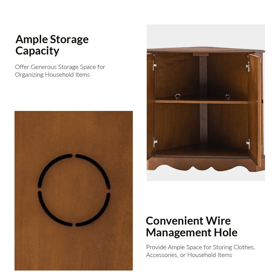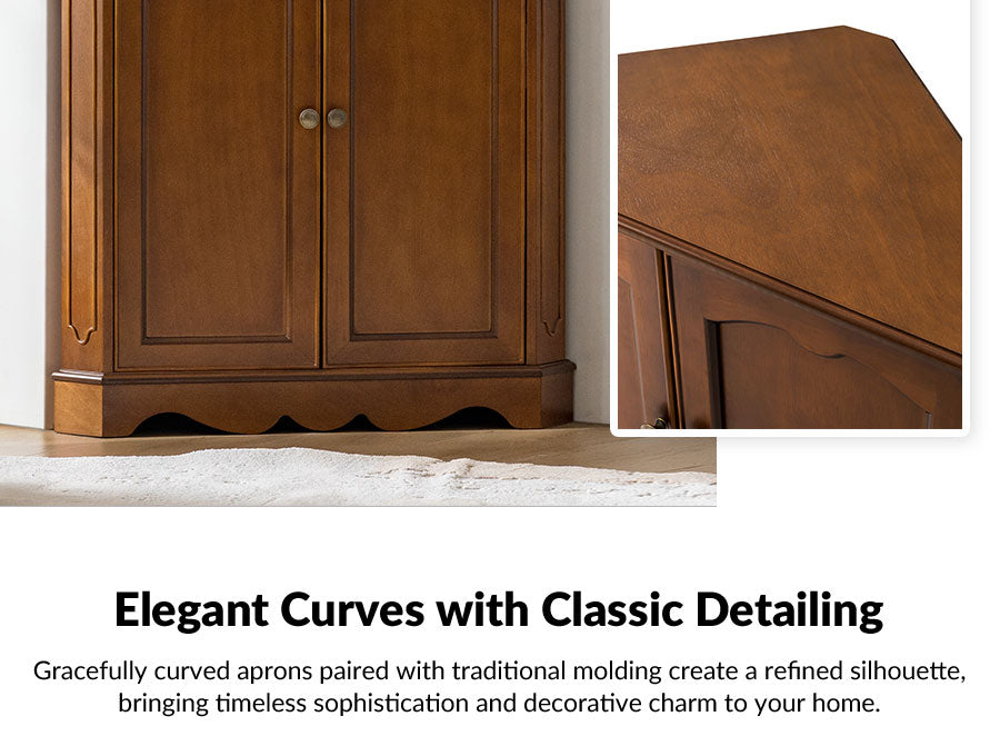 This traditional-style corner cabinet brings classic elegance and practical functionality to any room. Featuring gracefully curved aprons and refined decorative molding, its design showcases timeless craftsmanship and sophisticated detailing. The cabinet offers adjustable shelves, allowing you to customize storage for books, décor, or media components. Built-in cable management holes provide a neat solution for electronics, keeping cords organized and out of sight. With ample storage space behind its doors, this corner cabinet combines beauty and utility, making it perfect for living rooms, studies, or entertainment areas. Its classic design, thoughtful features, and versatile storage make it a charming and functional addition to your home.