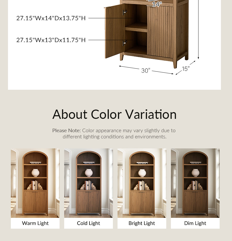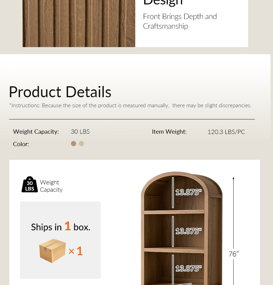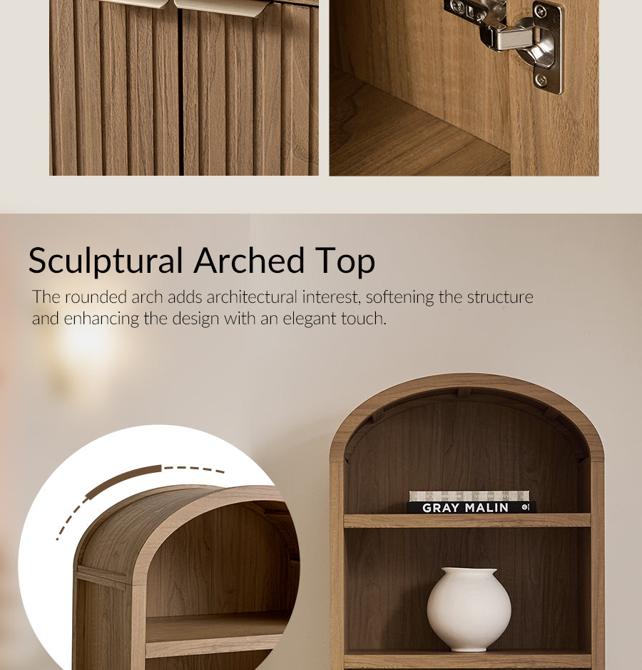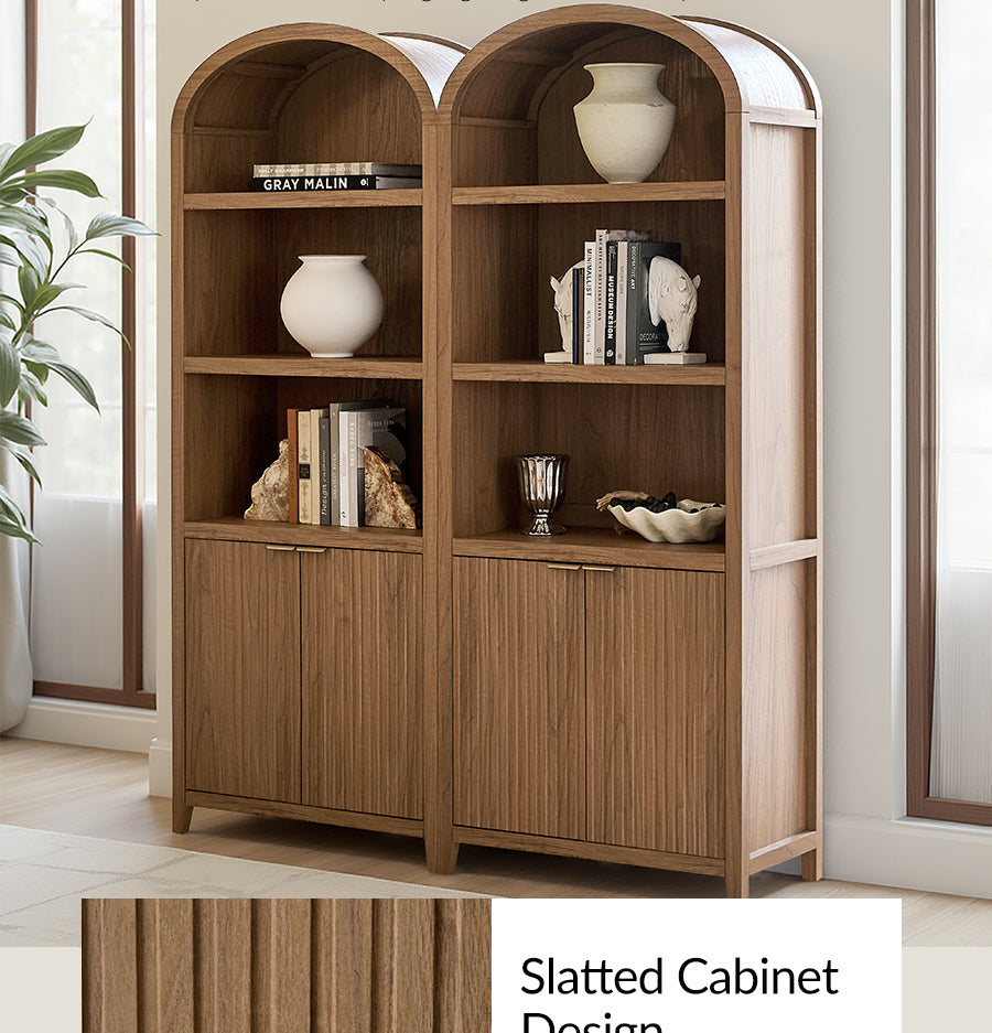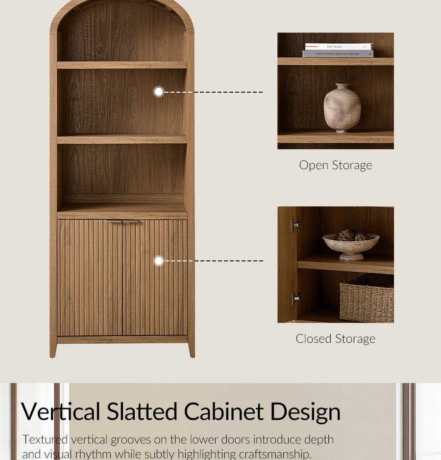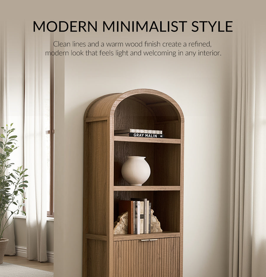 Bring warmth, style, and smart organization to your home with this modern wood bookcase, designed to balance clean lines with a refined, architectural presence. The tall, slender silhouette features vertical paneling and a gracefully arched top, adding sculptural character while maintaining a light and airy feel that suits contemporary, Scandinavian, or minimalist interiors.