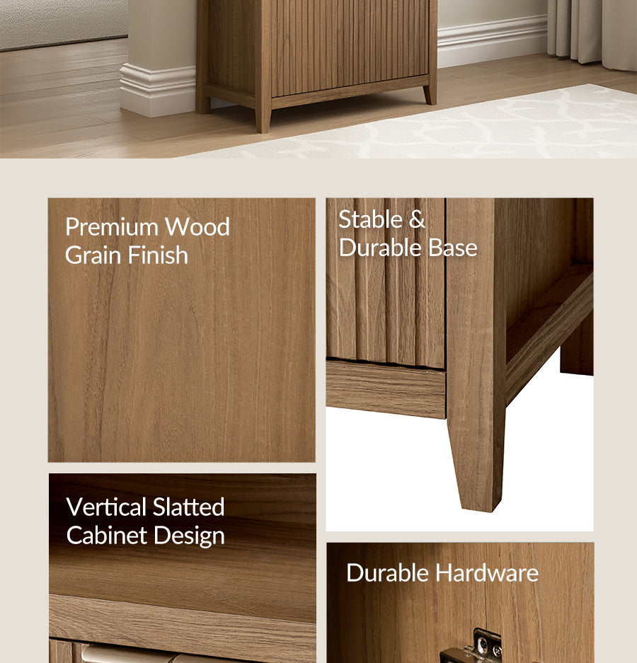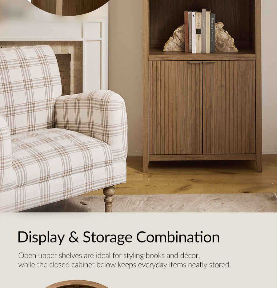 Open upper shelves offer a curated space for displaying books, décor, plants, and personal collections, allowing you to style the shelf with intention. Below, a slatted cabinet front adds textural depth and craftsmanship while keeping everyday items neatly concealed behind closed doors.