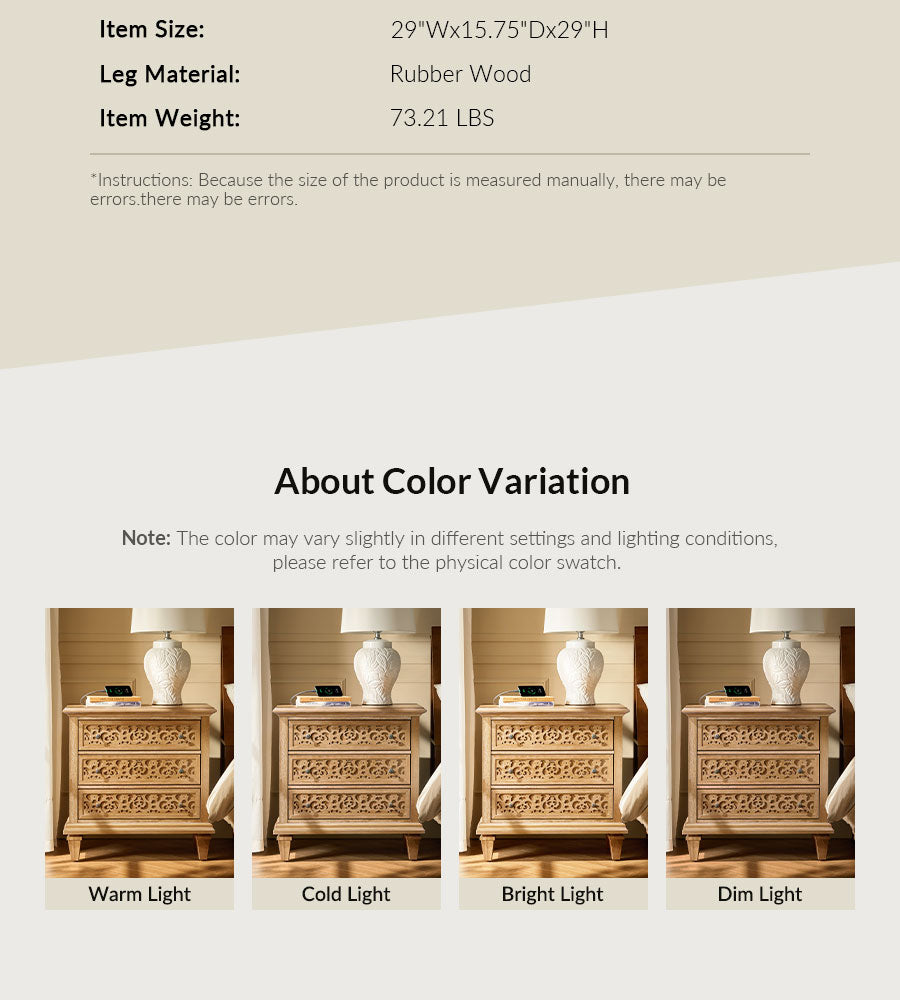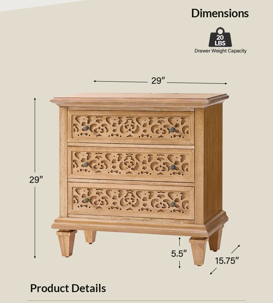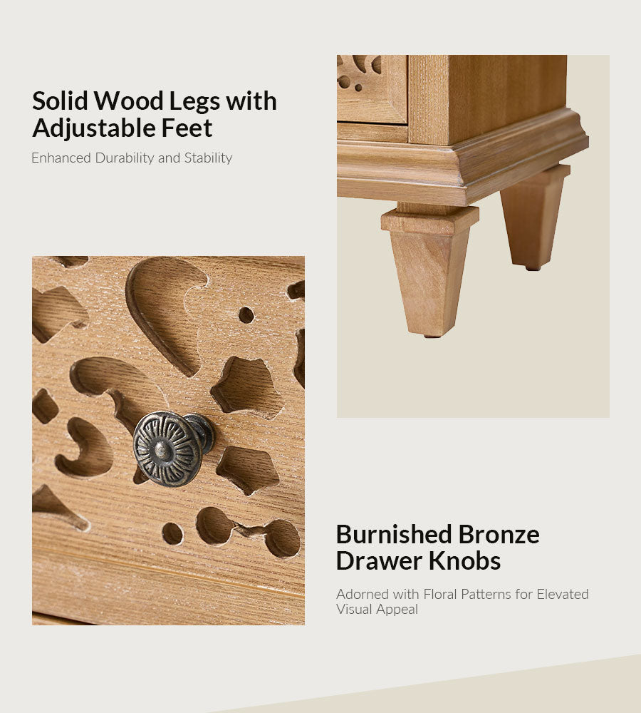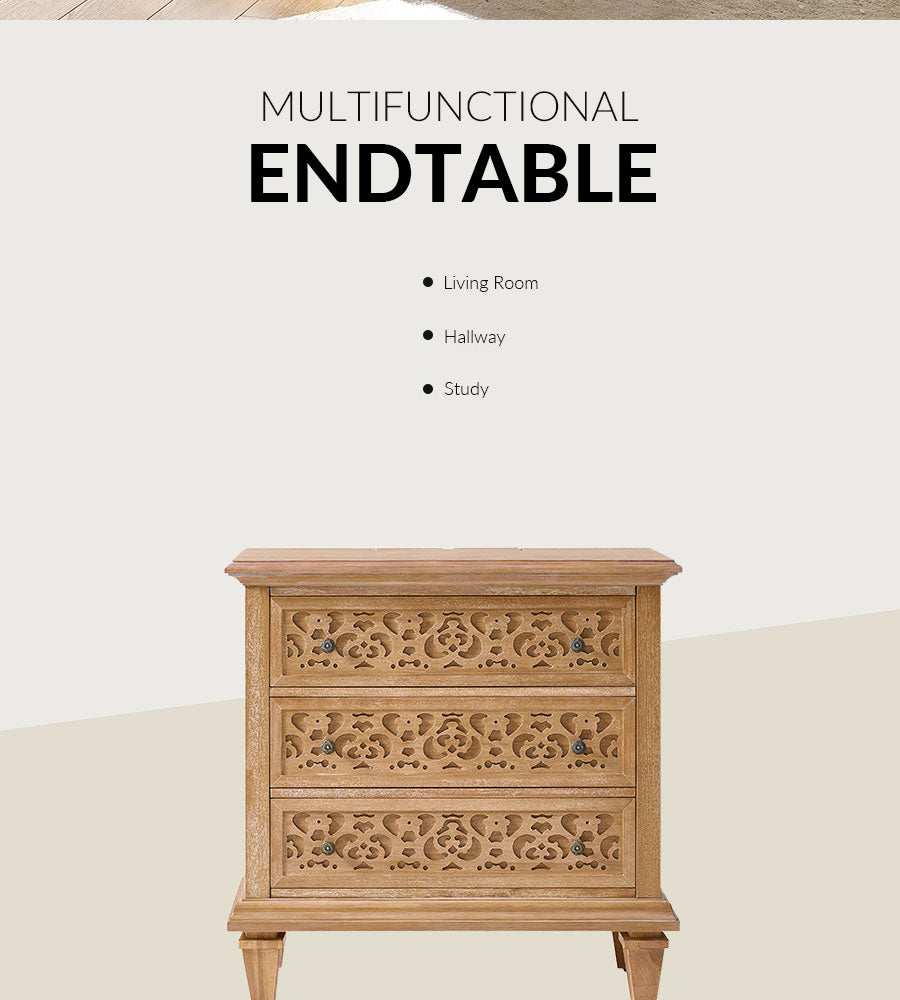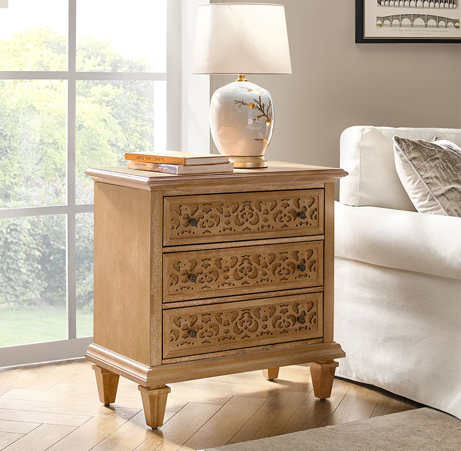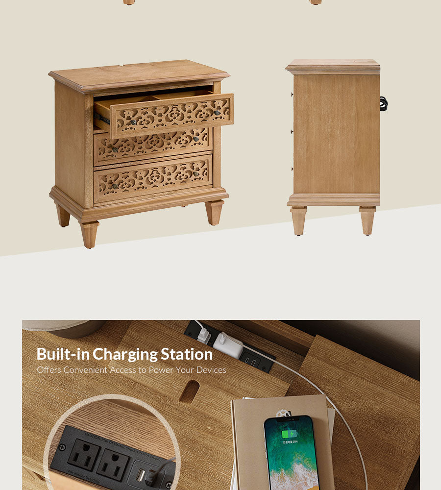 Enhance your space with this transitional end table with power outlets, blending classic design and modern convenience. Featuring elegant fretwork drawer fronts and burnished bronze pulls, this 3-drawer wooden end table adds timeless charm to any bedroom or home office. Built-in charging includes 2 USB ports and 2 AC outlets, making it a perfect bedside table with charging station. Crafted with solid wood legs and adjustable feet, it ensures stability and durability. Spacious drawers with smooth glides offer organized storage, making this a stylish and functional end table for bedroom storage.