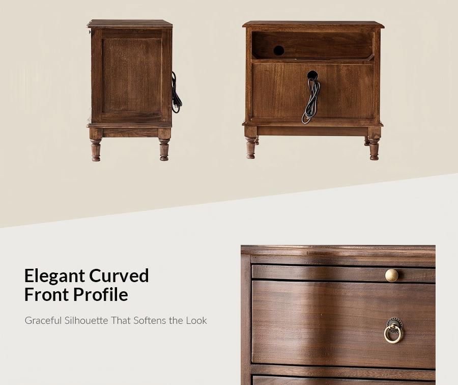 No Crafted entirely from solid wood, this traditional style 2-drawer end table features a gracefully curved front profile that adds a touch of elegance. The antique brass handles provide a vintage charm, enhancing traditional appeal. A standout feature is the pull-out shelf, offering an additional surface for placing nighttime essentials like a book or a cup of tea, adding convenience without compromising on style. Equipped with integrated power outlets and USB ports, it caters to modern needs by allowing easy charging of devices, ensuring your gadgets are always within reach and ready to use. The two spacious drawers provide ample storage for personal items, helping to keep your living room organized and clutter-free. Whether placed beside your sofa or used as an accent piece, the end table offers both functionality and style, enhancing the overall ambiance of your living space.