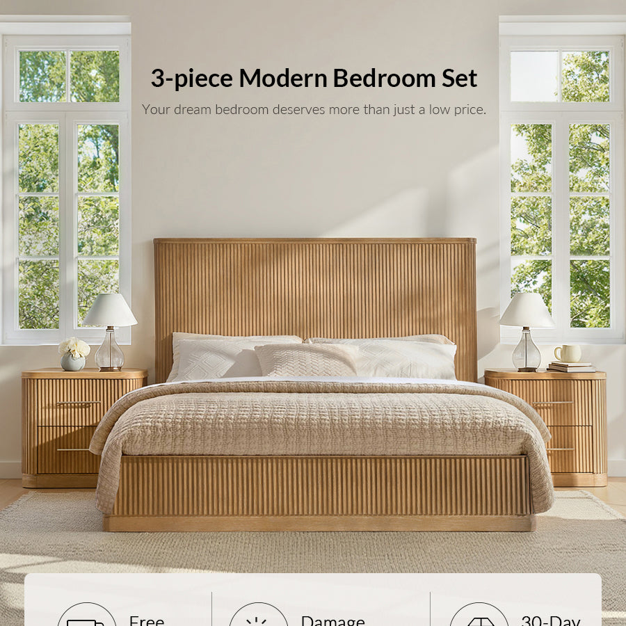 Bring refined warmth and everyday functionality to your bedroom with the HULALA HOME Fluted 3-Piece Solid Wood Bedroom Set. Thoughtfully designed for modern American homes, this set includes a fluted solid wood platform bed and two USB-equipped nightstands — blending timeless craftsmanship with today’s convenience.