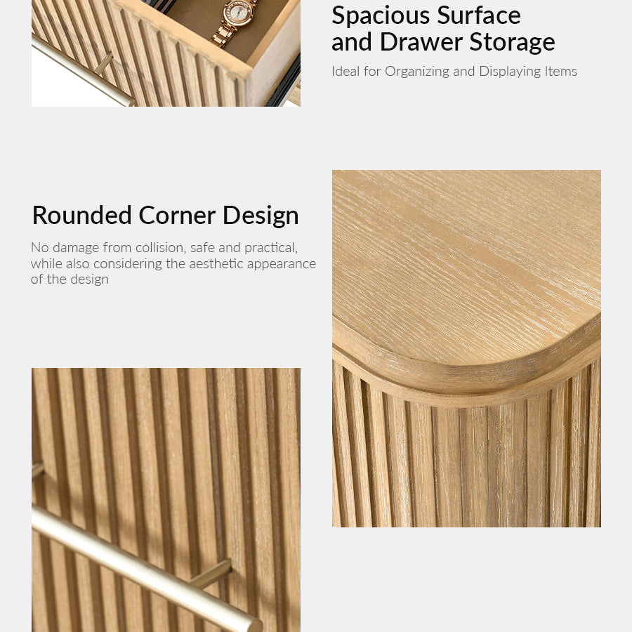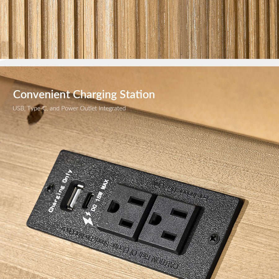 Each nightstand features charging ports, ensuring effortless bedside convenience while keeping cords out of sight. Smooth metal handles and fluted drawer fronts complete the modern yet timeless aesthetic, designed to blend seamlessly with rustic, transitional, or contemporary interiors.