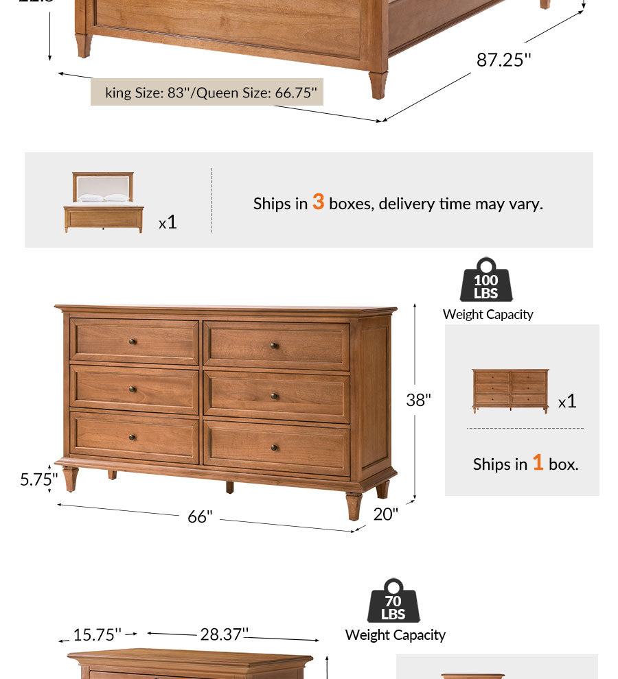 Thoughtful Storage Solutions: The six-drawer dresser offers generous, well-proportioned storage, while the nightstands provide practical layouts that keep bedside essentials organized without sacrificing visual balance.