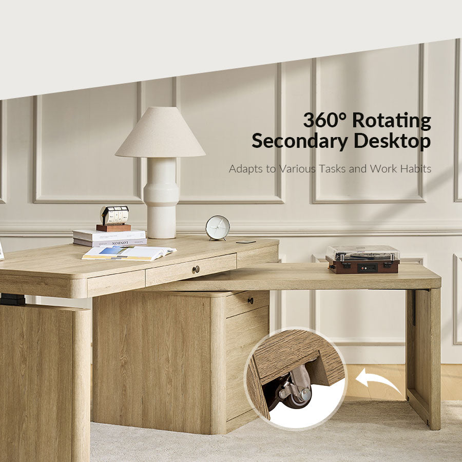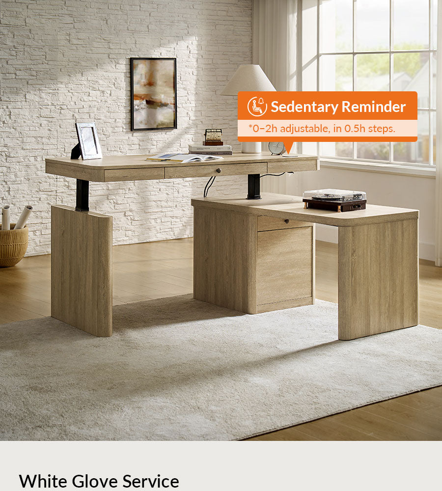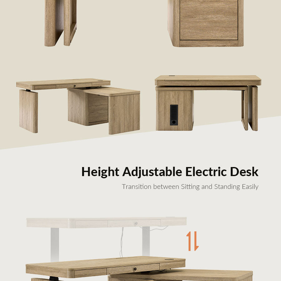 Upgrade your home office with this mid-century modern electric L-shaped desk, designed for maximum versatility, comfort, and organization. The main desktop features a smooth electric height-adjustable mechanism, allowing effortless transitions between sitting and standing—helping improve posture, focus, and productivity throughout the workday.