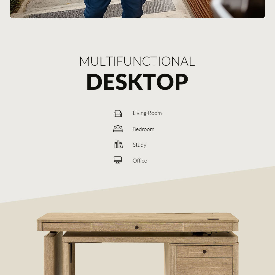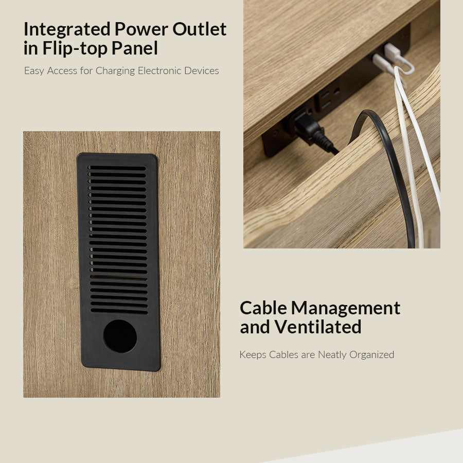 The desk includes two functional drawers beneath the main surface for convenient storage. The right drawer features a decorative faux front, cleverly concealing additional space while maintaining a cohesive design. A flip-top power panel integrates outlets and USB ports, offering easy access to power while keeping cables neatly organized for a clean, professional look.