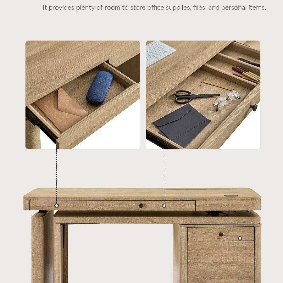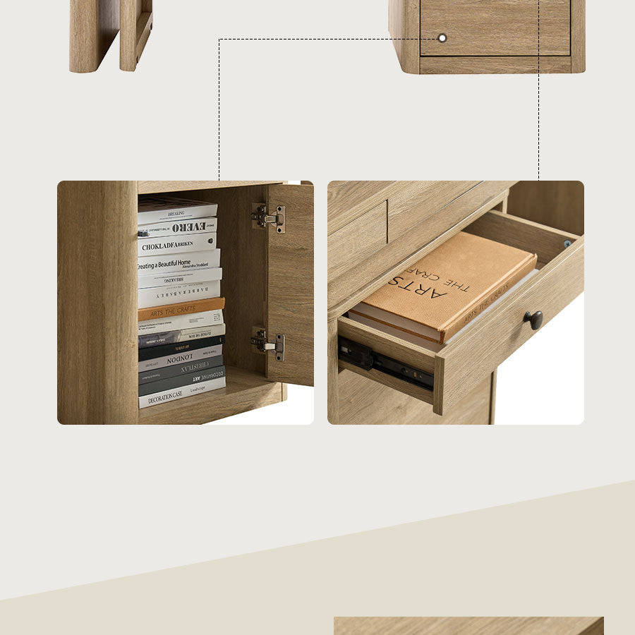 Additional storage is provided by the side cabinet, which combines drawers and a door-enclosed compartment—perfect for stowing office supplies, files, or larger items close at hand but out of sight.