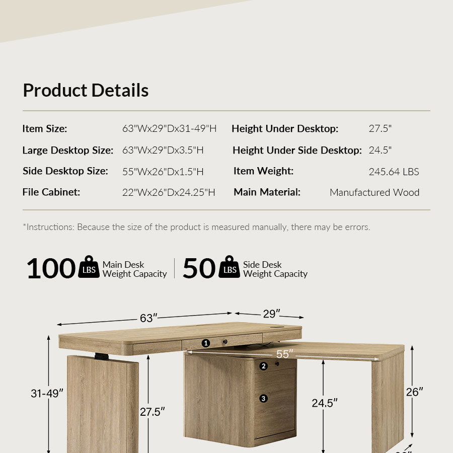 Item Size: 63''W x 29''D x 31-49''H Large Desktop Size: 63''W x 29''D x 3.5''H Height Under Desktop: 27.5''H Side Desktop Size: 55''W x 26''D x 26''H Height Under Side Desktop: 24.5''H File Cabinet: 22''W x 26''D x 24.25''H Main Desktop Weight Capacity: 100 lbs