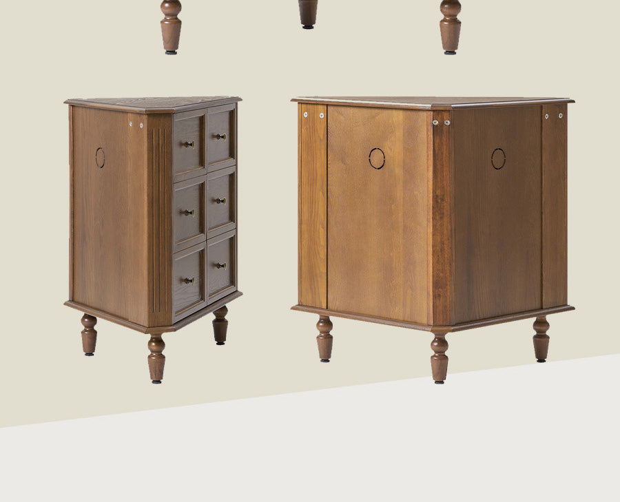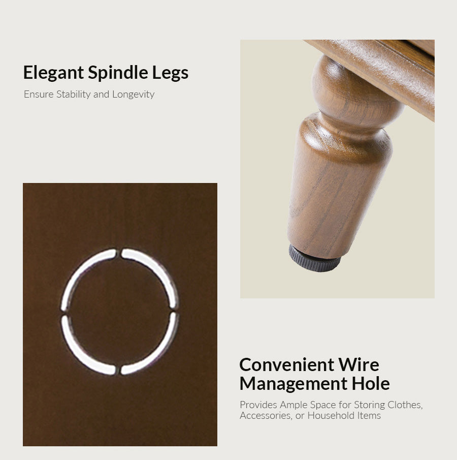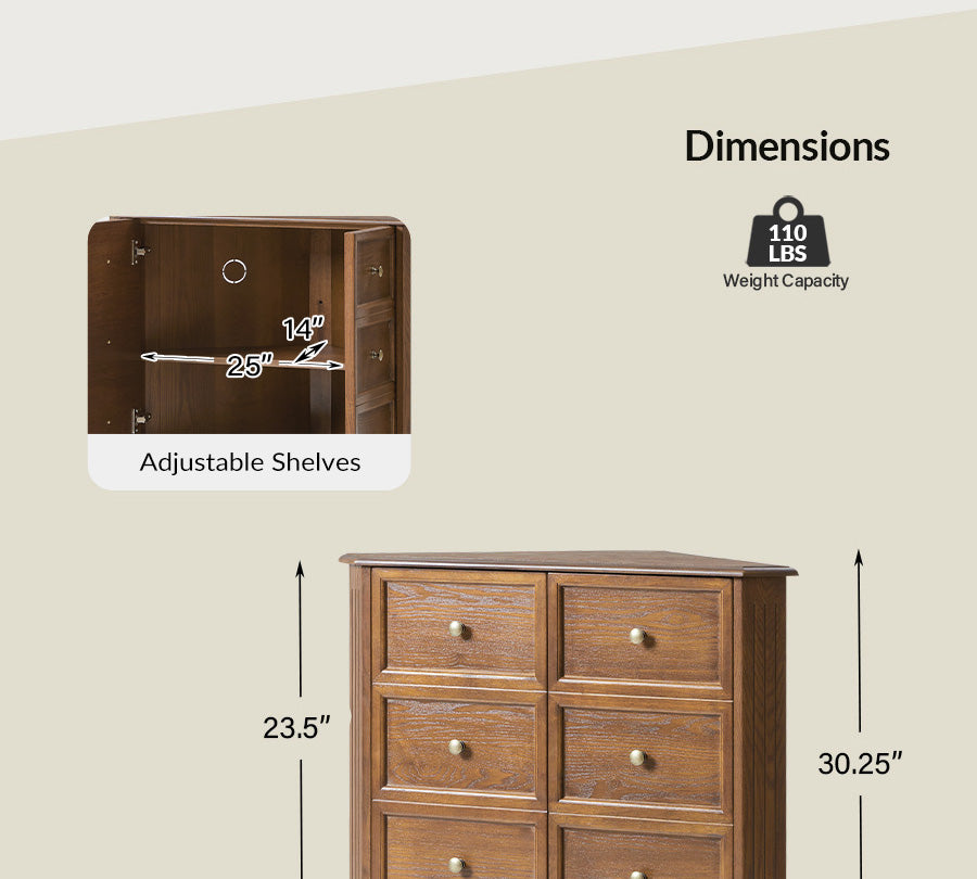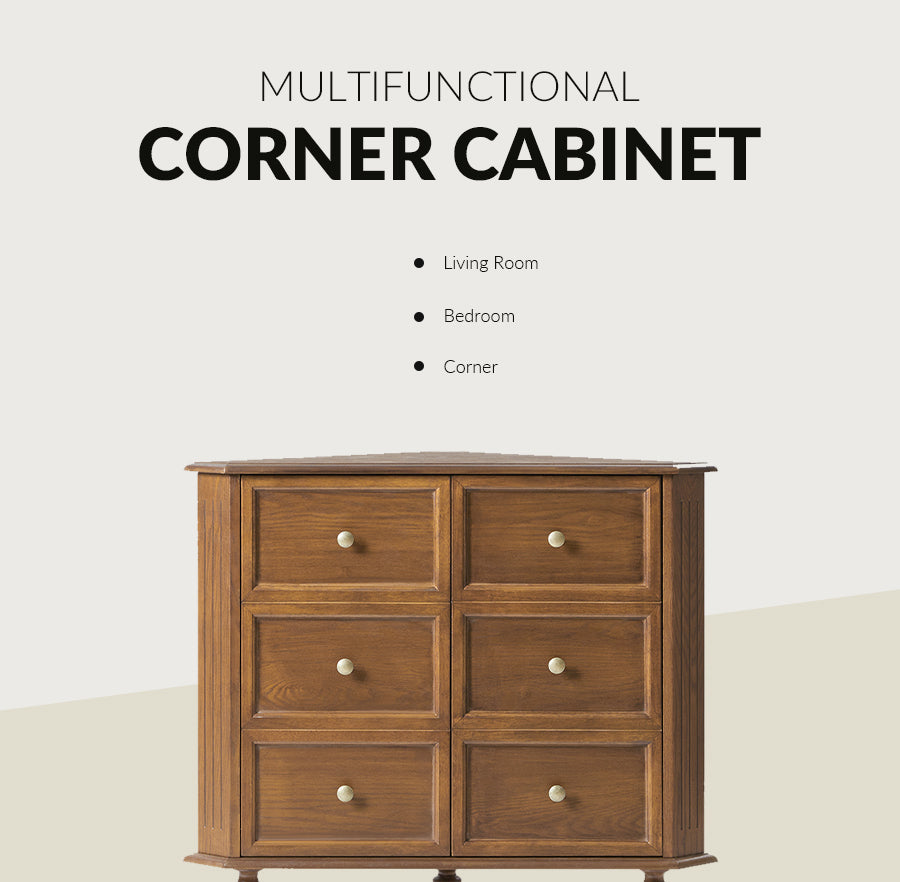This corner cabinet seamlessly blends traditional charm with transitional versatility, making it a timeless addition to any home. Its classic double-door design mimics the appearance of six drawers, offering ample storage space while maintaining a sophisticated façade. The cabinet features grooved panel detailing for added texture and character, complemented by elegant spindle legs that exude refinement. Thoughtfully designed with a wire management hole, it ensures a clean and organized look, perfect for housing electronics or decorative pieces. Whether enhancing a cozy living room corner or adding functionality to an entryway, this graceful craftsmanship and multifunctional design make it a fit for both classic and modern interiors.