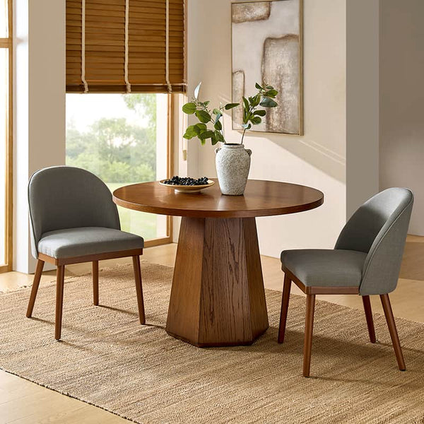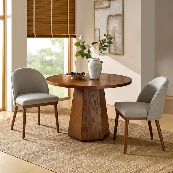 This modern dining chair features a flowing, elegant silhouette. The combination of wooden legs, metal armrests, and fabric seat creates a sophisticated yet comfortable feel. With its slightly flared legs...