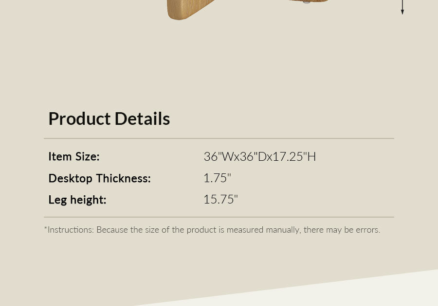 Product Details Tabletop Weight Capacity: 100 LBS Overall Item Weight: 41.89 LBS Weights & Dimensions Item Size: 36"Wx36"Dx17.25"H Leg height: 15.75" Instructions: Because the size of the product is measured manually, there may be errors.