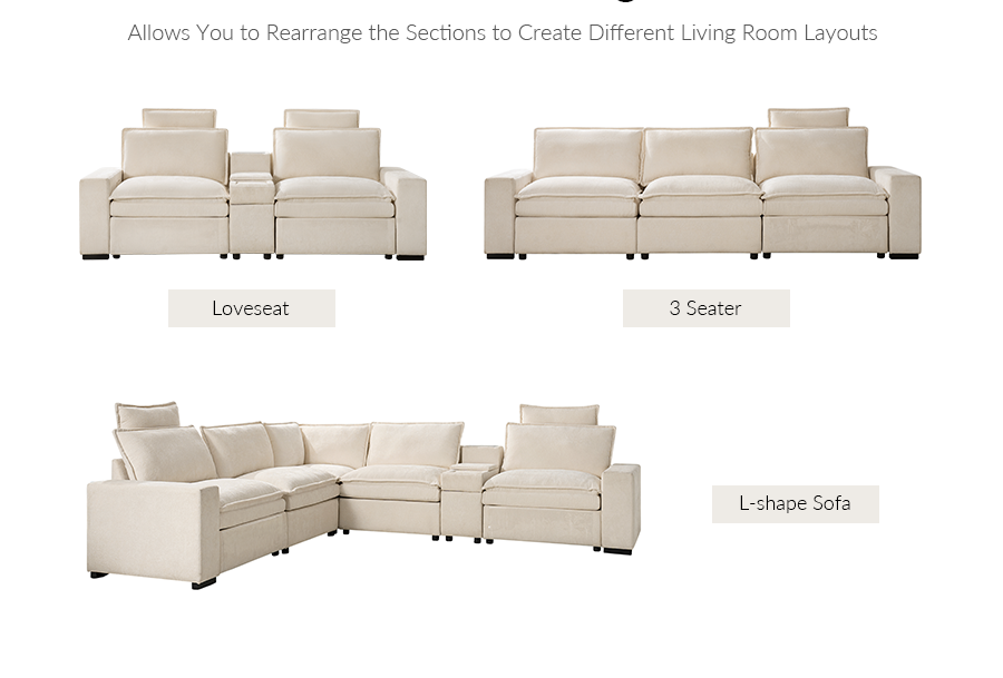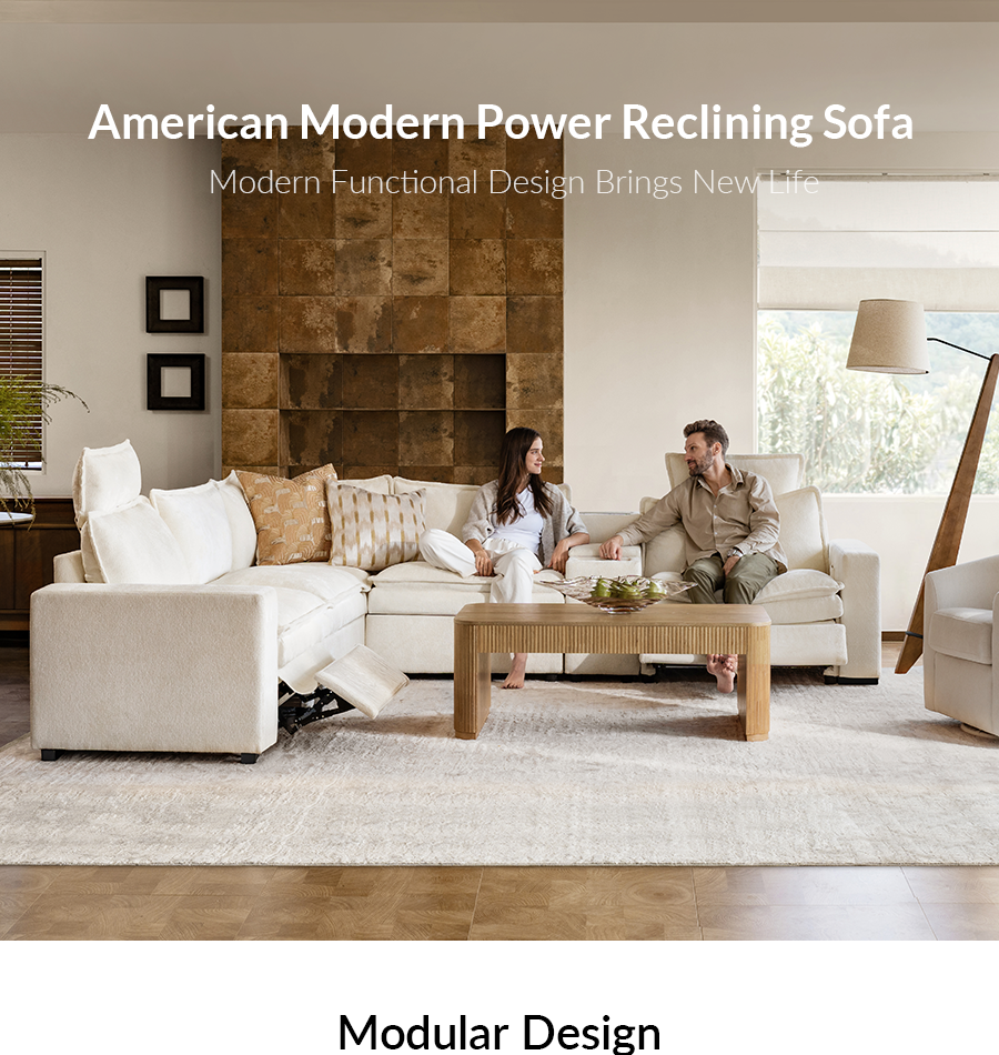 This American modern living room set seamlessly combines comfort, functionality, and a coordinated design. The modular sofa features 1.5 times extra-wide seating, electric reclining with an adjustable backrest and headrest, and a protective dust cover on the footrest for relaxed daily use. A center console offers cup holders, a flip-top power outlet, wireless charging, and two drawers to keep essentials within reach. Tool-free assembly makes setup simple. The matching lift-top coffee table echoes the slatted design with a natural wood veneer and scratch-resistant eco finish. Its height-adjustable top shifts easily from coffee to dining use, while three soft-close drawers and battery-powered operation allow flexible placement without outlet limits.