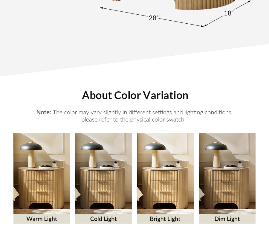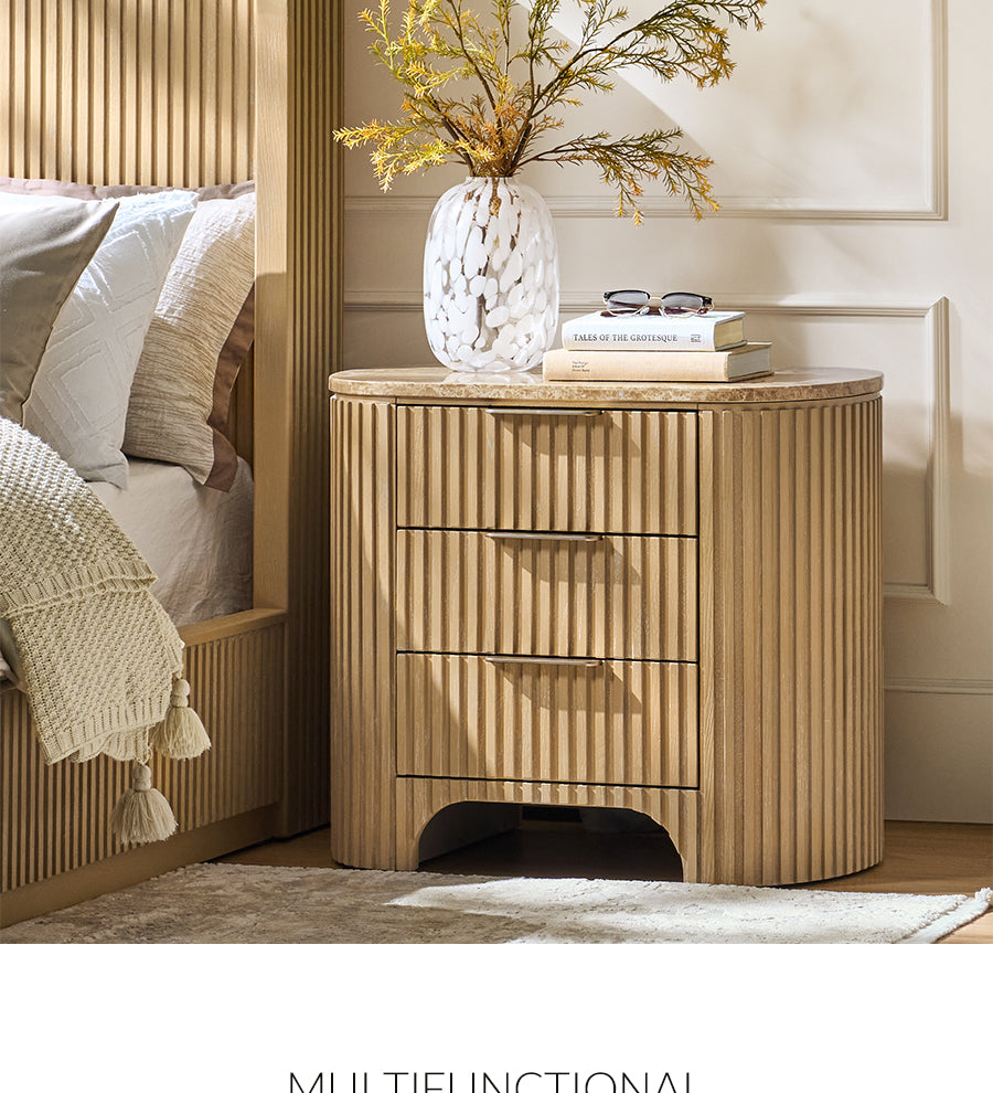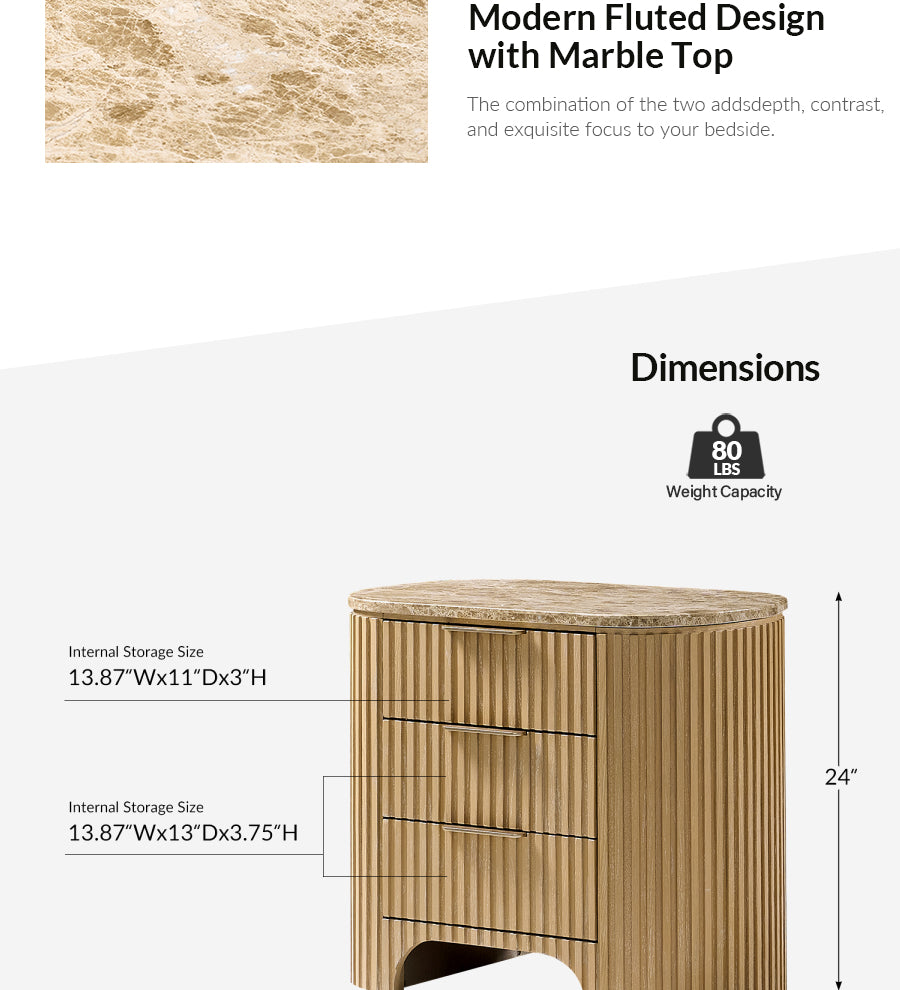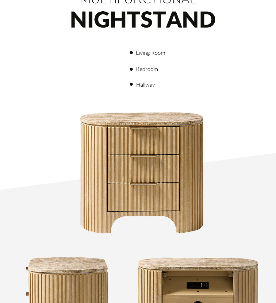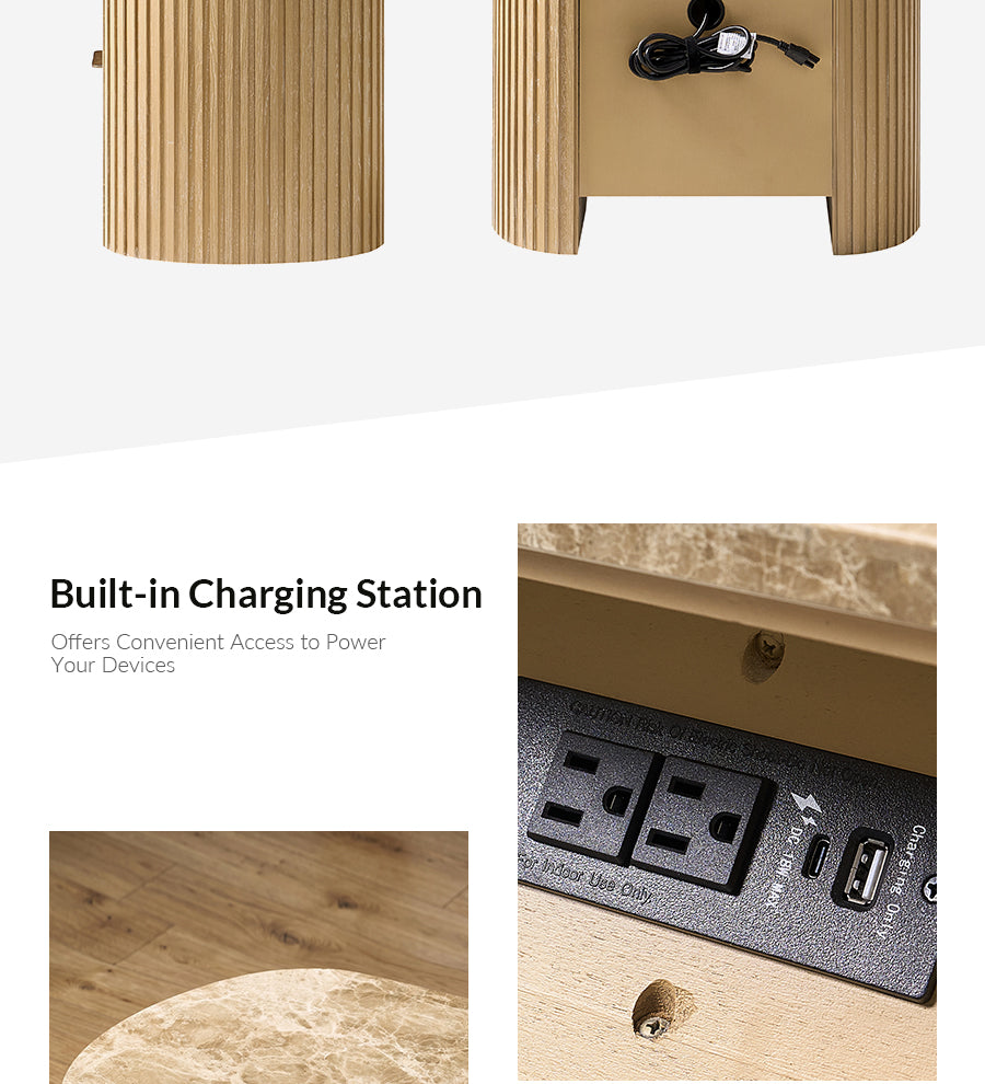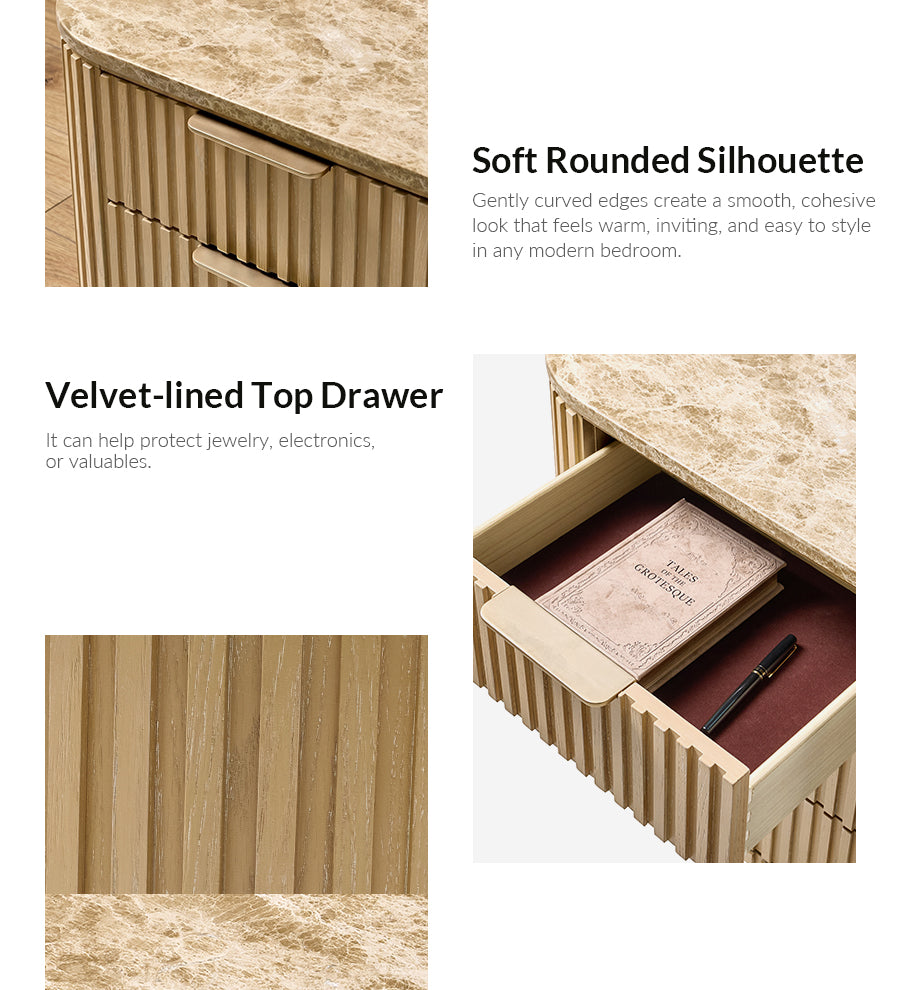 Upgrade your bedside with a nightstand that blends modern design and everyday functionality. Featuring elegant fluted detailing and a natural marble top, this piece adds texture and visual interest while bringing a refined touch to your space. The softly rounded silhouette creates a smooth, inviting look that pairs effortlessly with a variety of bedroom styles. Designed for convenience, it comes equipped with built-in charging options, including standard outlets, USB, and Type-C ports—keeping your devices powered and within reach. Three spacious drawers provide organized storage, with a velvet-lined top drawer ideal for protecting delicate items. Each drawer is fitted with smooth self-closing glides for a quiet, seamless experience. Finished with sleek metal handles and delivered fully assembled, this nightstand is ready to elevate your bedroom from day one.