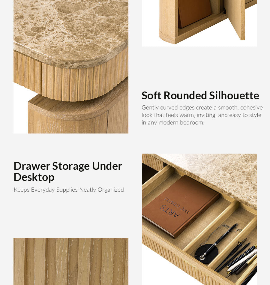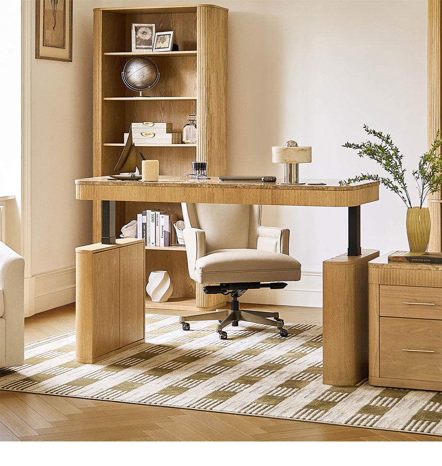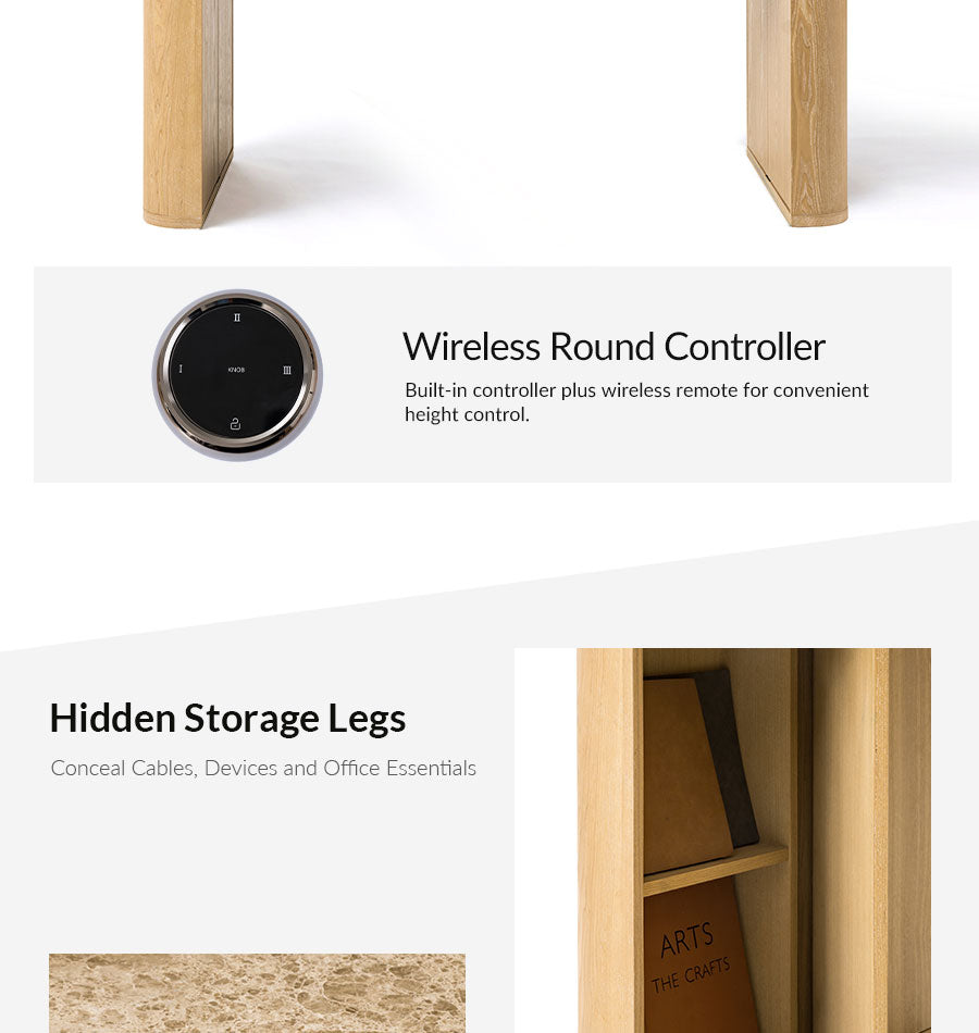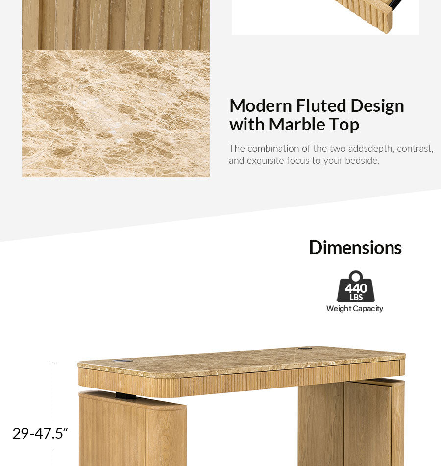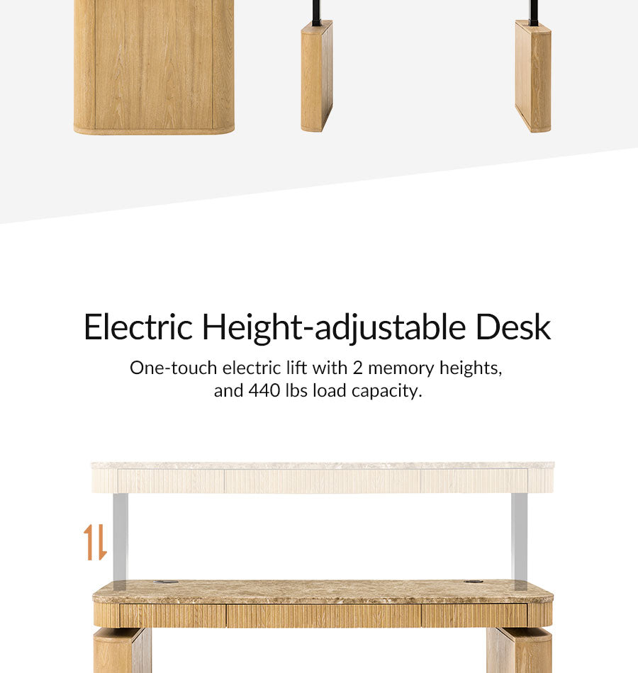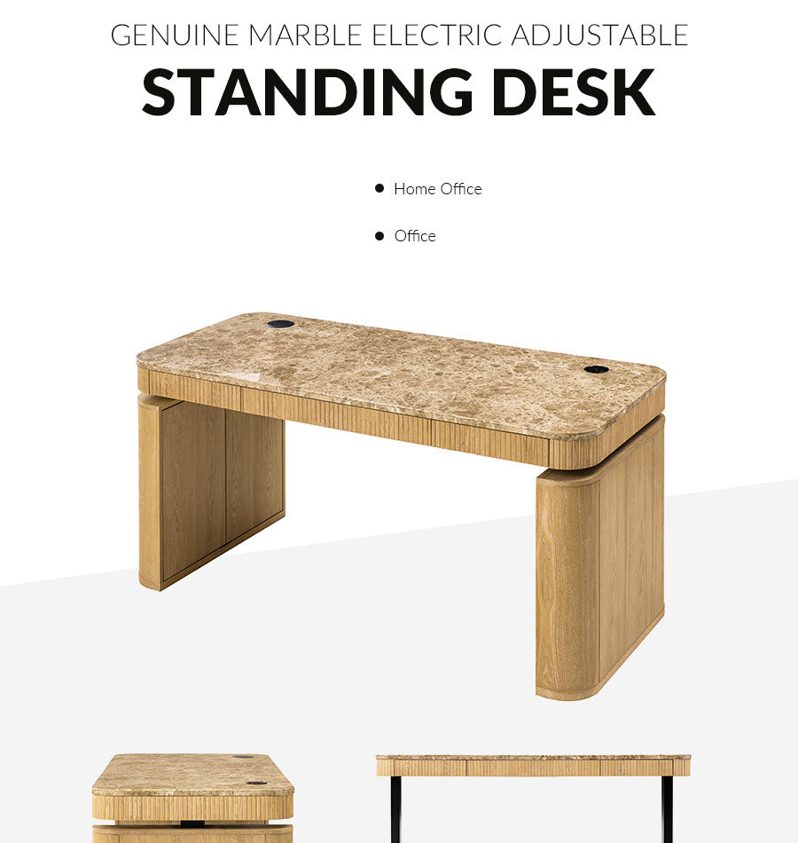 Create a workspace that feels as polished as it is practical. This electric height-adjustable desk pairs a genuine natural marble desktop with smooth sit-stand control, making it easy to change posture during long workdays. The round wireless controller keeps the desktop clean while letting you adjust the height freely. With a stable industrial-grade lift system and 440 lbs weight capacity, it comfortably supports monitors, computers and daily office essentials. Hidden storage inside the side legs helps keep cables and larger items out of sight, while drawers under the desktop keep documents and stationery close at hand. Finished with fluted wood veneer detailing and the natural durability of marble, this desk brings a refined executive look to a modern home office.
