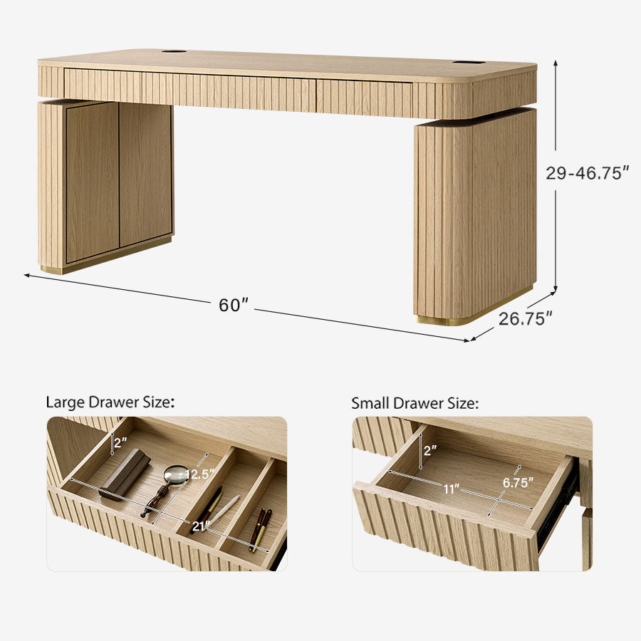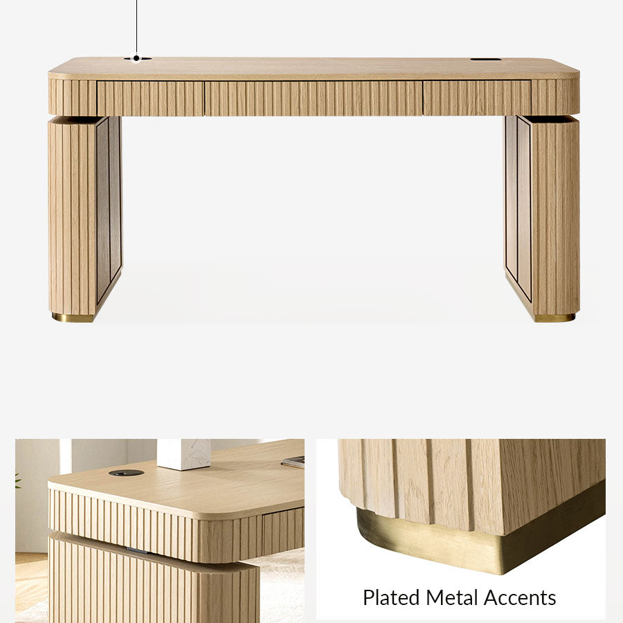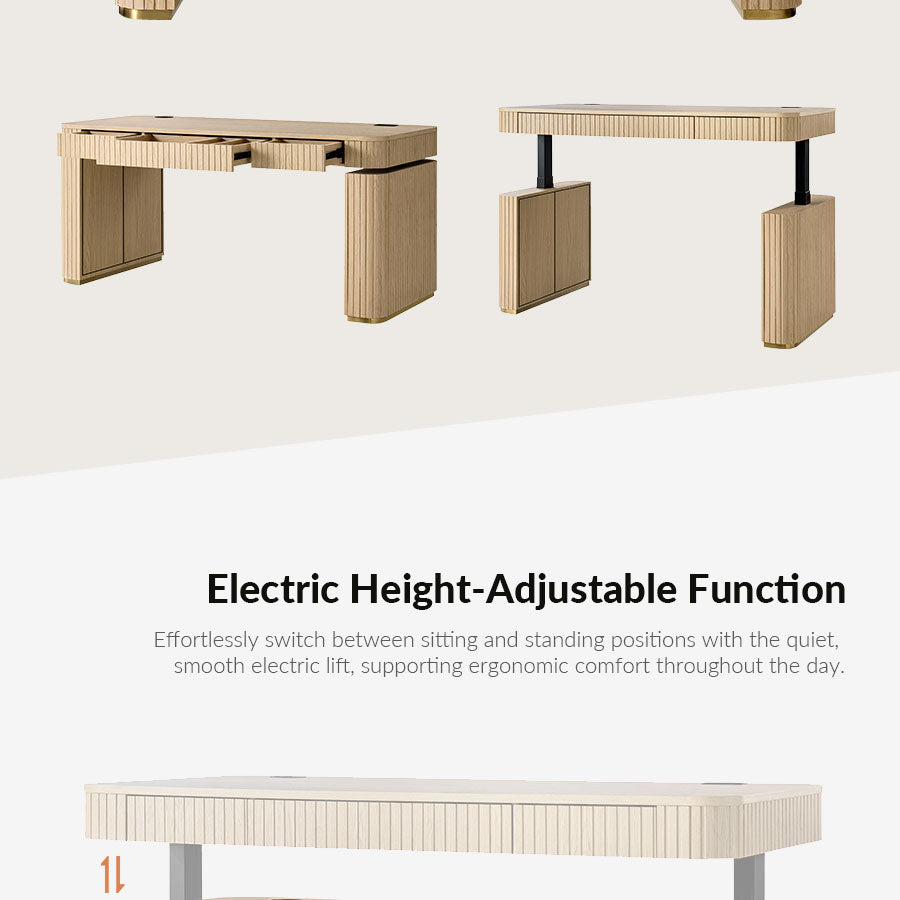 Upgrade your workspace with this modern electric height-adjustable desk, designed to bring contemporary style and ergonomic comfort to your home office. Clean lines and vertical fluted detailing give the desk a sophisticated, architectural look, while the subtle plated metal base adds a refined modern touch that complements a variety of interior styles.