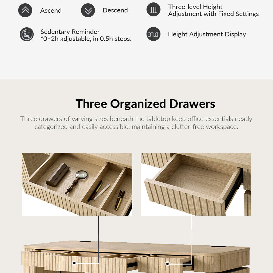 Equipped with three built-in drawers of different sizes, the desk offers practical storage for stationery, notebooks, electronics, and daily essentials, keeping your workspace organized and clutter-free. A dedicated cable management system ensures wires stay neatly concealed, maintaining a clean and professional setup.