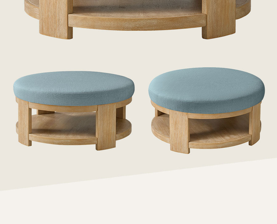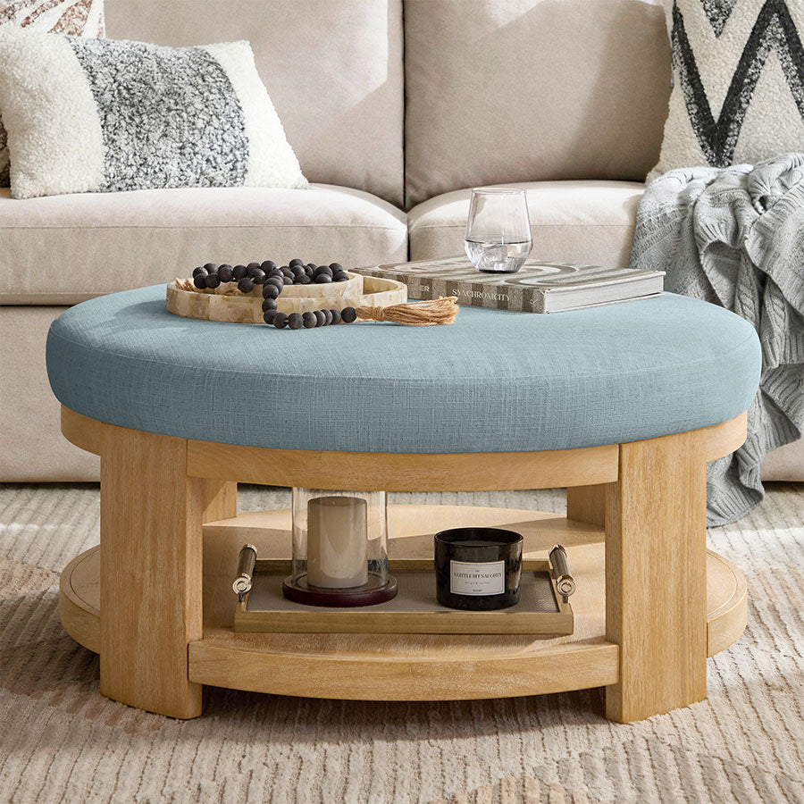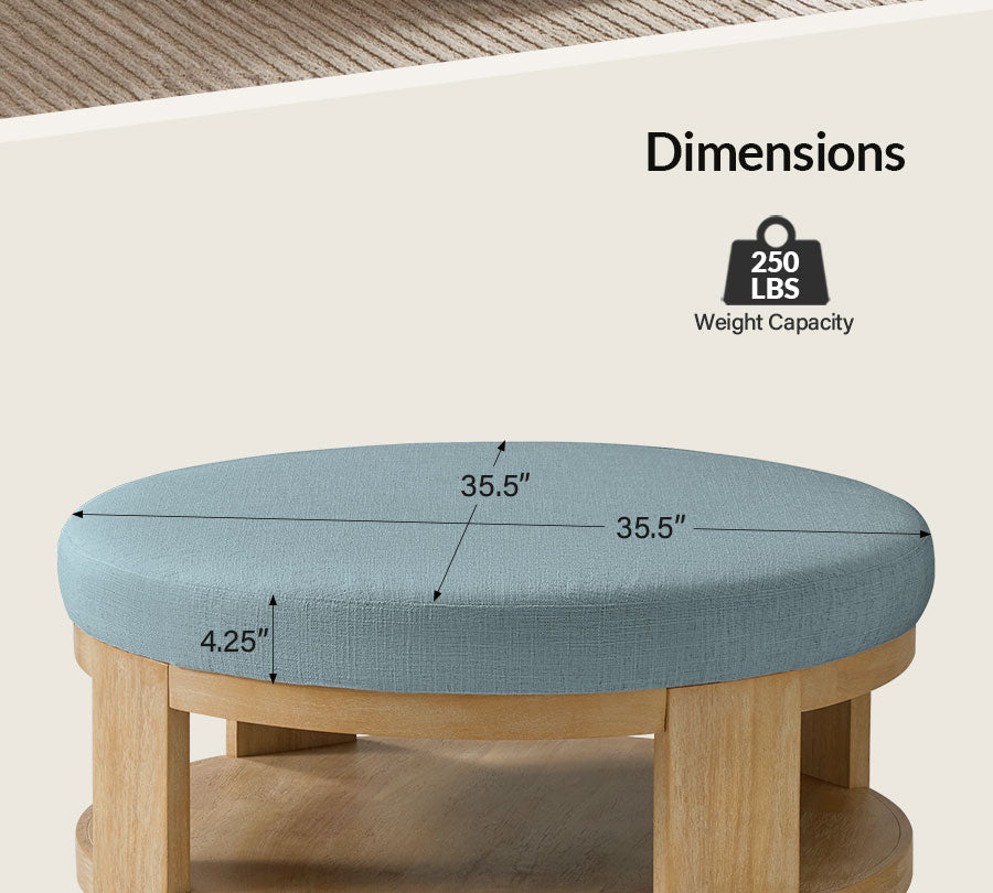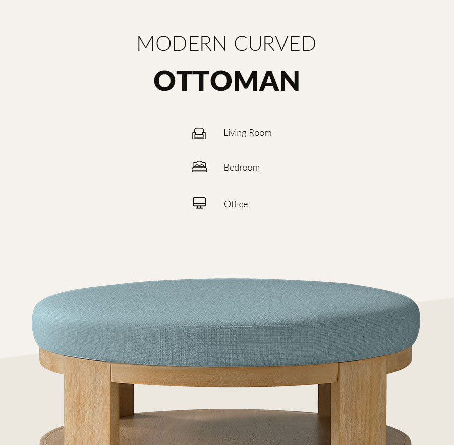 Bring modern versatility to your living space with this round ottoman designed for comfort, function, and style. Wrapped in soft linen fabric and supported by a sturdy, solid-wood base, it features a smooth, rounded silhouette that blends easily with contemporary décor. The cushioned top offers a comfortable spot to rest your feet or sit, while the lower shelf provides convenient storage for books, blankets, or everyday essentials. It can also double as a small coffee table—perfect for holding trays, décor, or snacks during gatherings. With a straightforward assembly that takes about 10 minutes, this multifunctional ottoman is an effortless way to elevate both style and usability in your home.