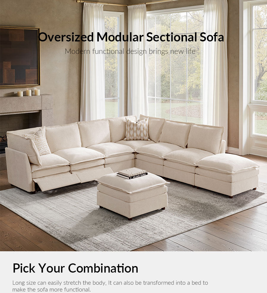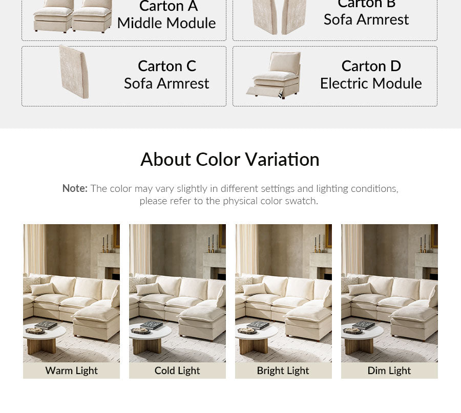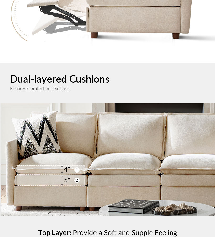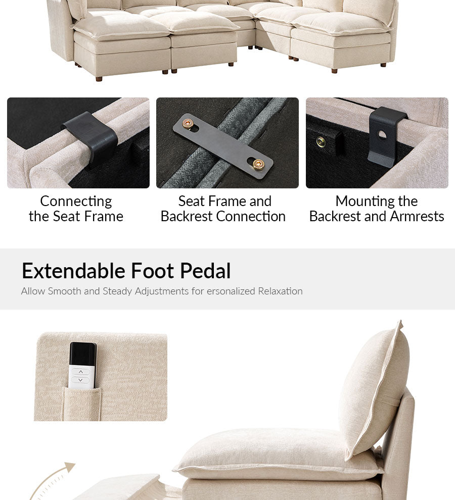 - Product Including: One sofa, assembly is required. - 1.5x Extra-wide Seat: The sofa features seats that are 1.5 times wider than standard, providing ample space and comfort, specifically designed for larger individuals and expansive living areas. - Double-Layer Cushion: The sofa features a double-layer cushion design that enhances softness and support, delivering exceptional comfort for extended sitting or lounging. - Concealed Compartments: Located under the seats, these hidden storage spaces are ideal for reducing living room clutter by providing a place to store everyday items such as blankets, pillows, and magazines, ensuring they are easily accessible. - Modular Design: Each section of the sofa can be rearranged to fit different room layouts and personal preferences, allowing you to create a customized seating arrangement that suits your living space. Electric Reclining Comfort: - Designed with a single motor, this recliner lifts the footrest and features a fixed backrest for comfortable support; offering customizable comfort and effortless relaxation for a tailored seating experience.