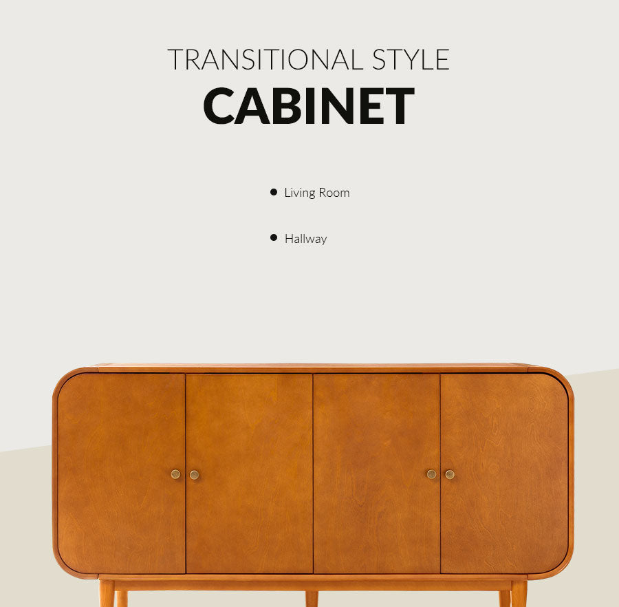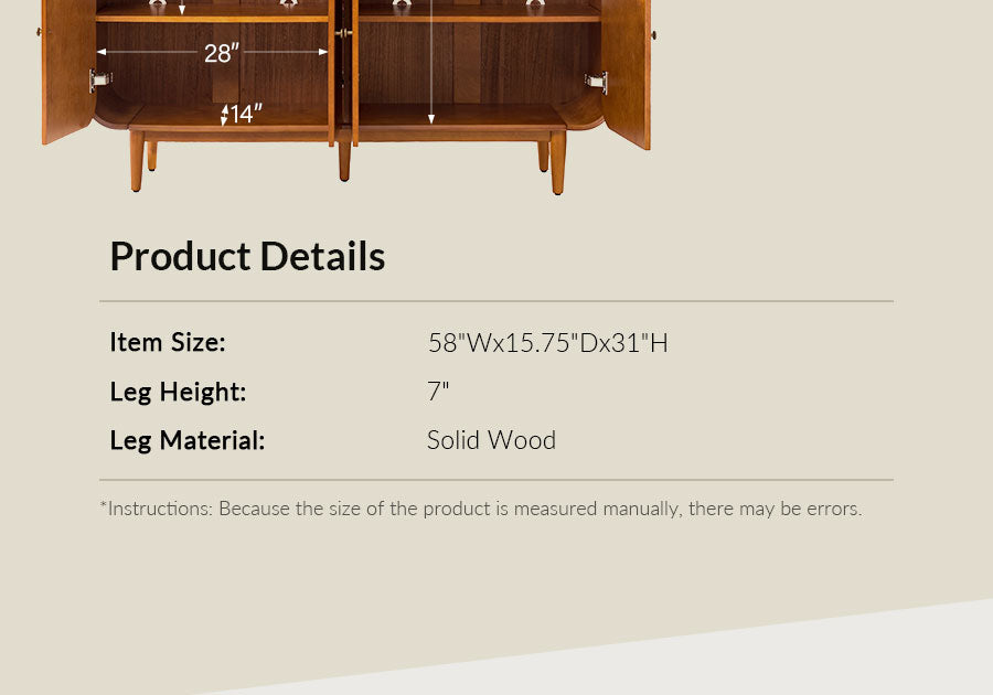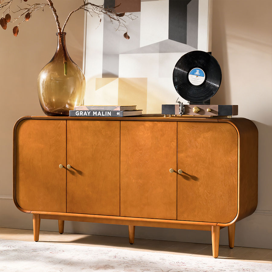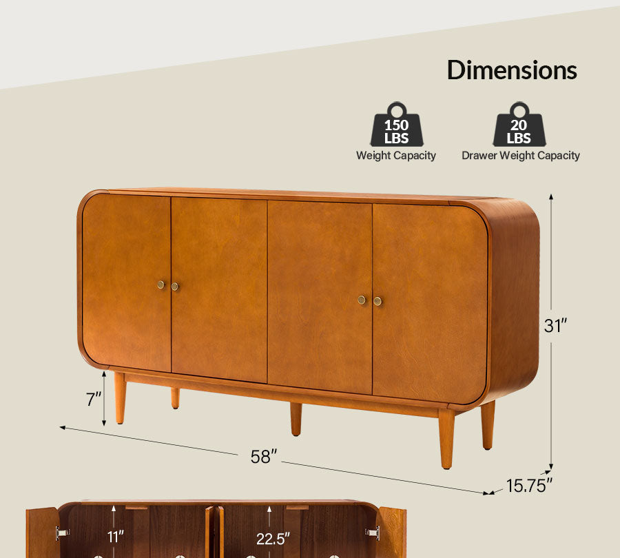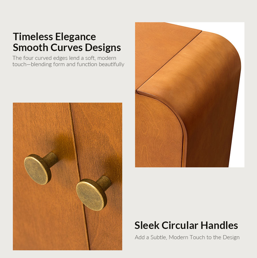 The mid-century modern sideboard's gracefully curved design introduces a soft, organic silhouette that contrasts beautifully with the clean lines characteristic of mid-century design. The round metal handles provide a subtle yet sophisticated touch. Inside, adjustable shelves offer customizable storage solutions, allowing you to accommodate items of various sizes with ease. The inclusion of cable management openings ensures that electronic devices can be neatly organized, maintaining a clutter-free appearance. Whether used to store dining essentials, media equipment, or decorative pieces, this sideboard adapts to your needs. Its sturdy construction ensures durability and durability for daily use. Whether placed in a dining area, living room, or hallway, it seamlessly integrates into your space, offering both aesthetic appeal and practical storage.