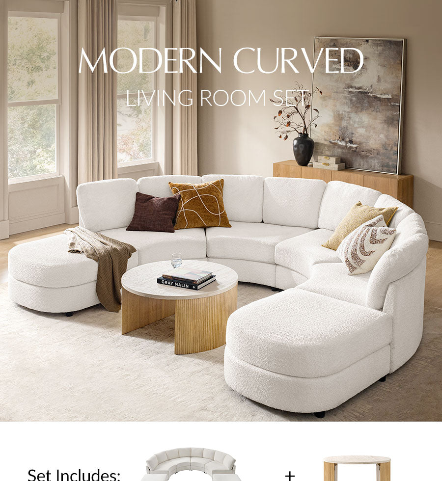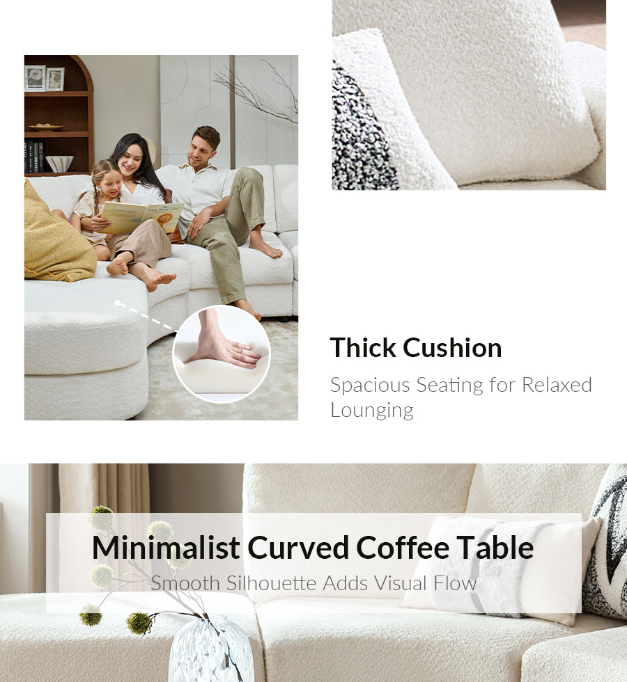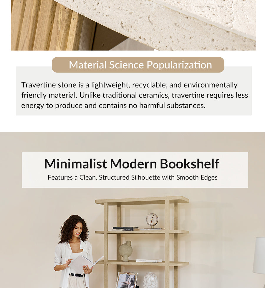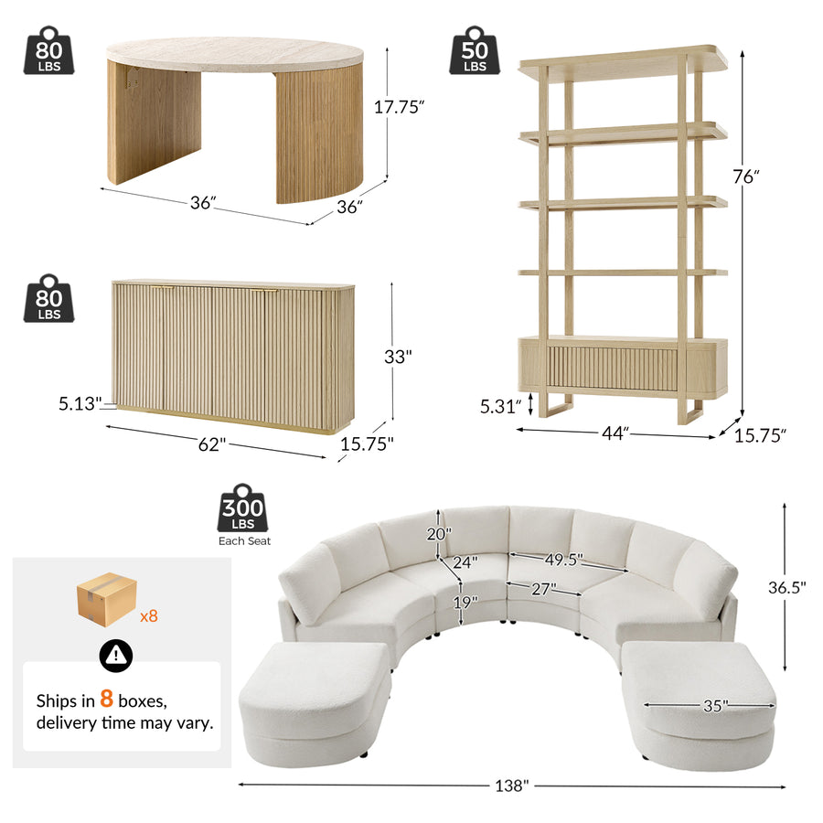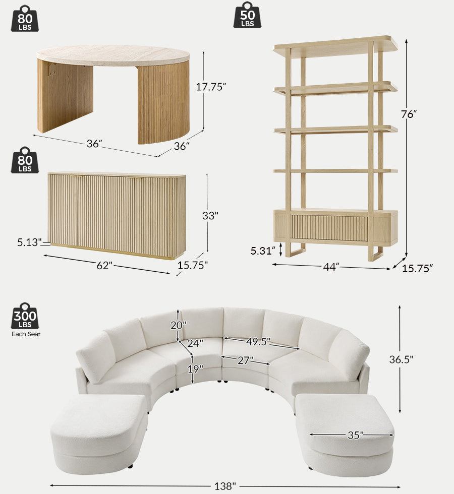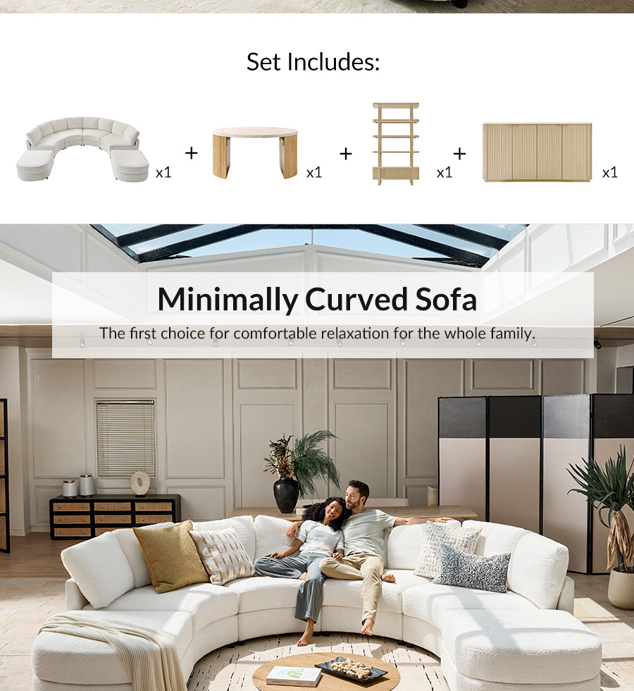 This modern living room collection is designed for flexible layouts and a unified aesthetic across every piece. The modular sofa offers multiple configurations to fit different spaces, with soft cushioning and sculpted curves that blend comfort with a refined contemporary look. The minimalist coffee table features natural stone and wood textures, complementing the sofa’s rounded silhouettes. A clean-lined bookshelf with open shelving and a closed base provides layered storage and display options, while the coordinating sideboard adds generous concealed storage with elegant vertical textures and smooth curves. Together, the collection combines modern forms, natural materials, and thoughtful functionality to create a cohesive and adaptable living space.