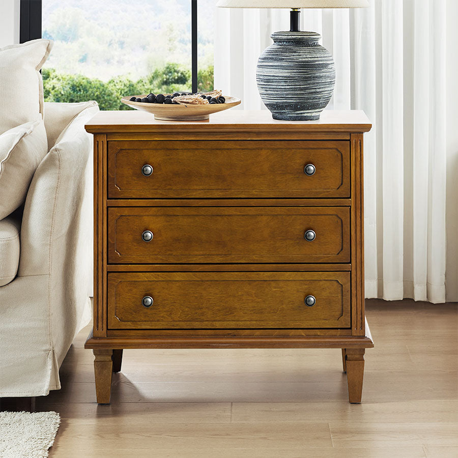 Add elegance and function to your space with this transitional end table set, designed to complement both classic and contemporary interiors. Featuring three spacious drawers, it provides ample storage for your living room essentials. The beautifully sculpted knife-carved details add a touch of artisanal charm, while the solid wood legs ensure lasting durability and stability. A built-in power outlet brings modern convenience right to your bedside or sofa side, perfect for charging devices or plugging in a lamp. Whether used as a living room side table, this piece blends timeless style with practical features, making it a versatile addition to your home decor. Organize, charge, and enhance your space effortlessly with this multifunctional storage end table set.