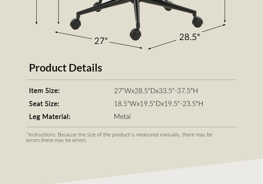 Overall Dimensions: 27" W × 28.5" D × 33.5"–37.5" H (adjustable height) Seat Dimensions: 18.5" W × 19.5" D × 19.5"–23.5" H Backrest Height (from Seat): 15" H Leg Height (Adjustable): 2.5"–4.5" H