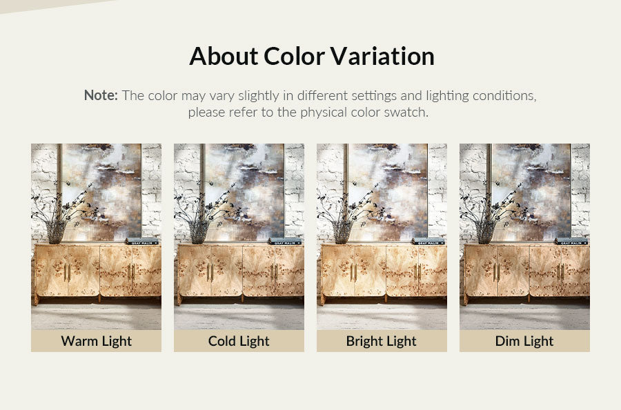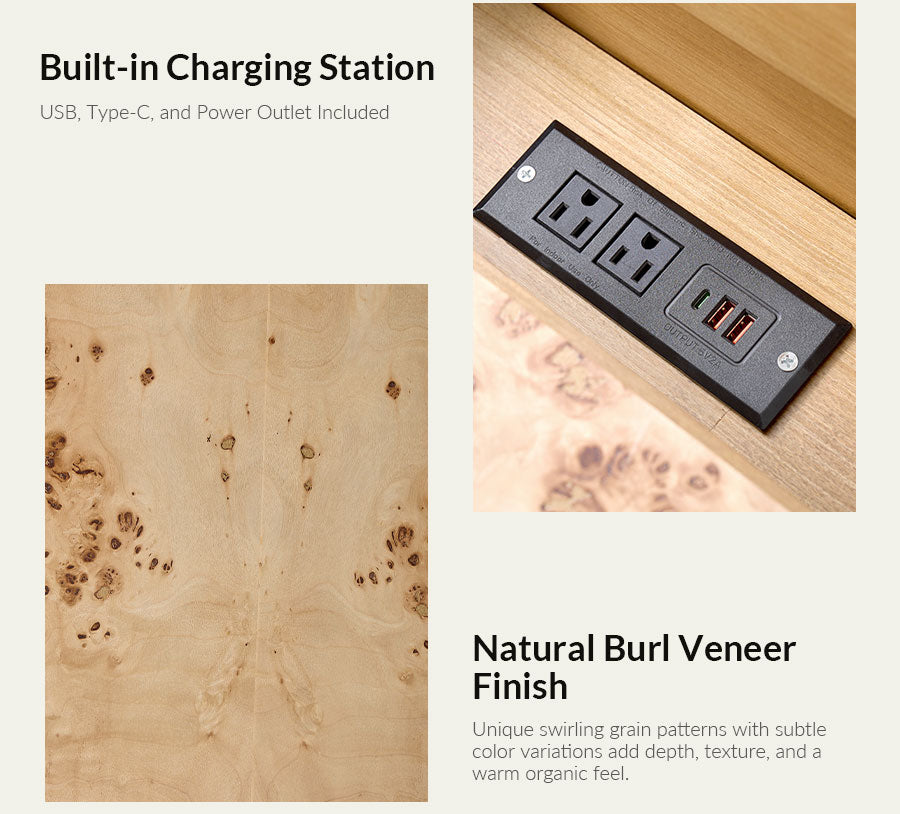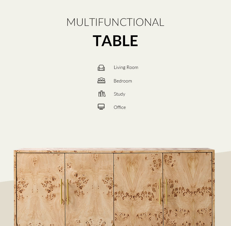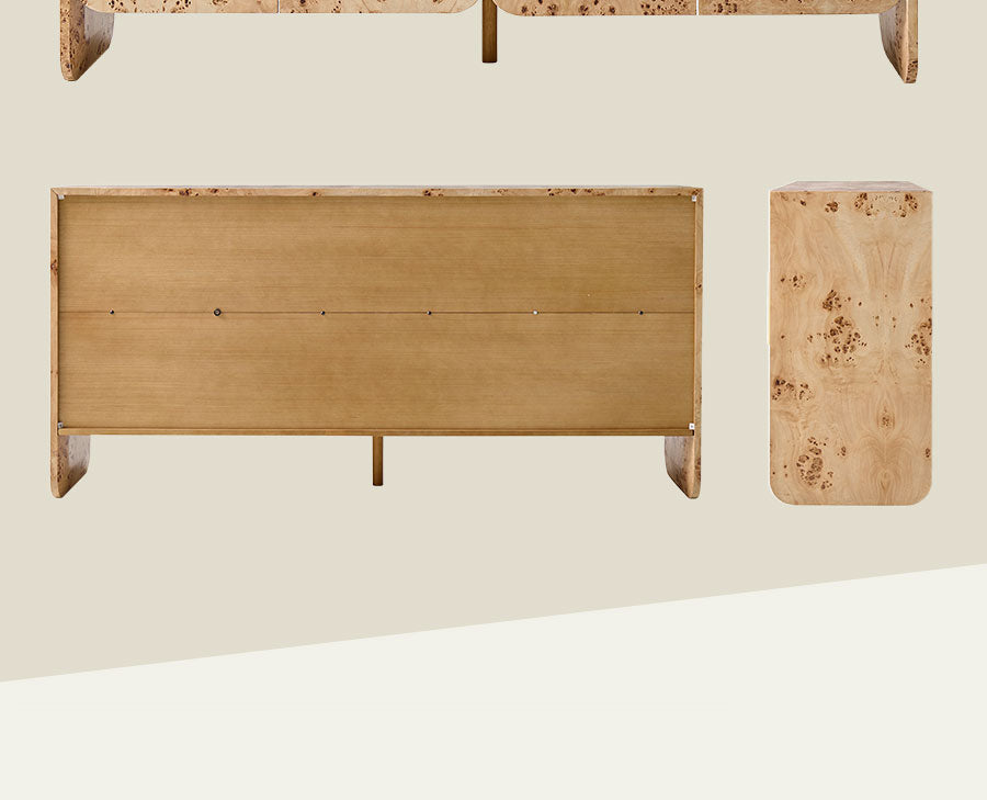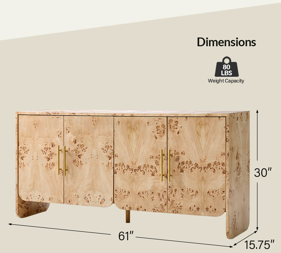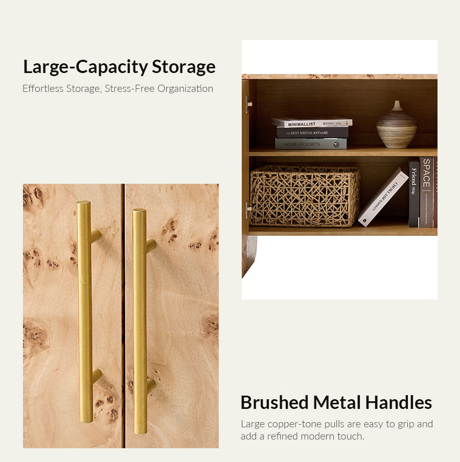 This cabinet features a burl veneer finish that highlights the natural variations and organic patterns of the wood, giving it a unique and inviting look. The clean lines are complemented by softly rounded corners, creating a balanced form that blends easily with different interior styles. A PU protective finish enhances durability and makes daily maintenance effortless. Brushed metal handles in a larger size provide a comfortable grip and add a refined contrast to the warm wood tone. With a simple, easy-to-assemble structure, this cabinet offers practical storage and decorative appeal, making it a versatile addition to living rooms, bedrooms, or entryways.